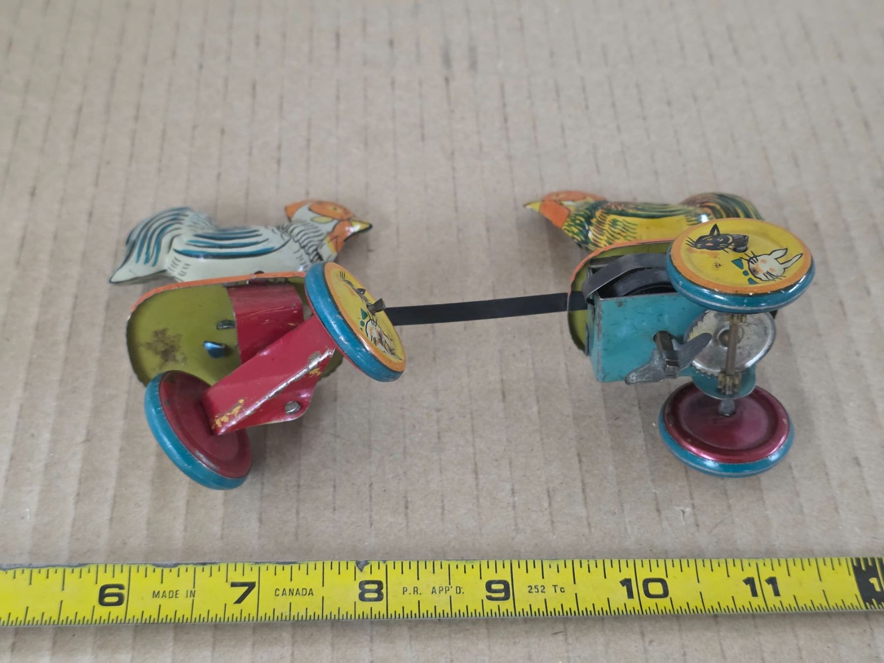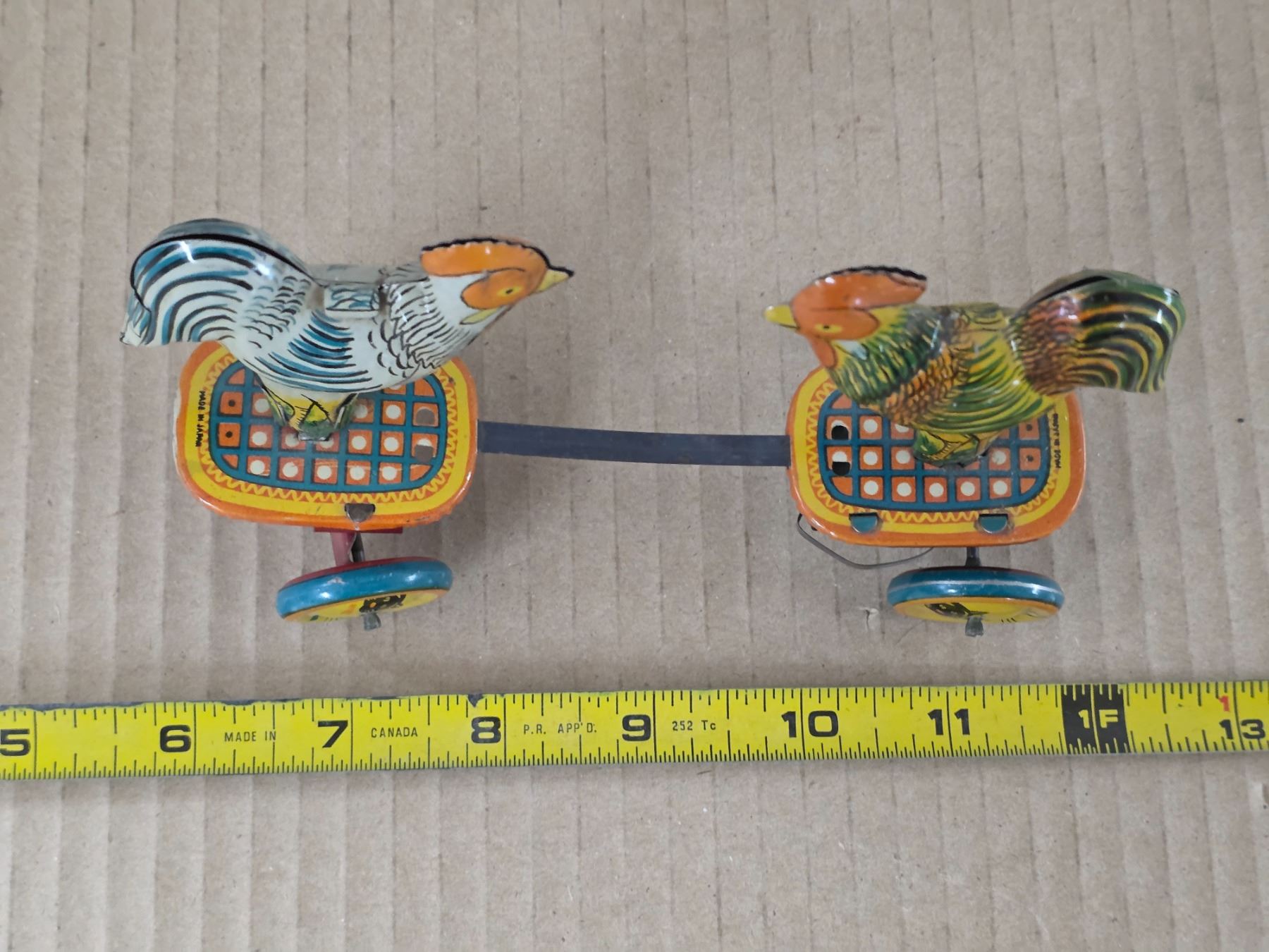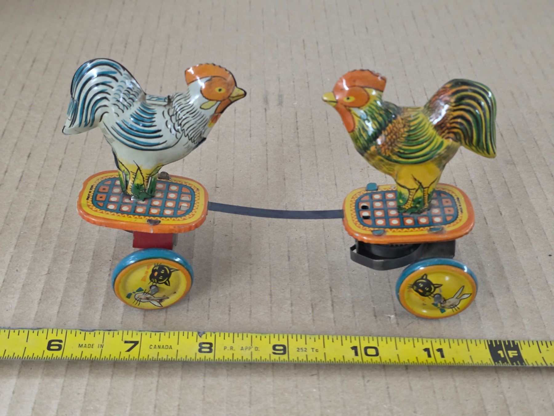 Vintage tin fighting rosters- wind up- 6"L