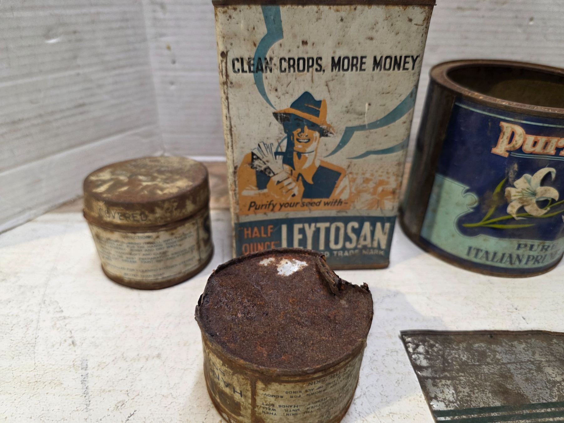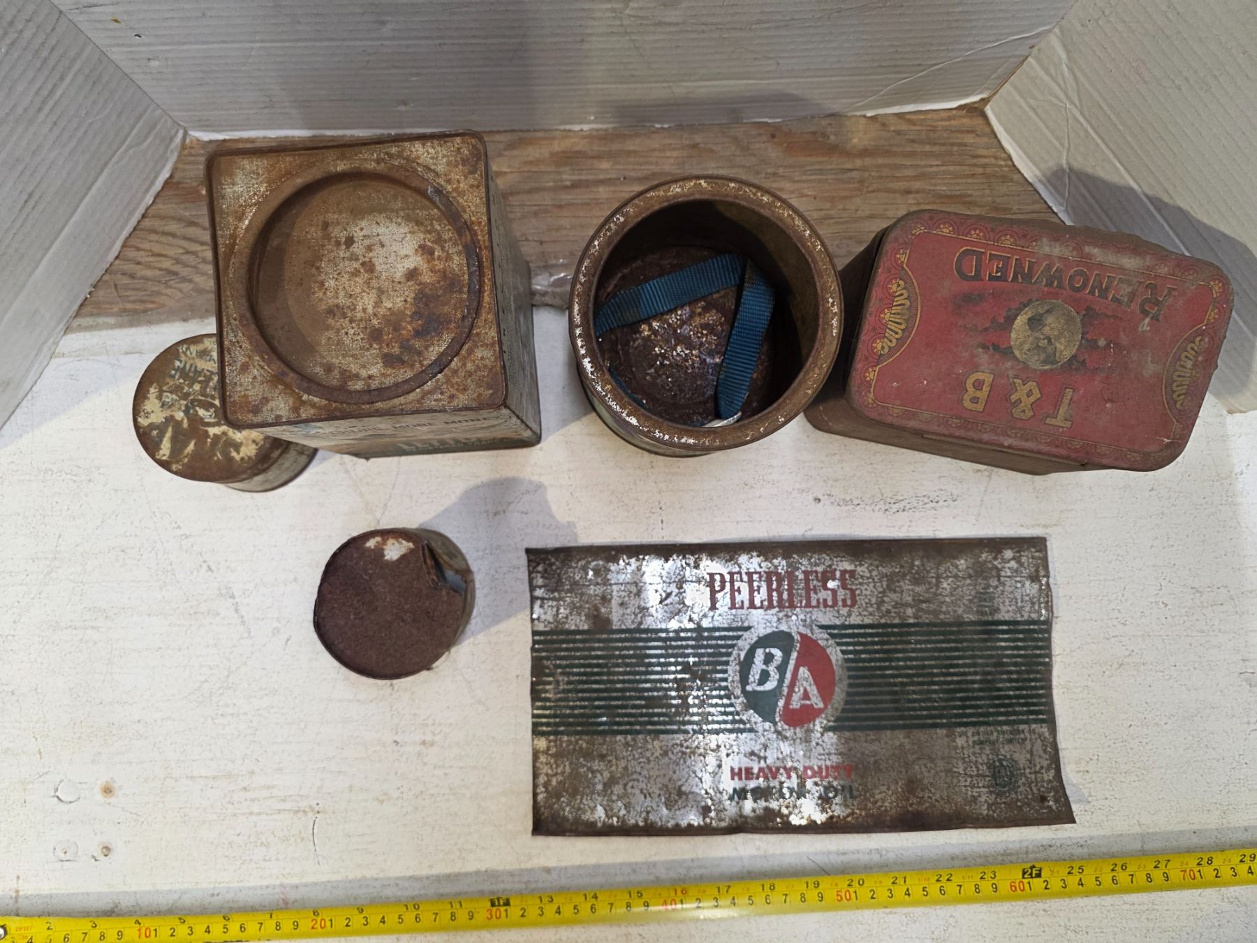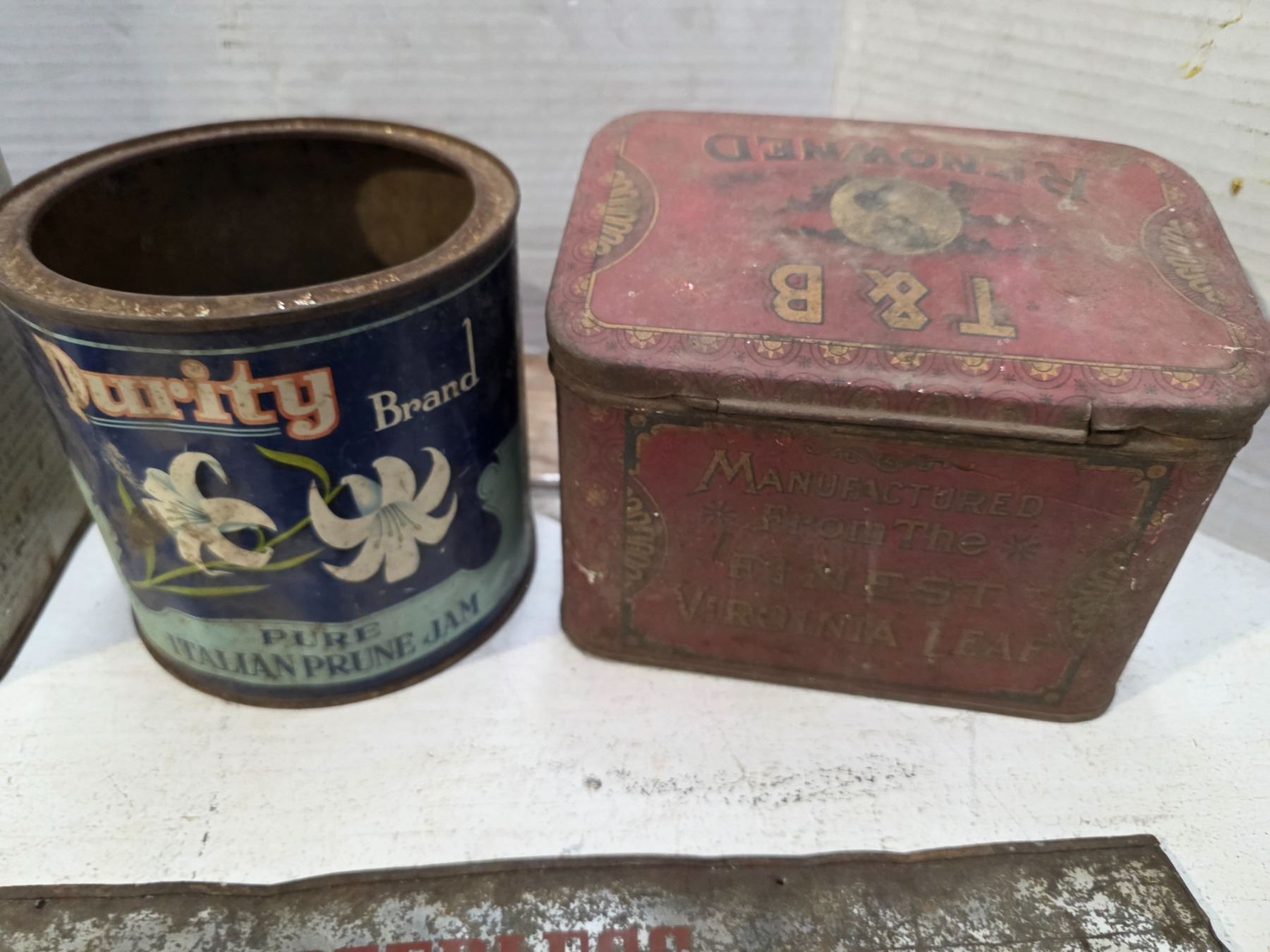 Vintage tins- snap hand cleaner, TB renowed purity jam, BA flattened oil tin