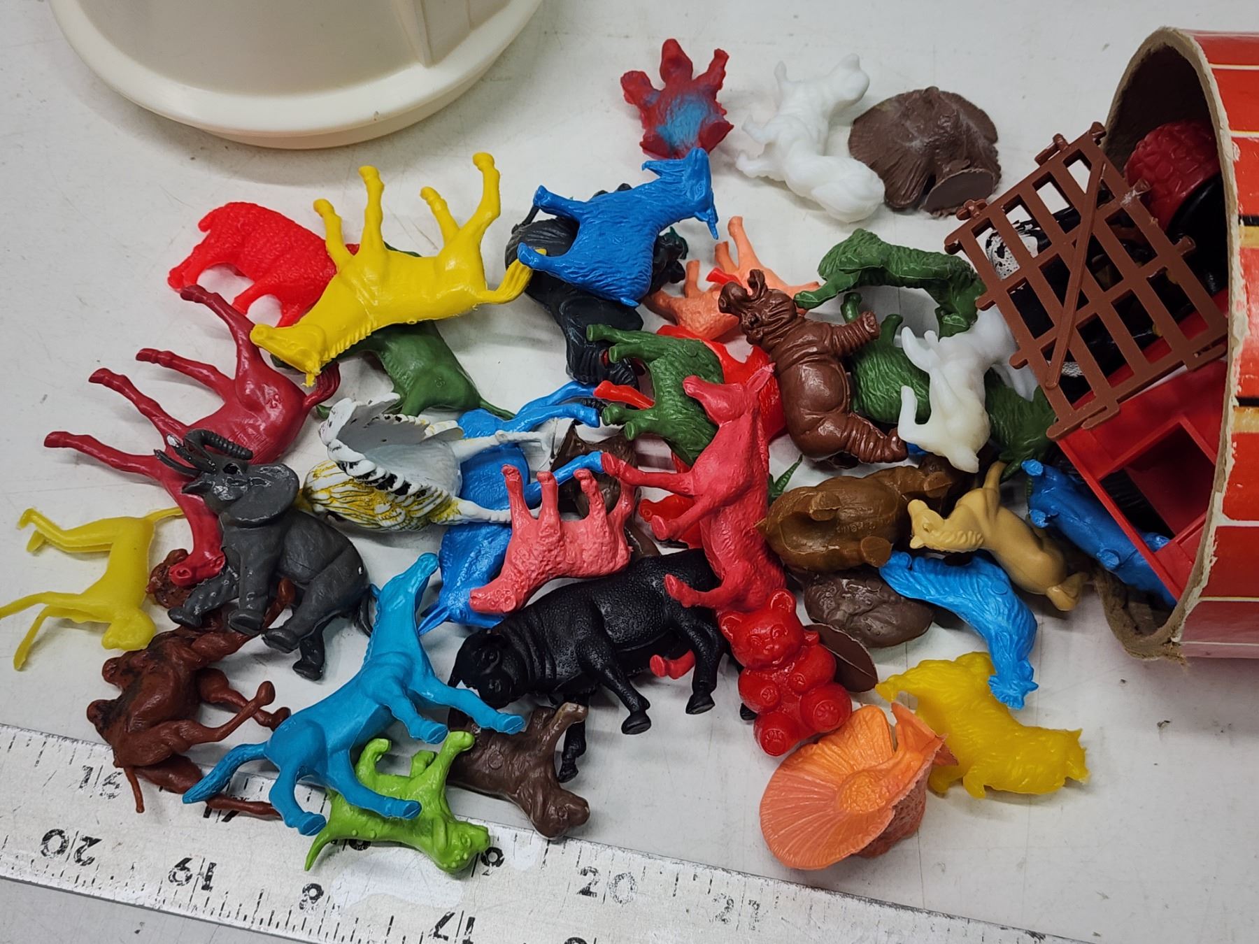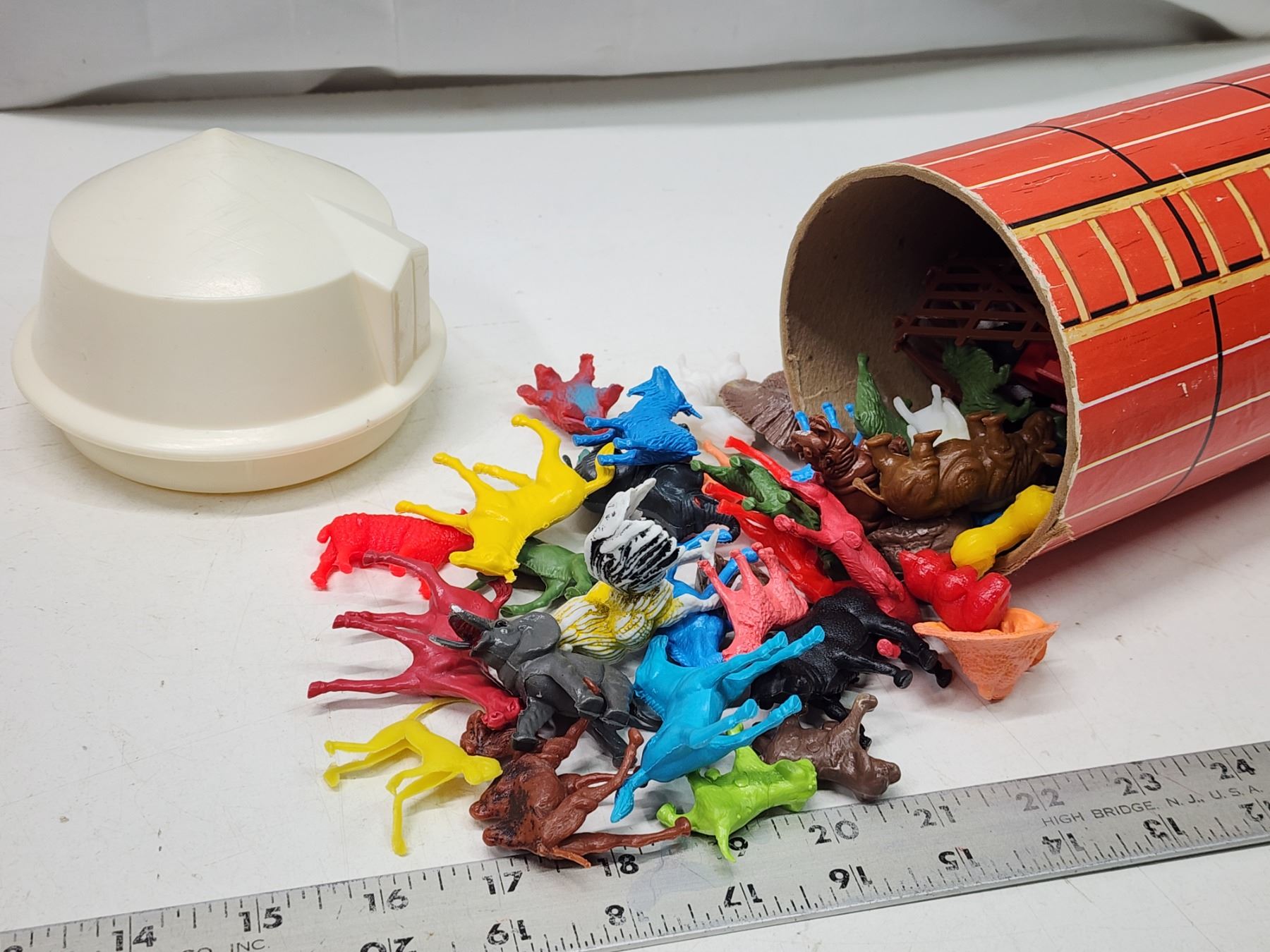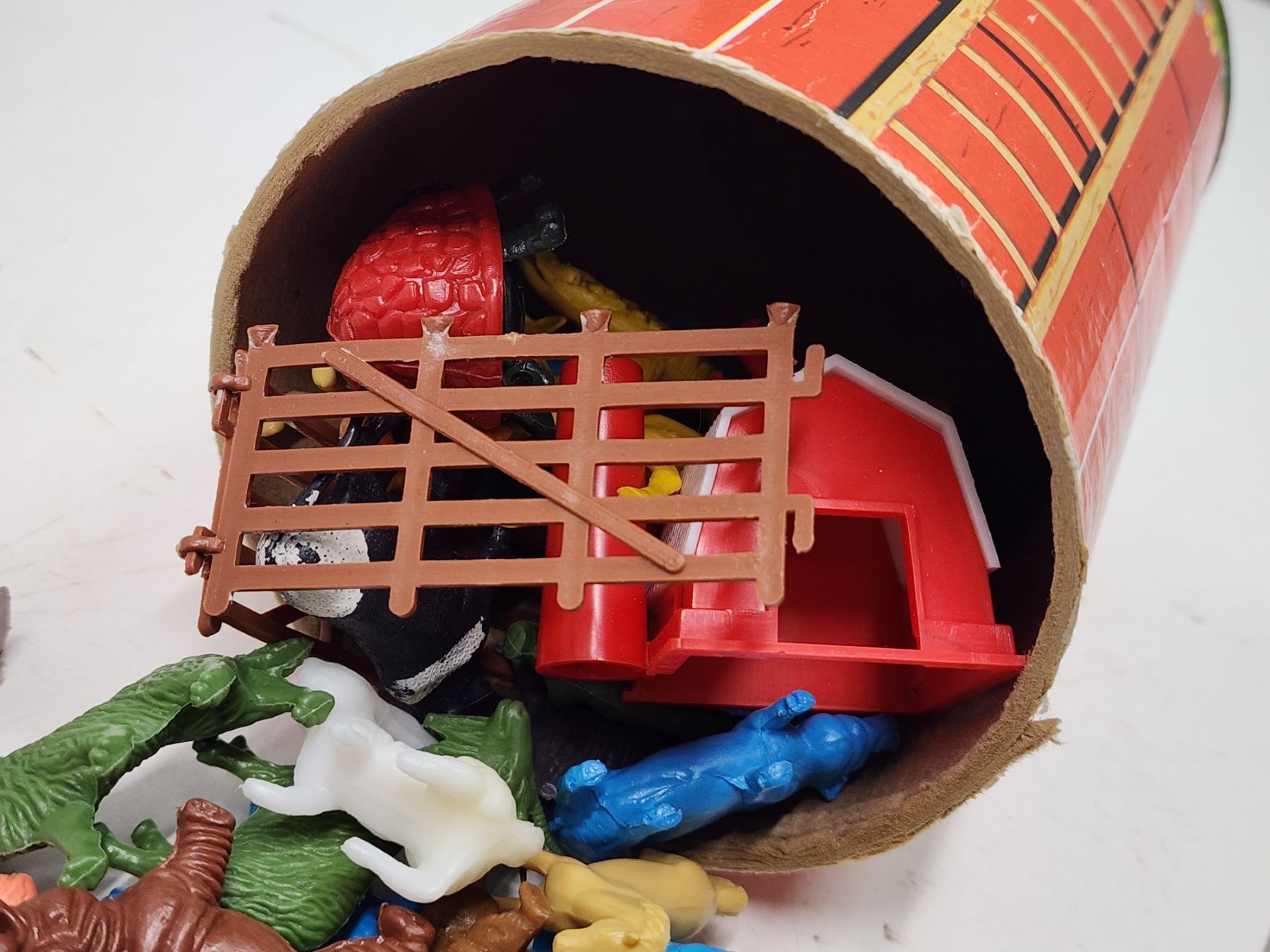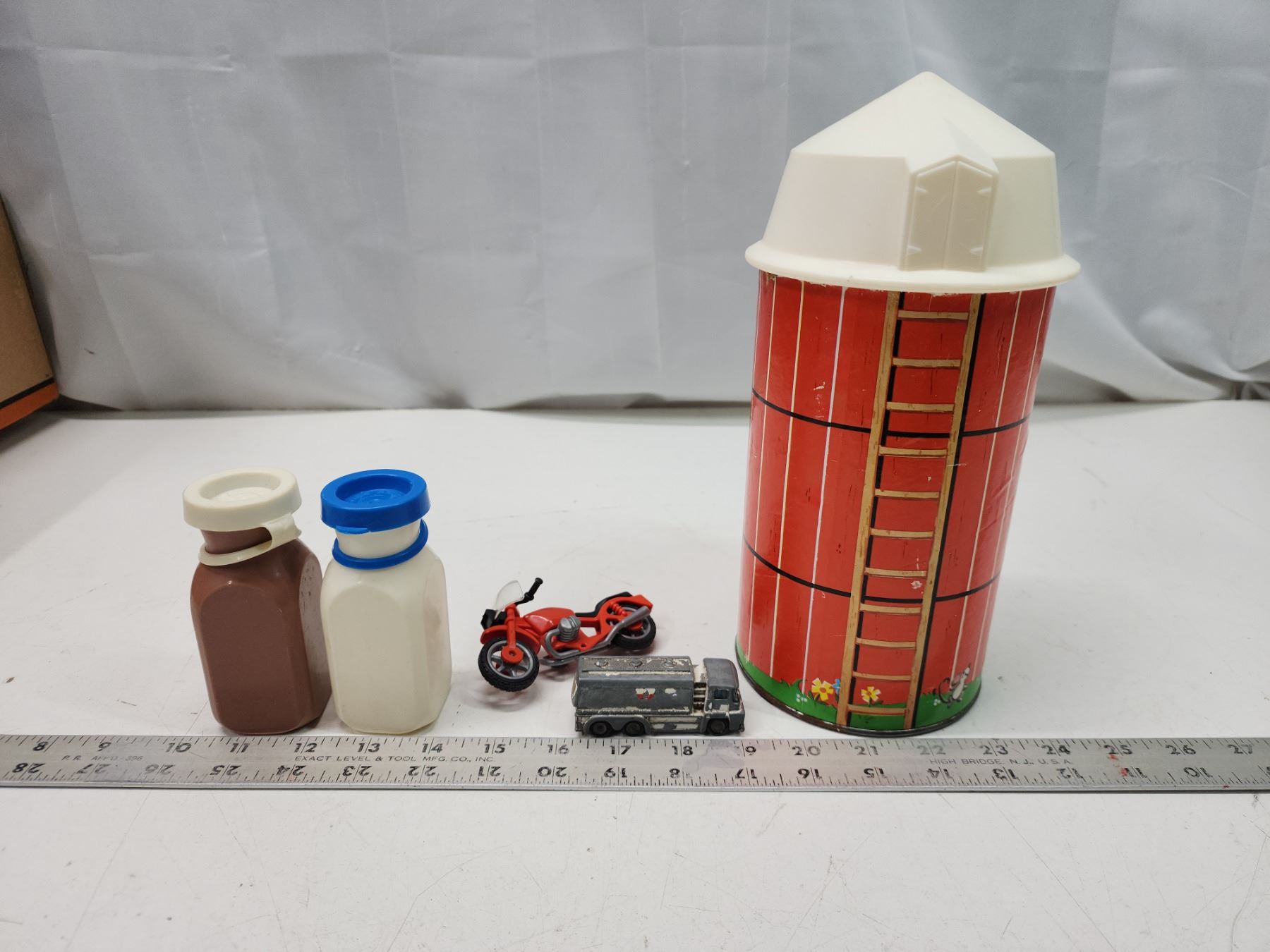 Vintage toys - Grain tower - filled with animals, Corgi toy truck, etc.