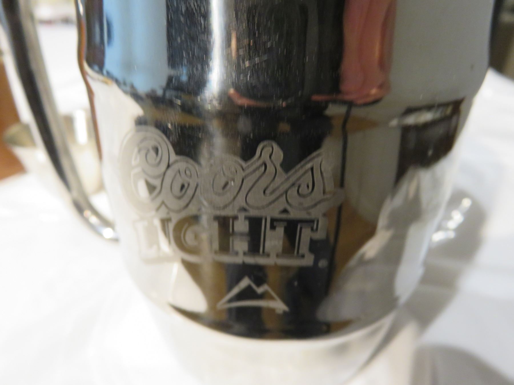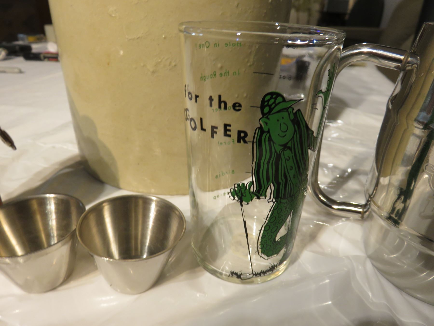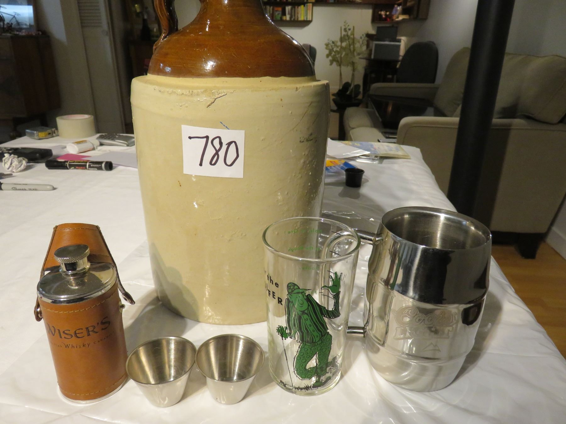 Vintage two gallon jug - Wiser's whiskey flask with cups, a Coor's Light mug & a comical glass