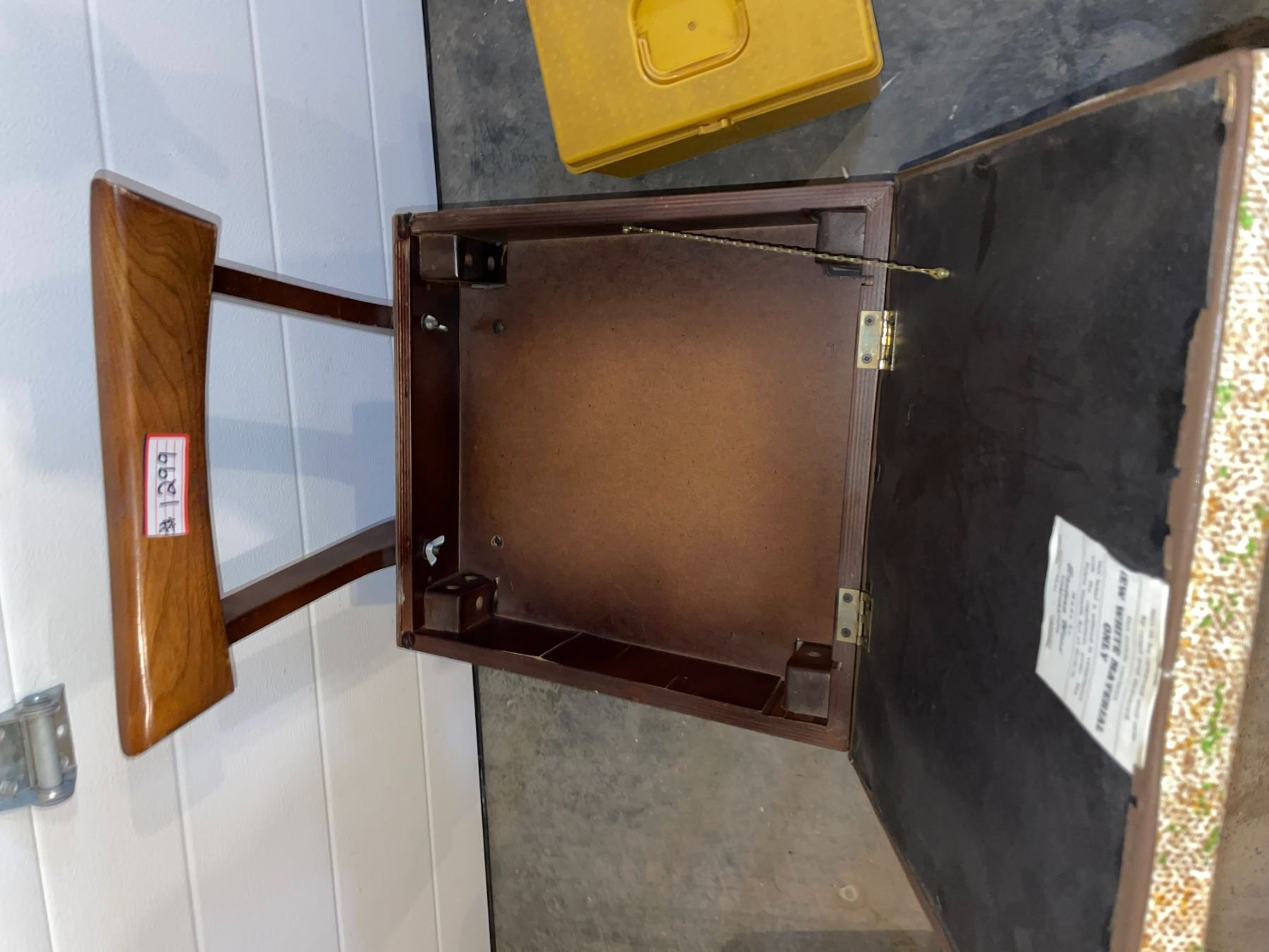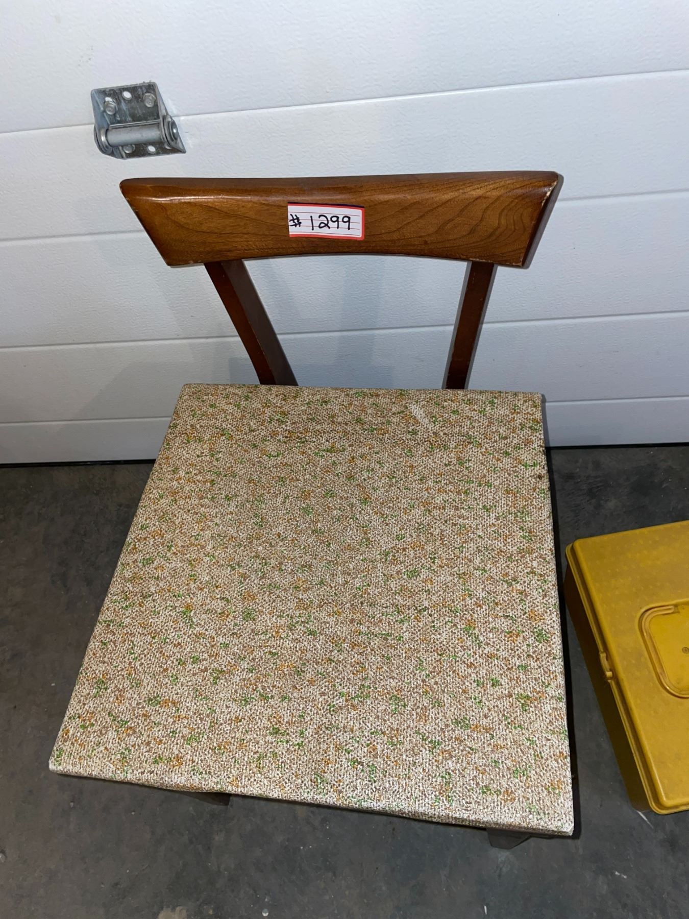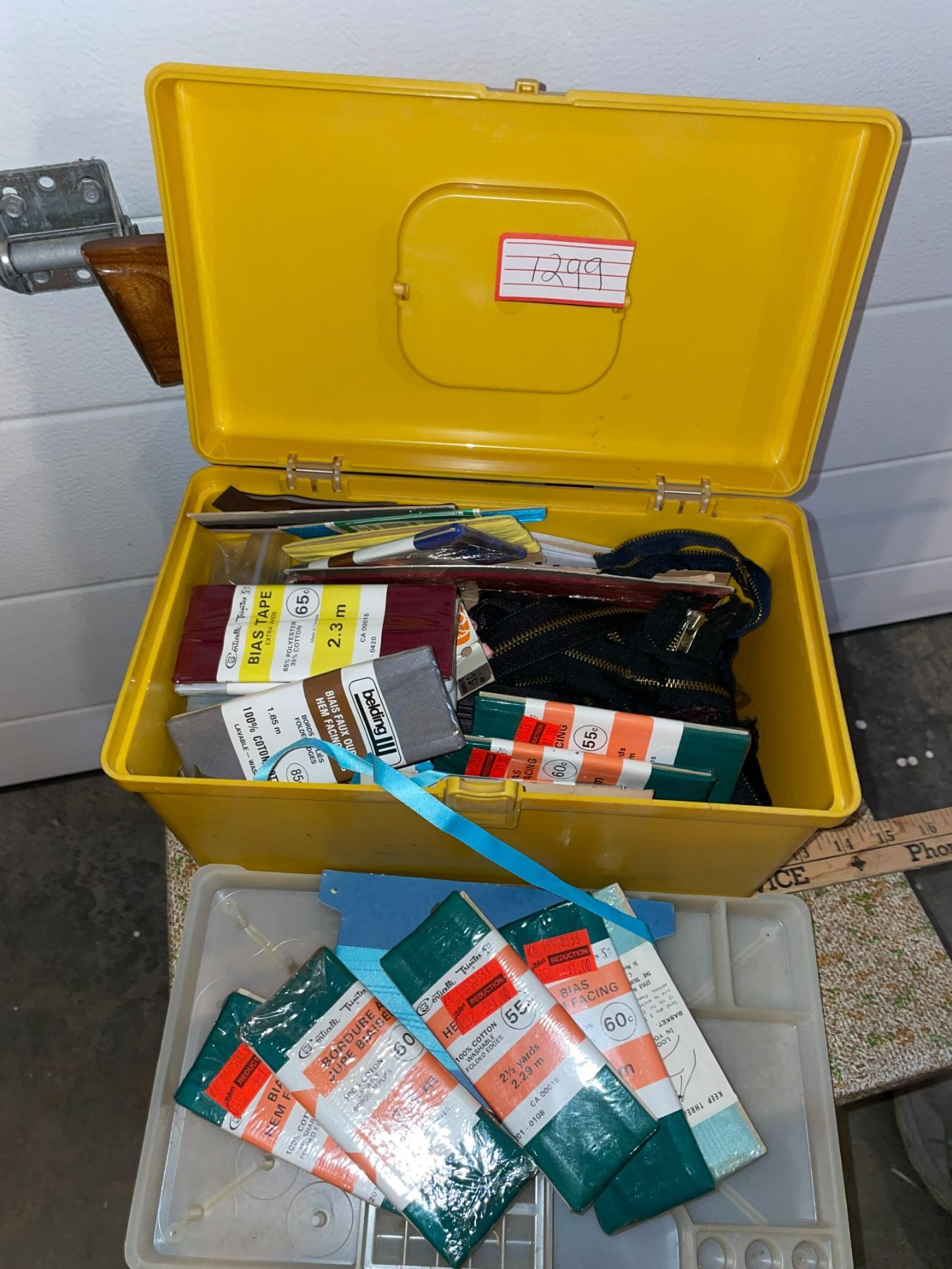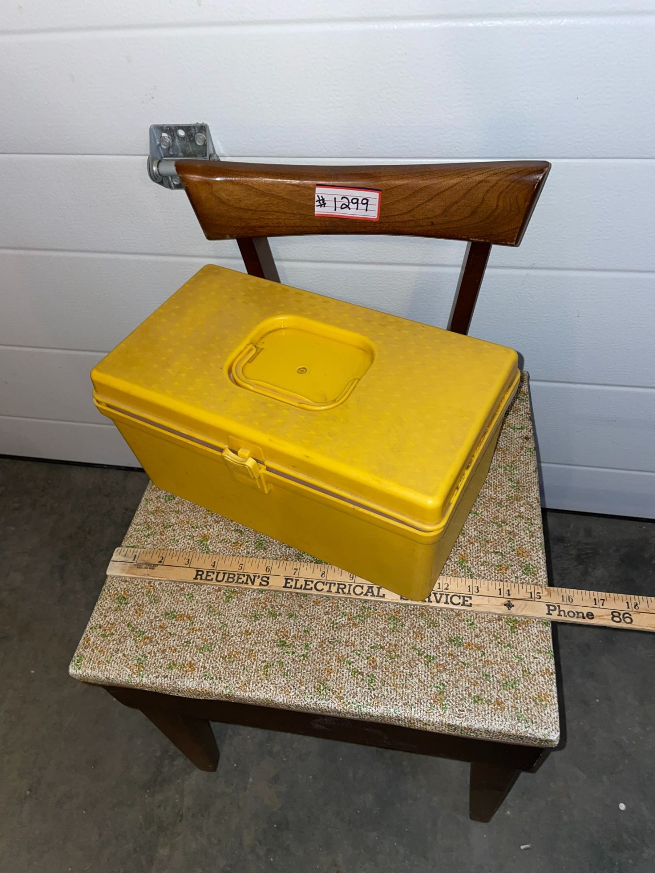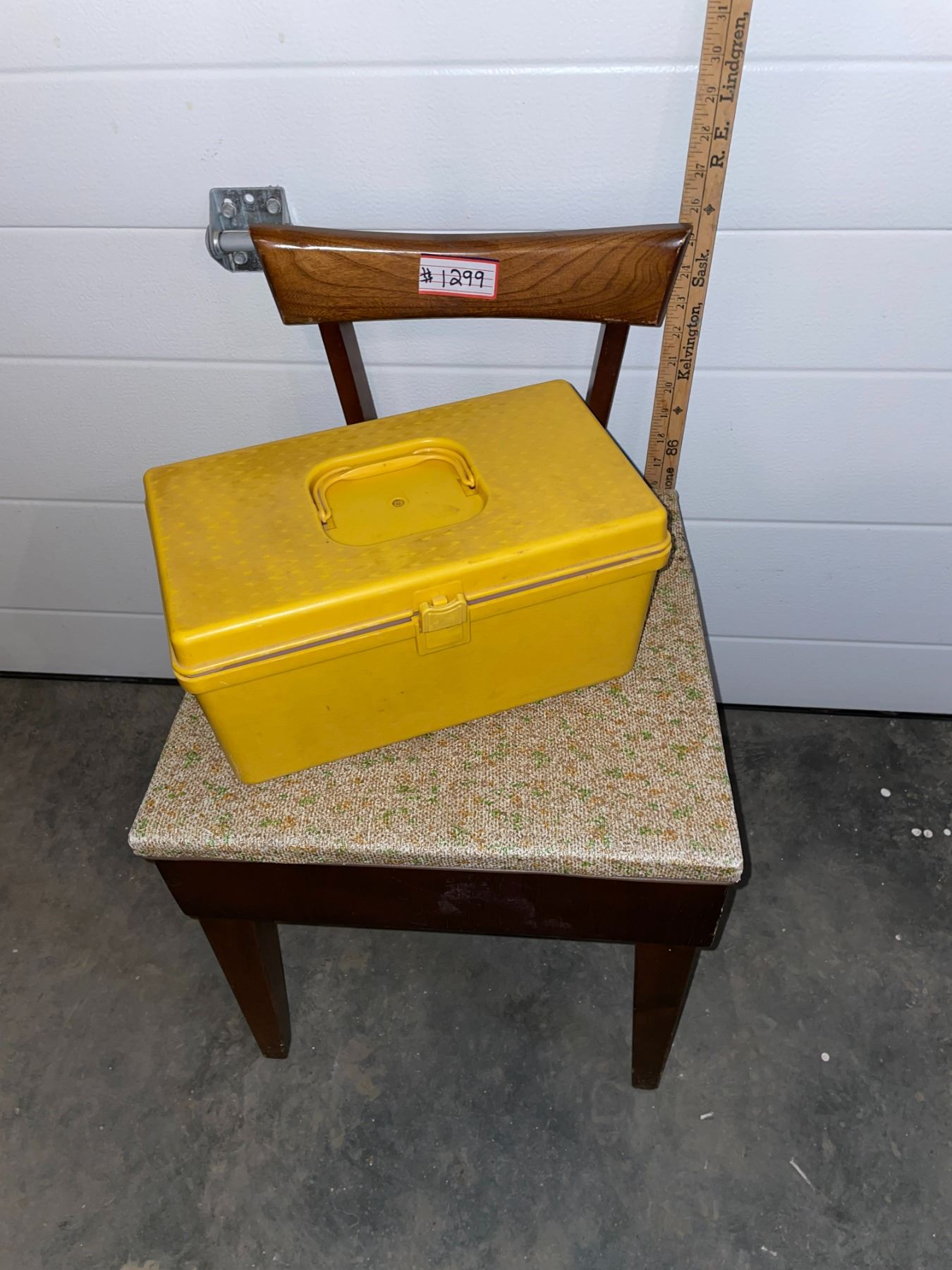 Vintage, walnut sewing chair, and plastic sewing tote, with contents