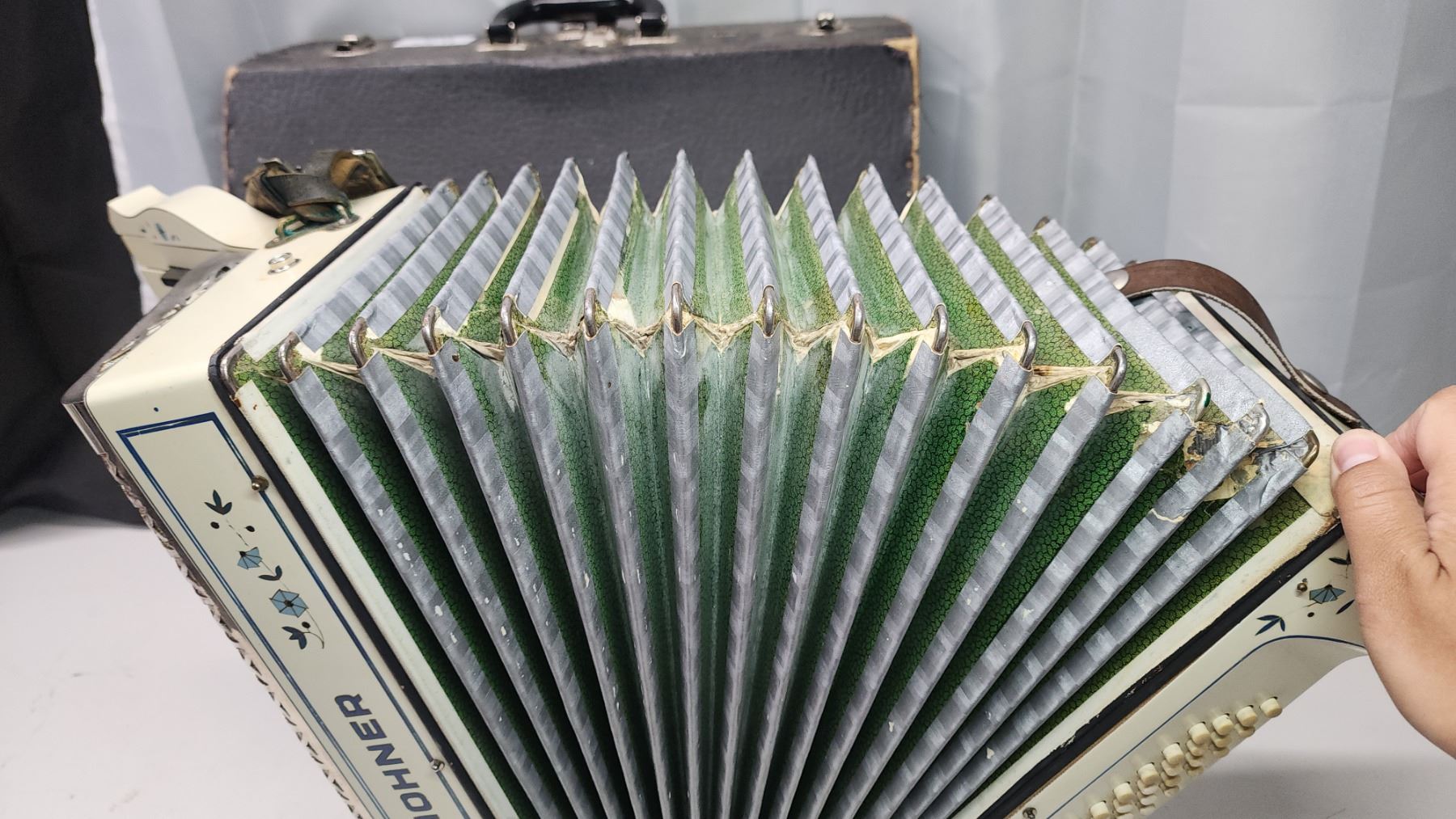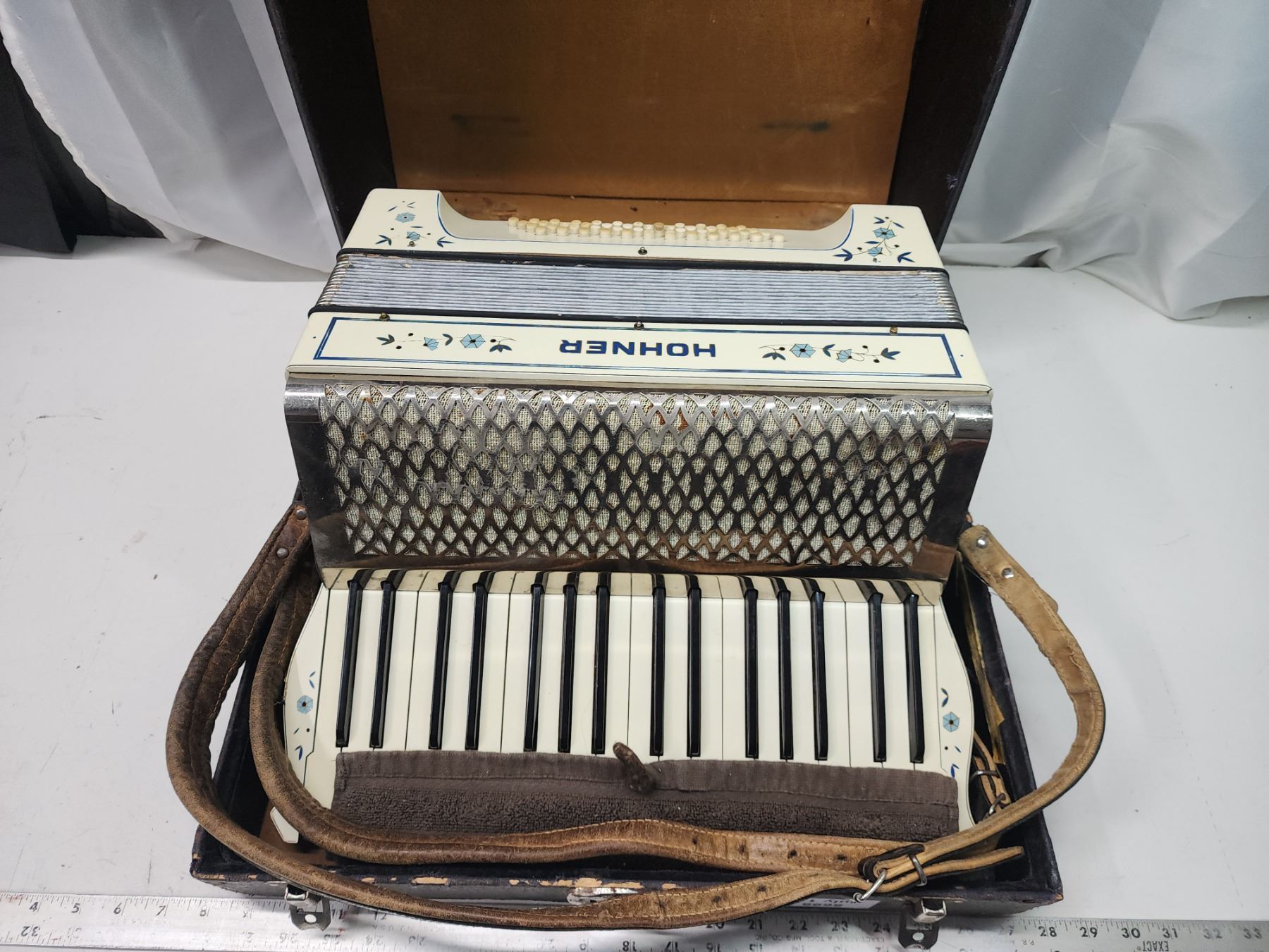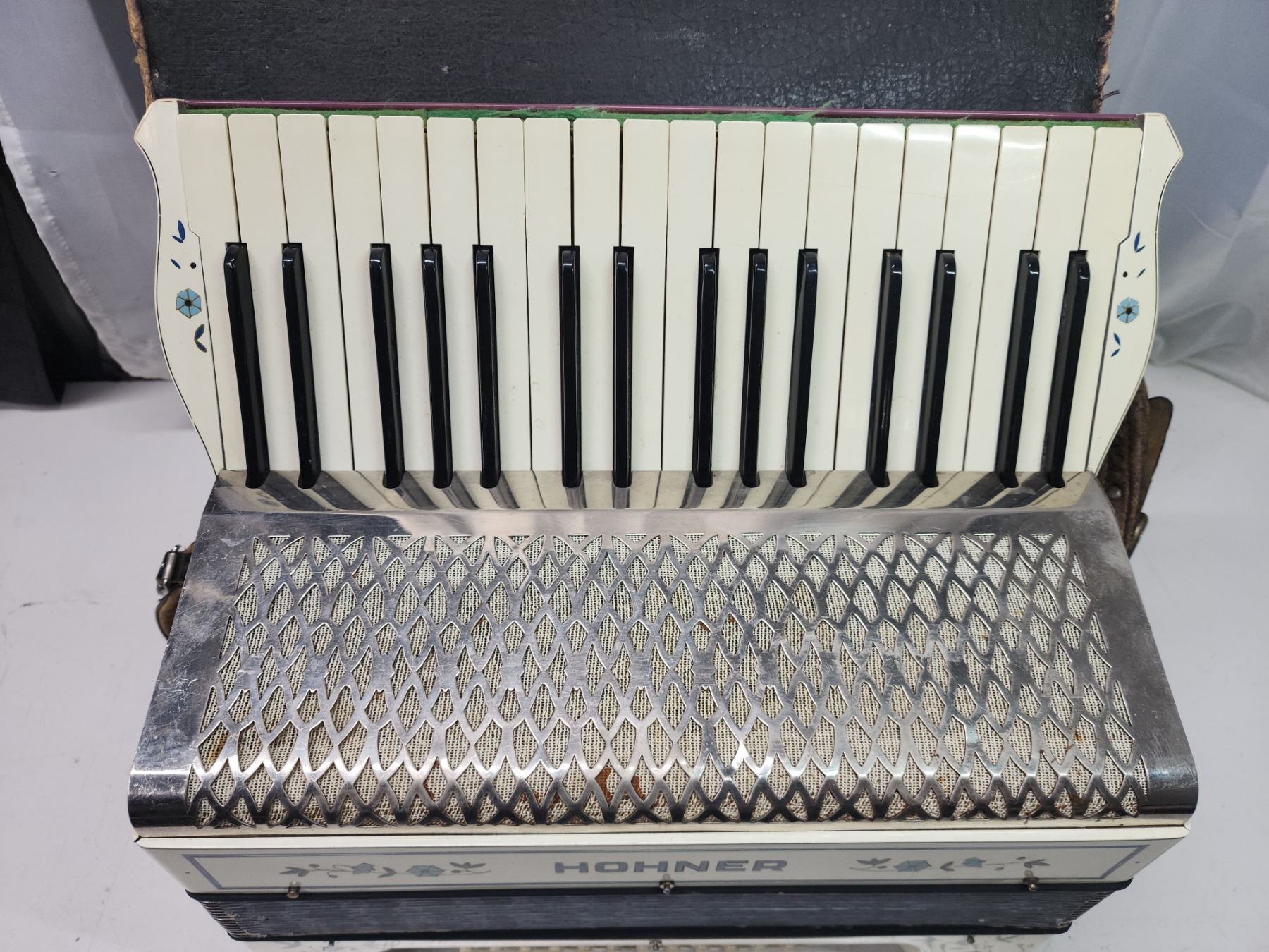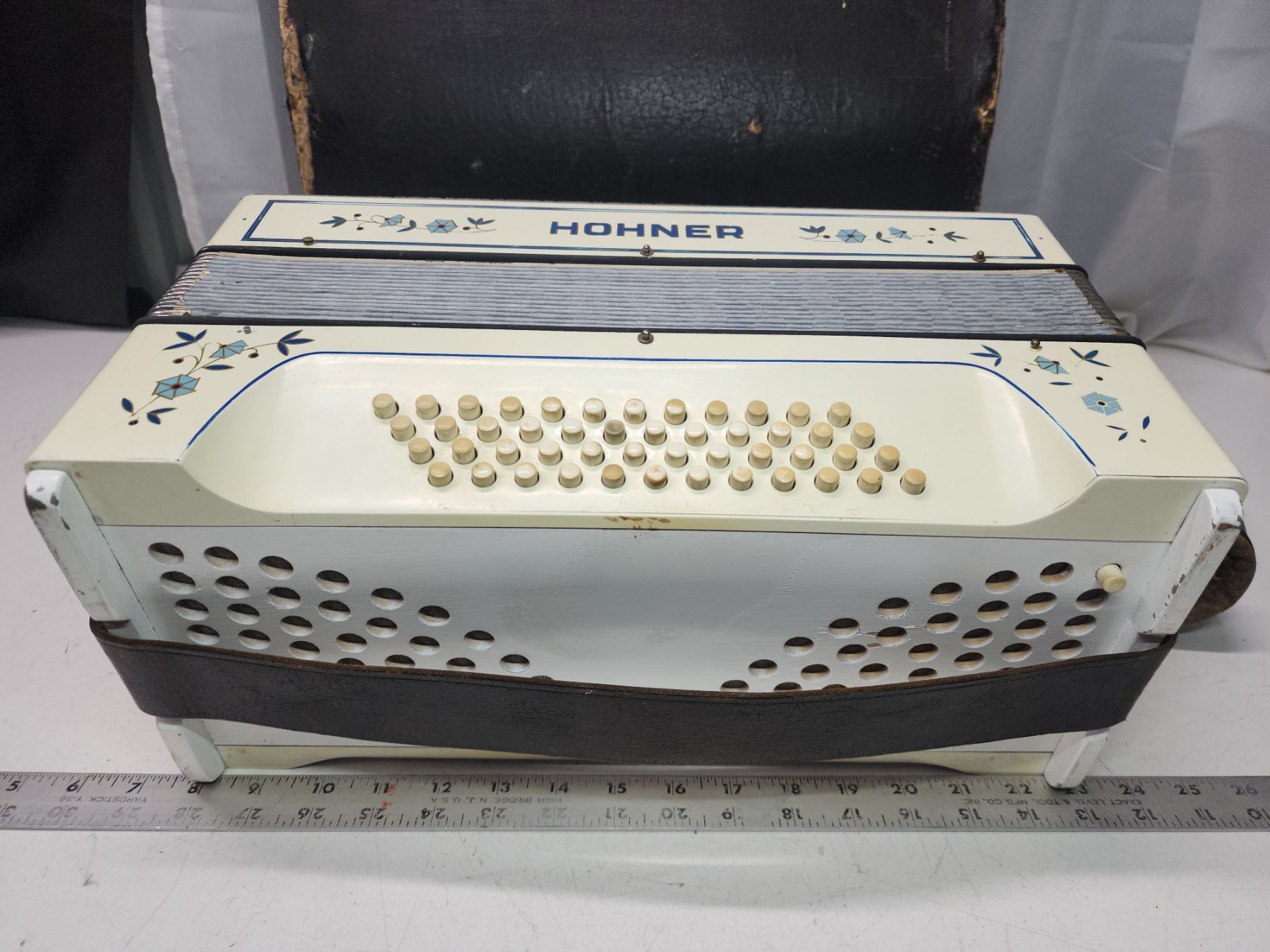 Vintage white "Hochner" accordion, plays beautifully - c/w carrying case