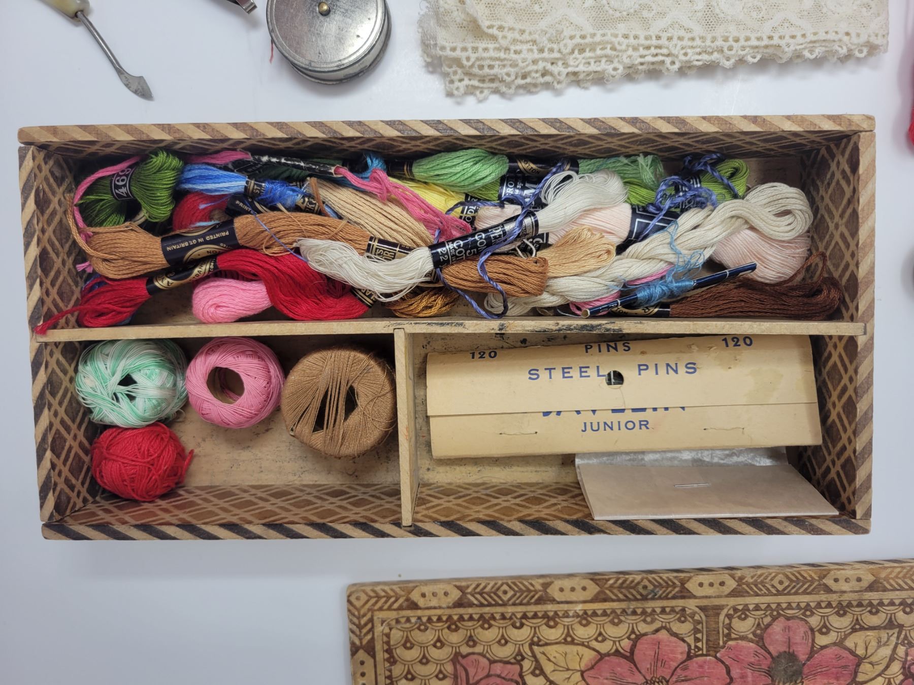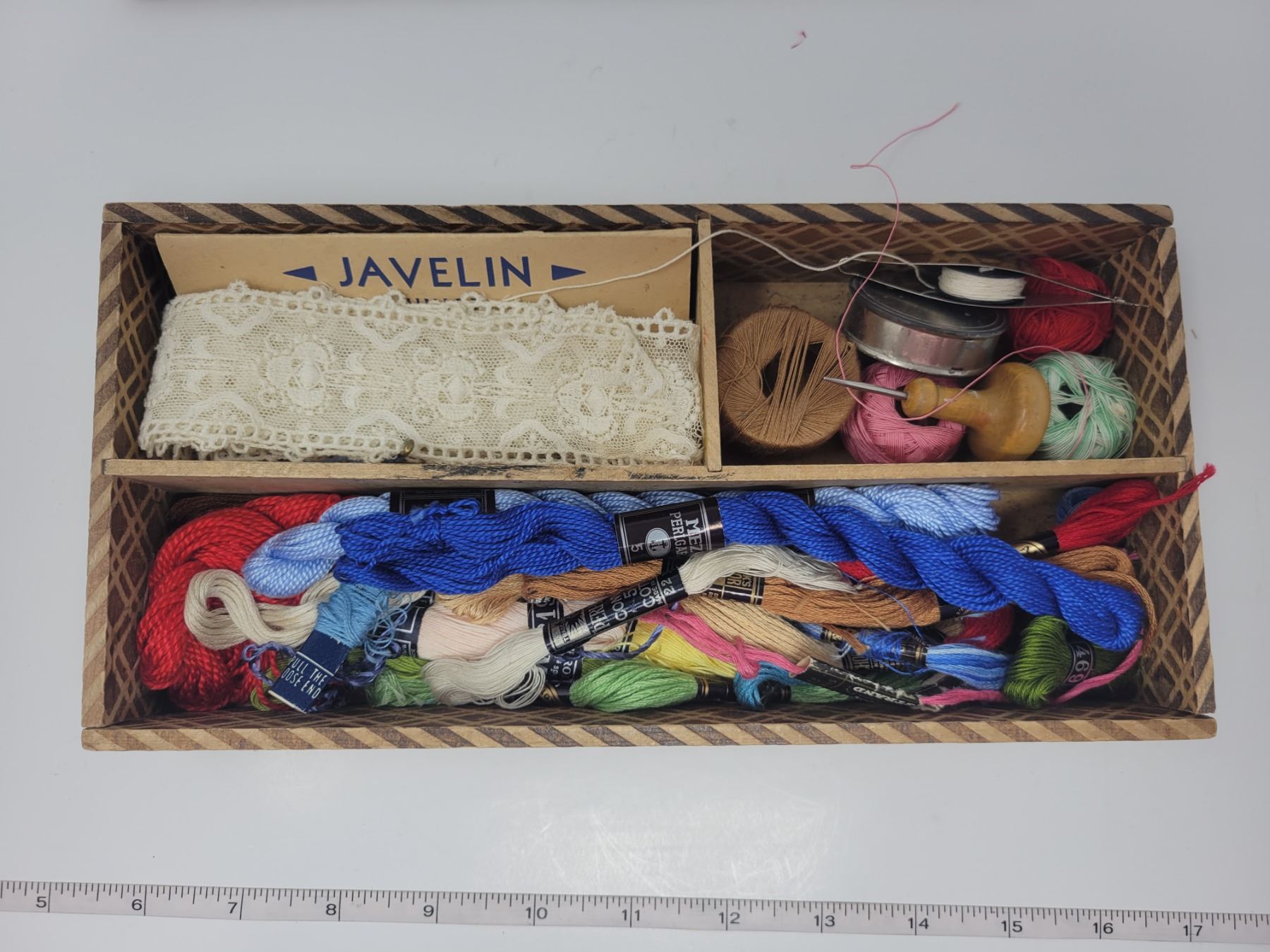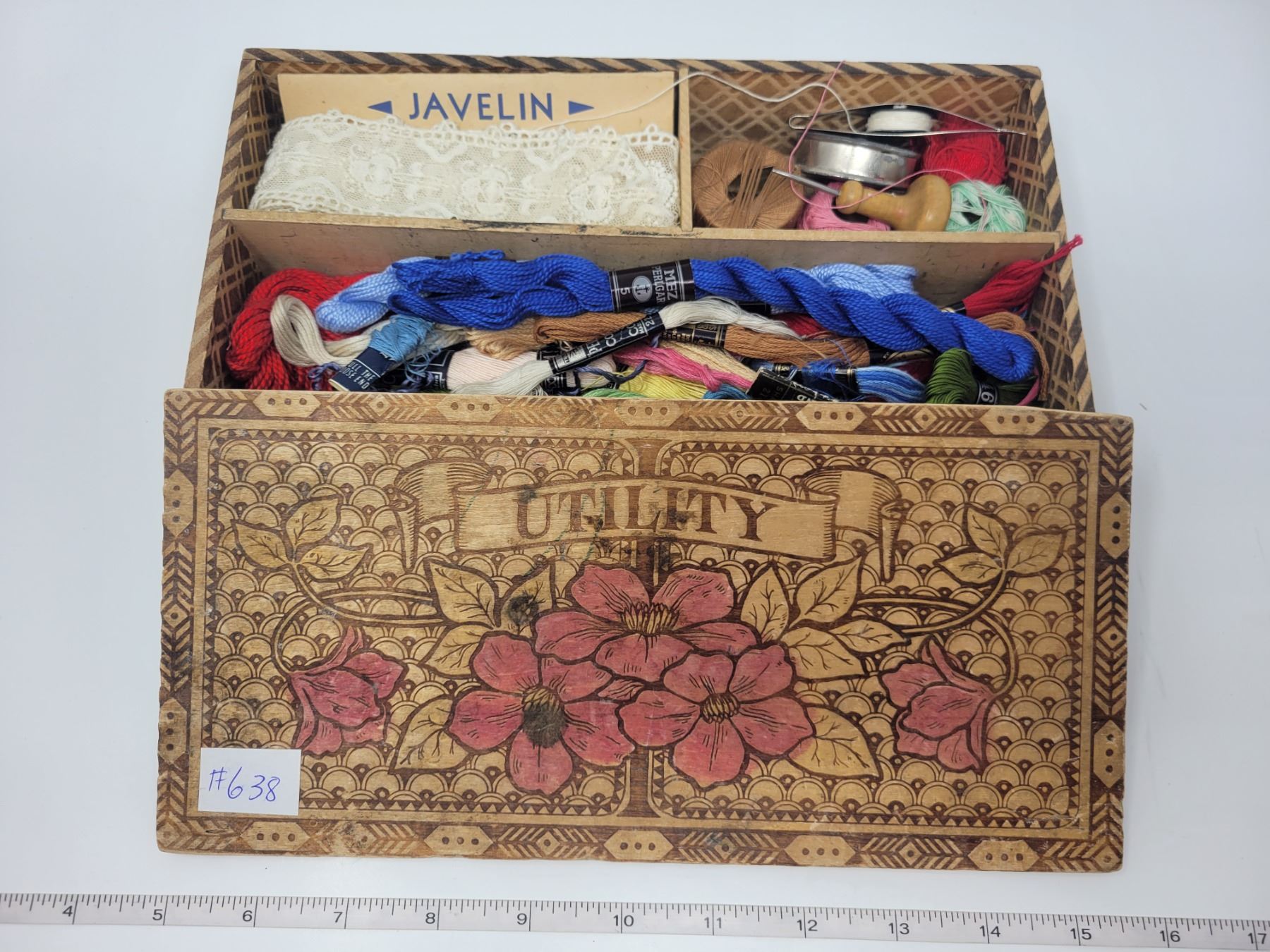 Vintage wood box sewing box marked “Utility”, and contents
