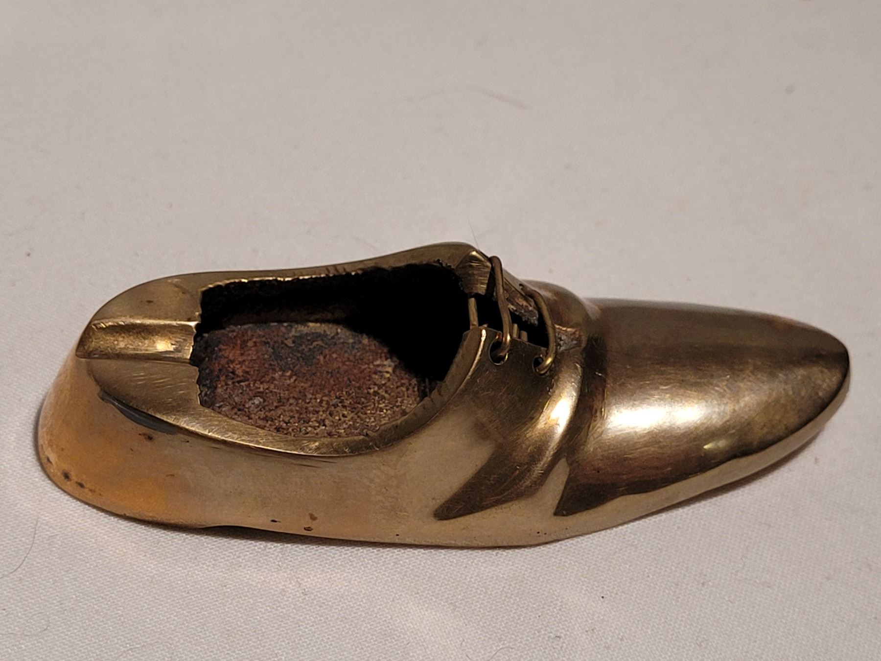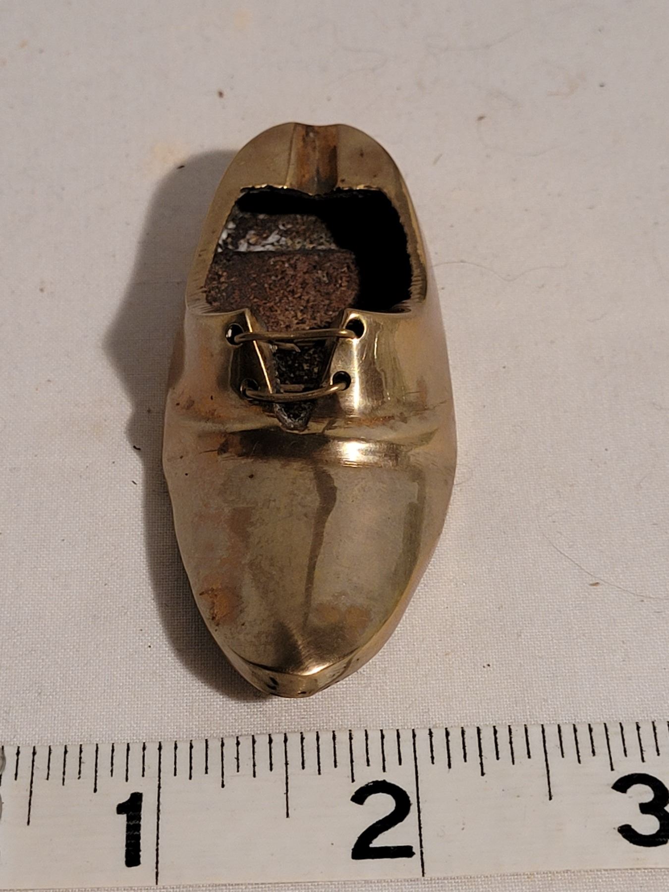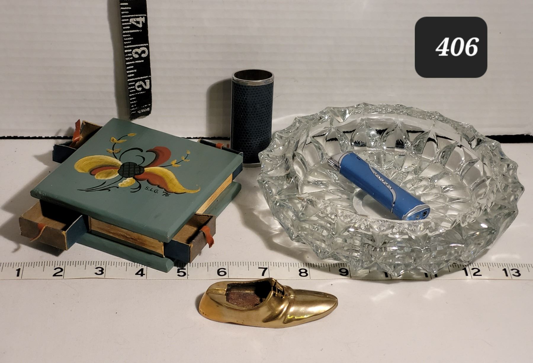 Vintage wooden matchbox (4) holder, butane lighter & brass shoe ashtray (made in India)