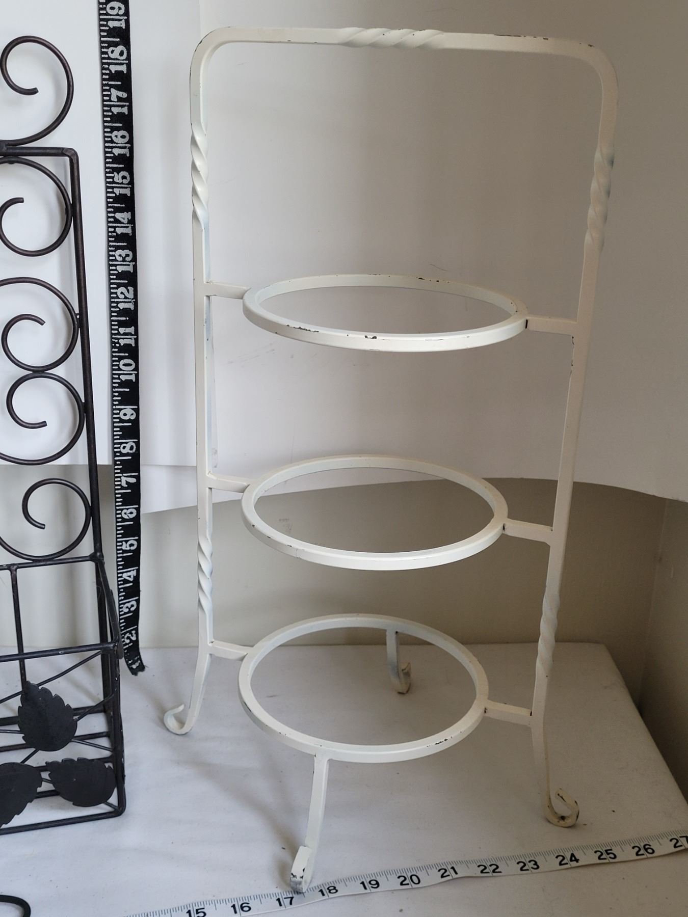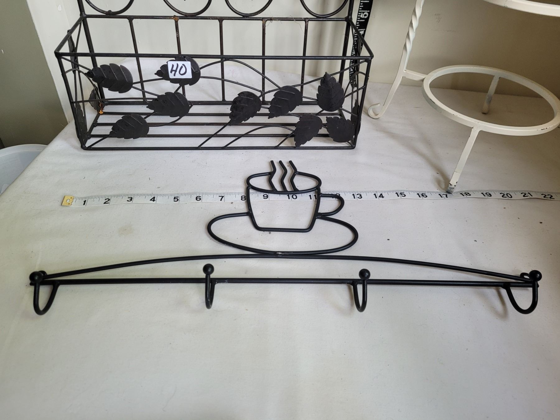 Vintage wrought iron pie server, Metal wall shelf & coffee cup hanger.