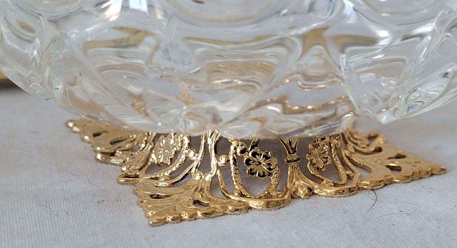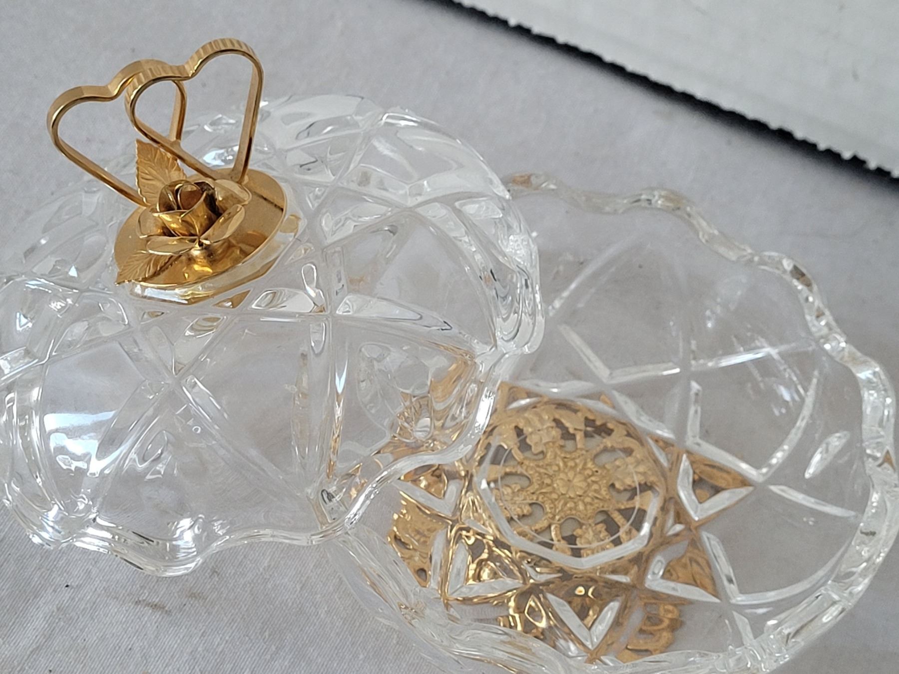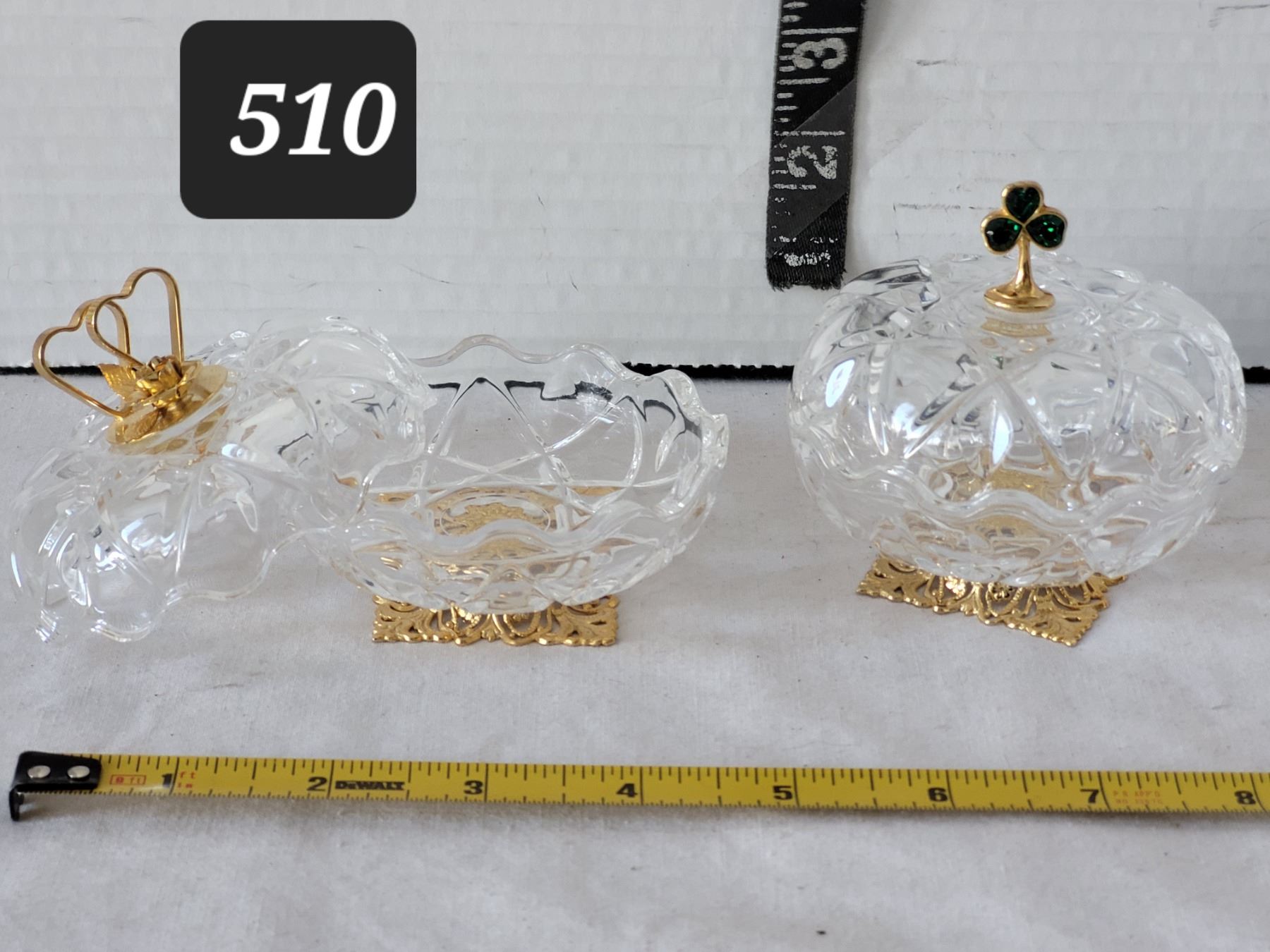 Vtg. 22K gold finish. Killarney 24% lead crystal trinket dishes with lids. Filigree base.