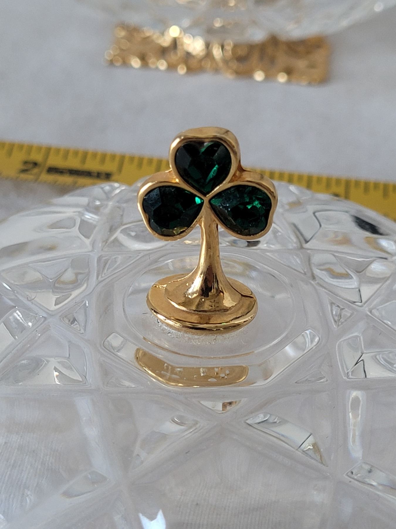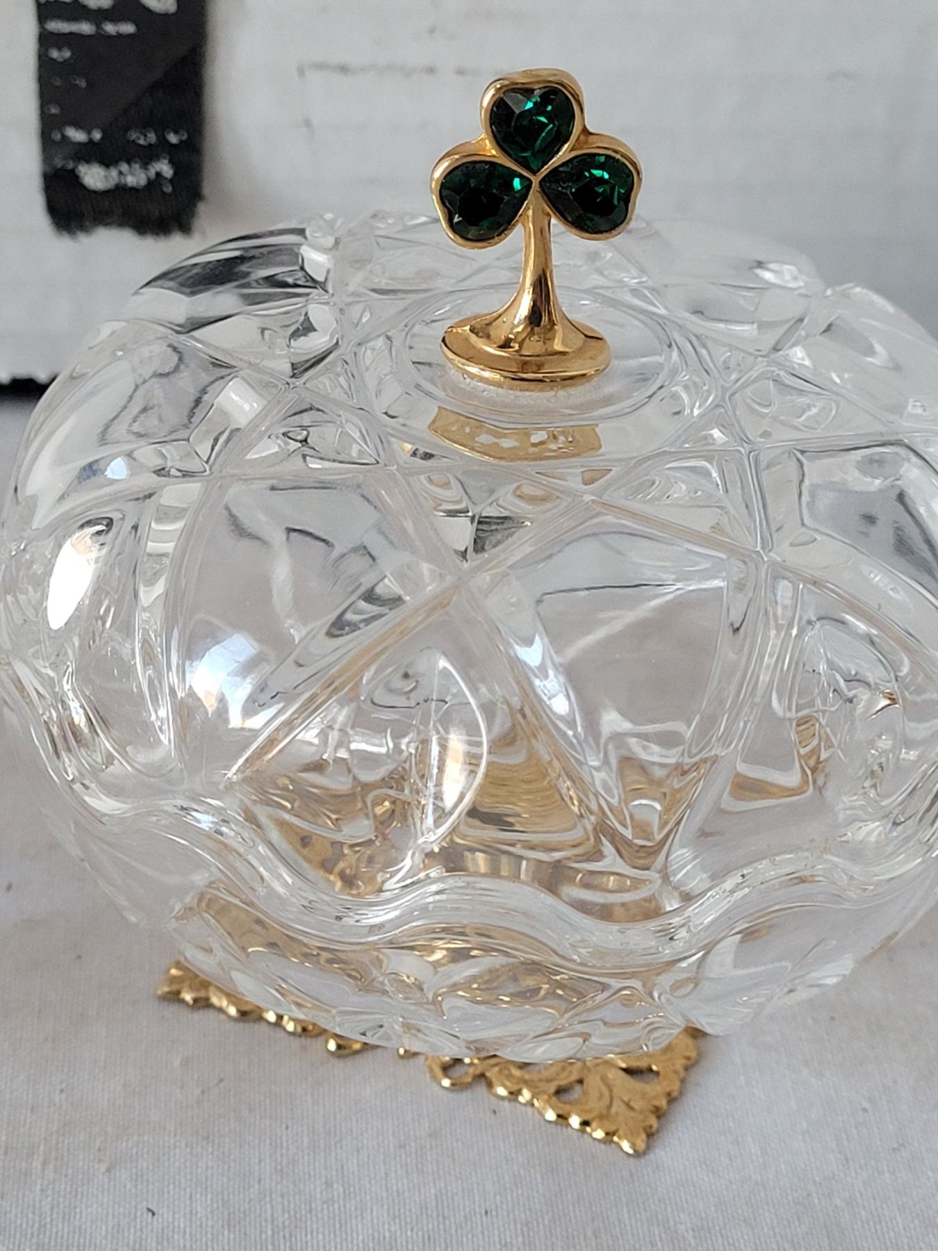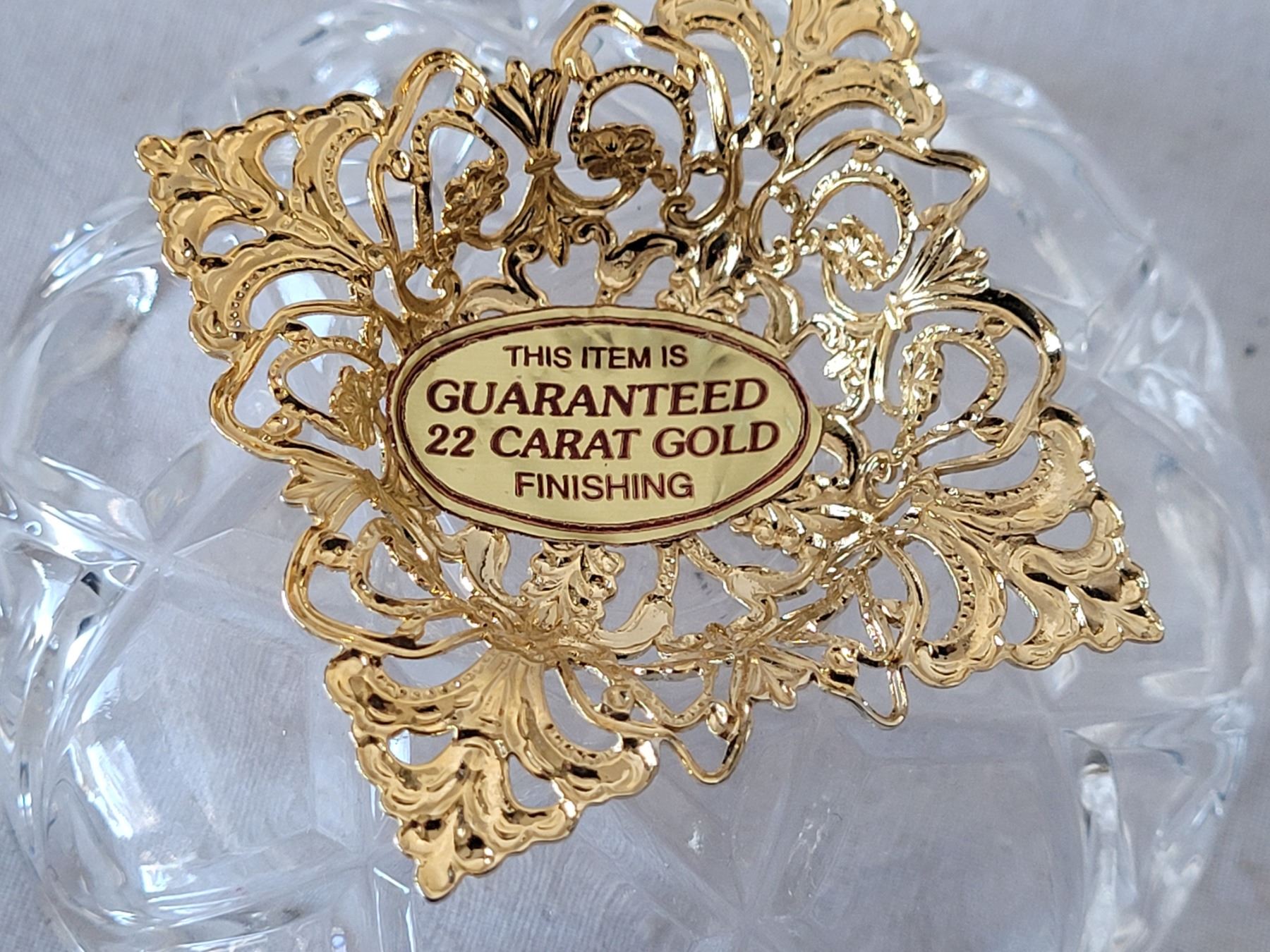 Vtg. 22K gold finish. Killarney 24% lead crystal trinket dishes with lids. Filigree base.