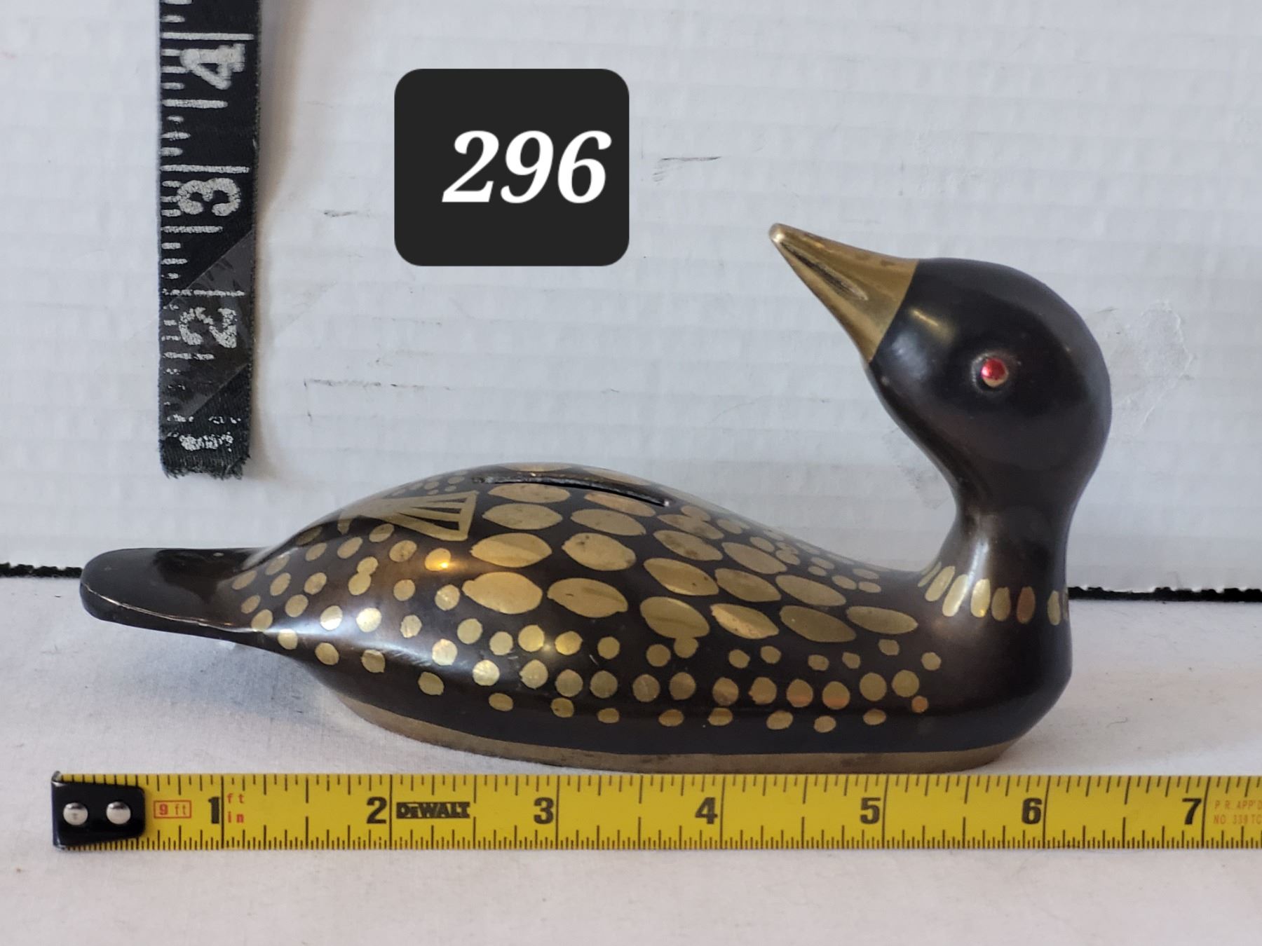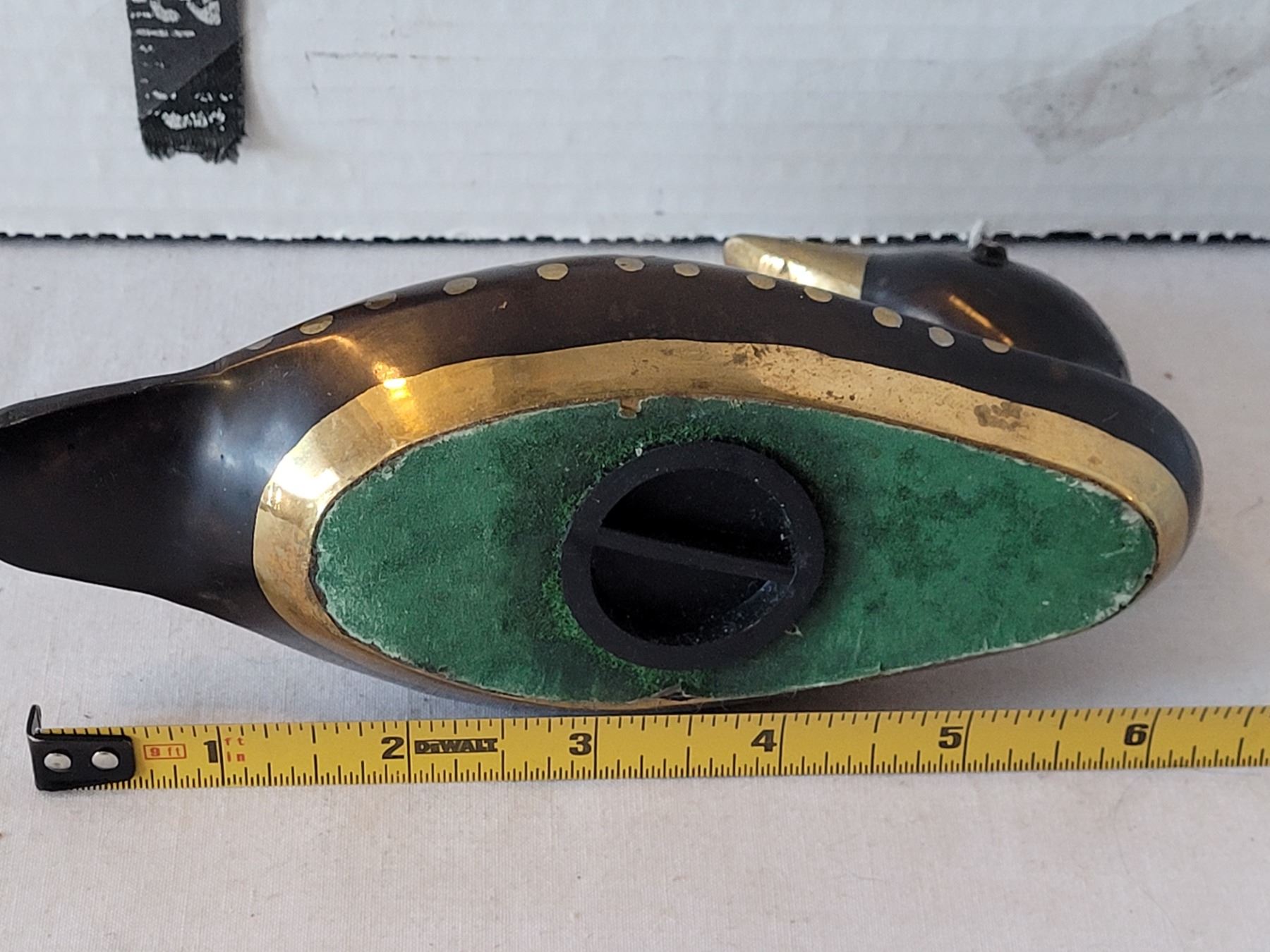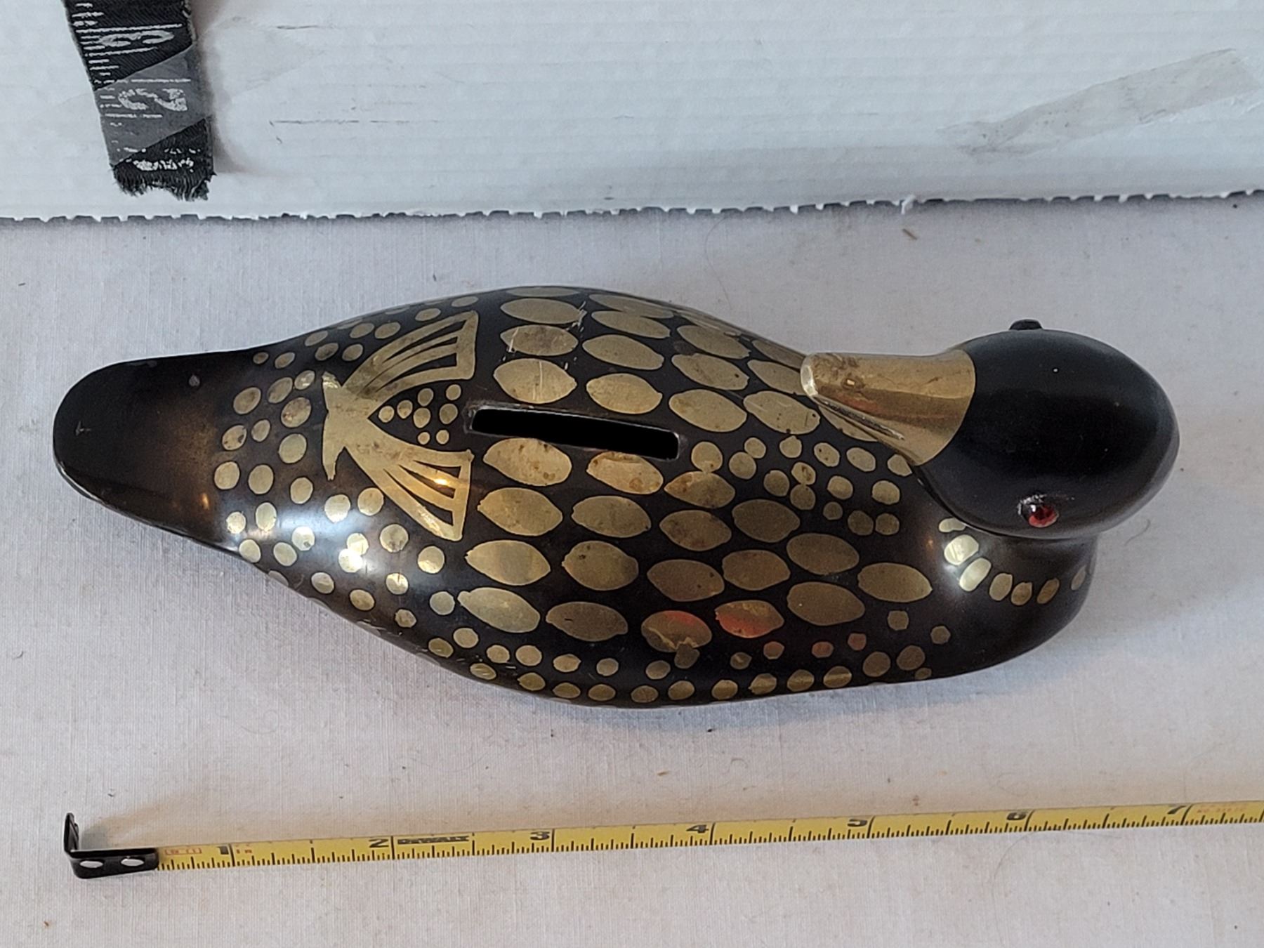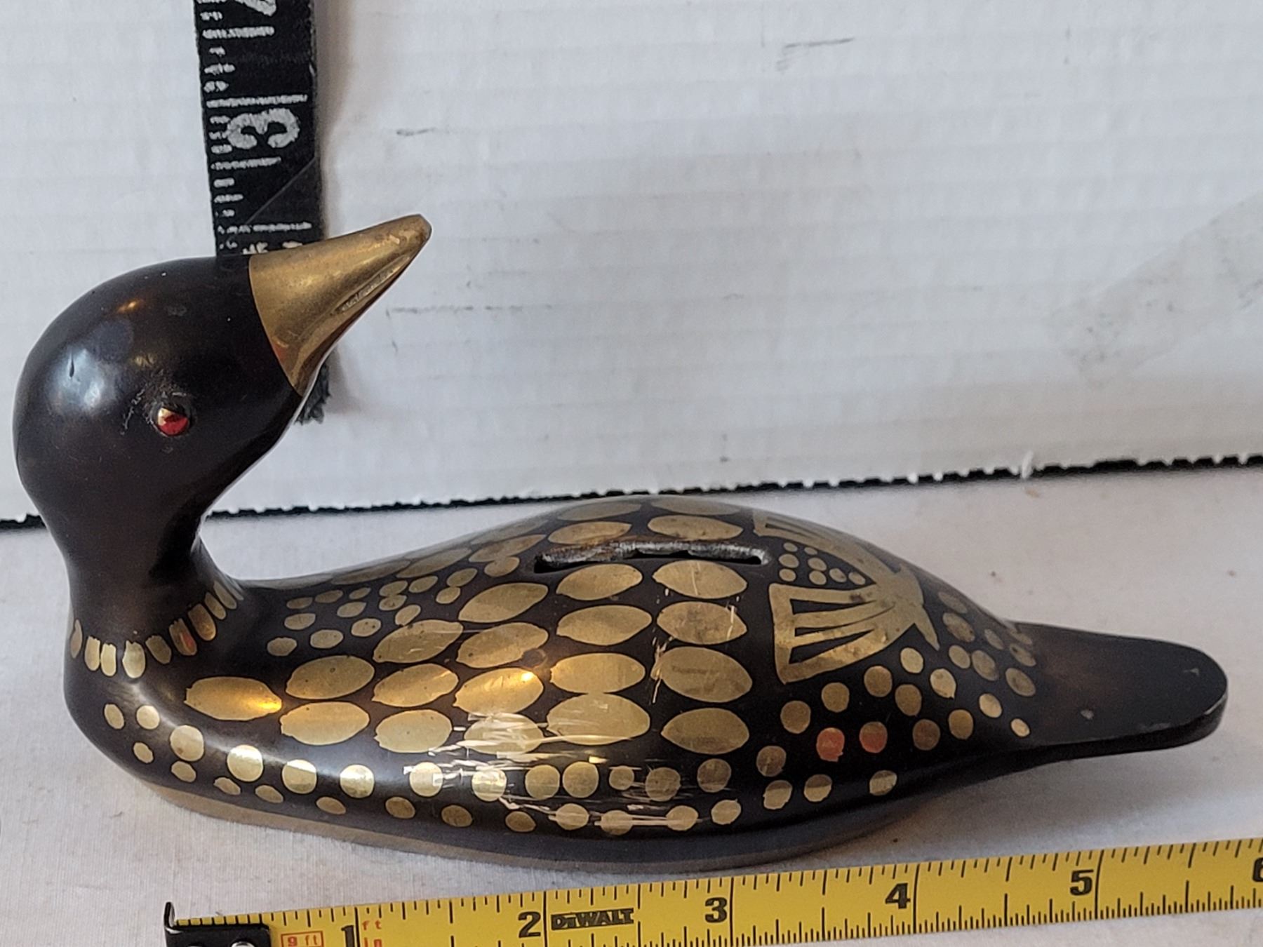 Vtg. Brass loon coin bank. Hand painted Black enamel on brass.