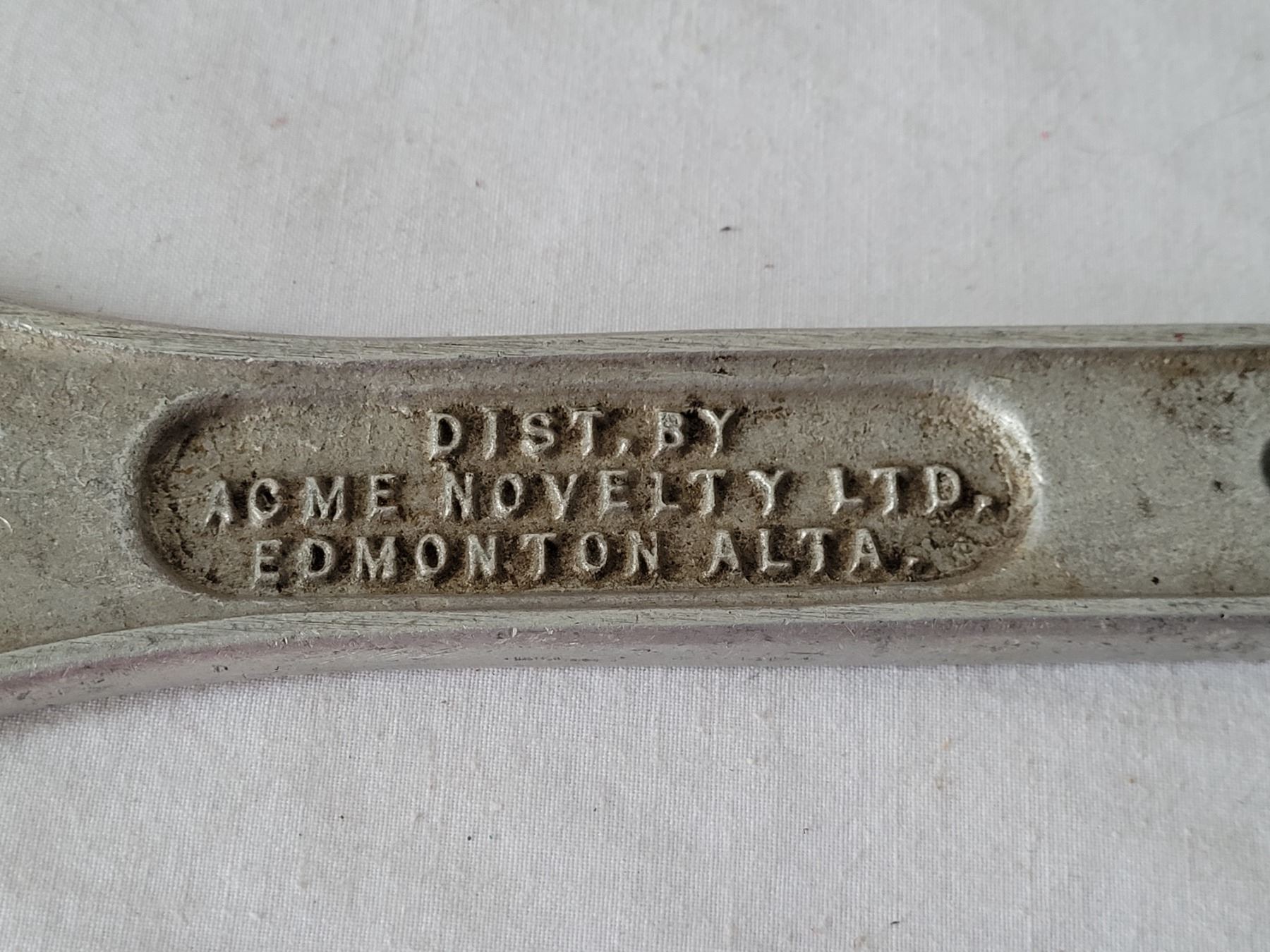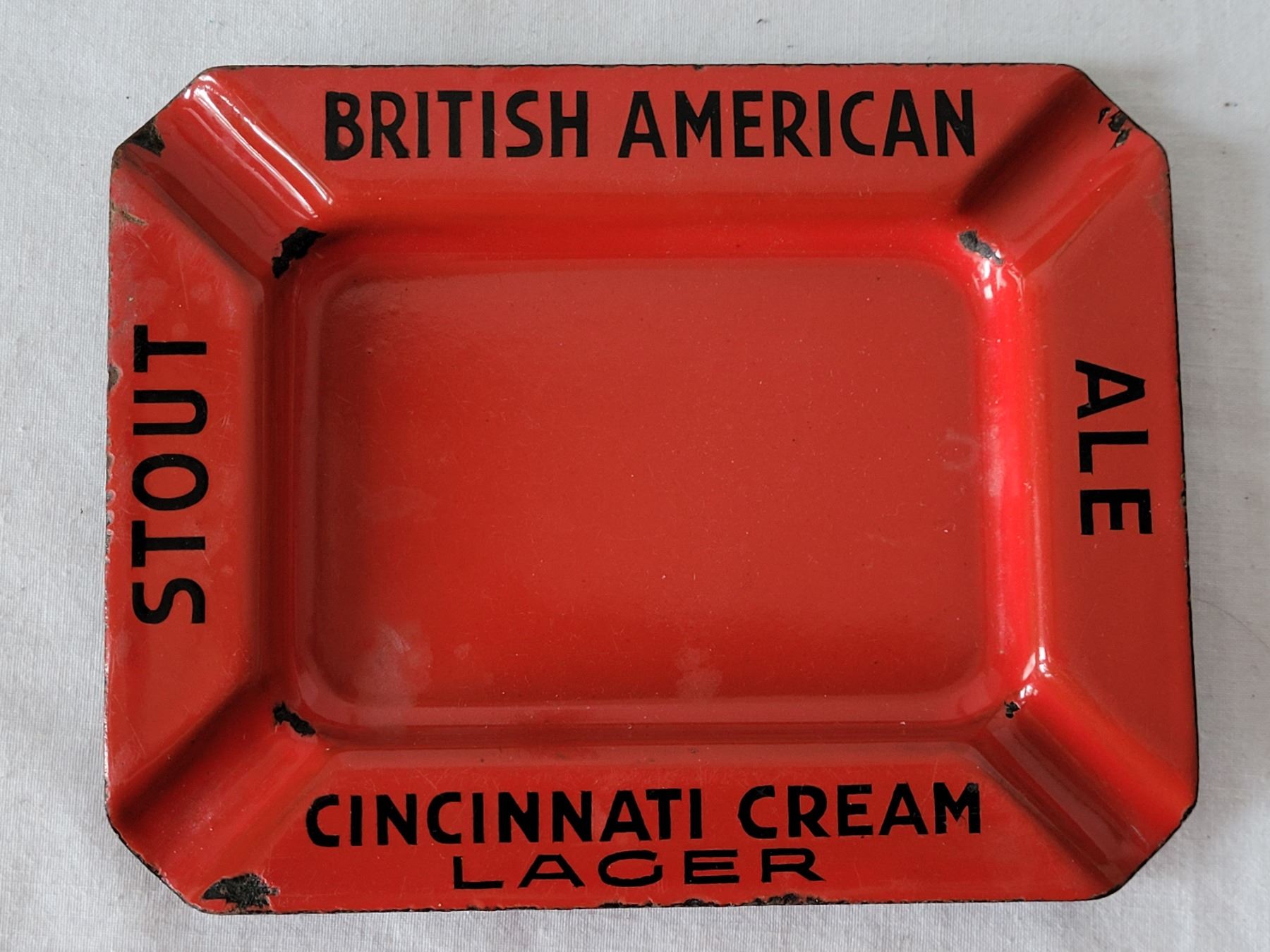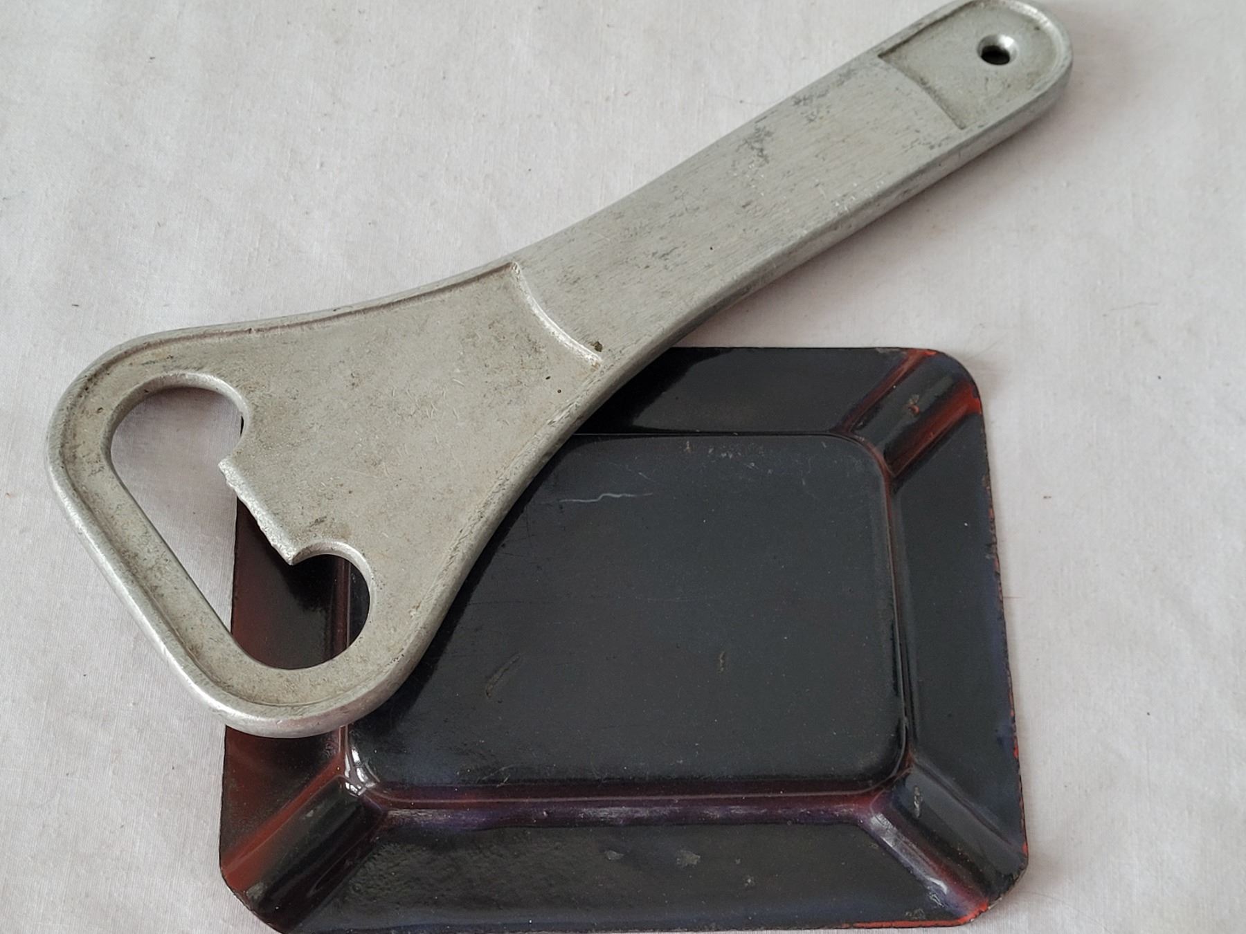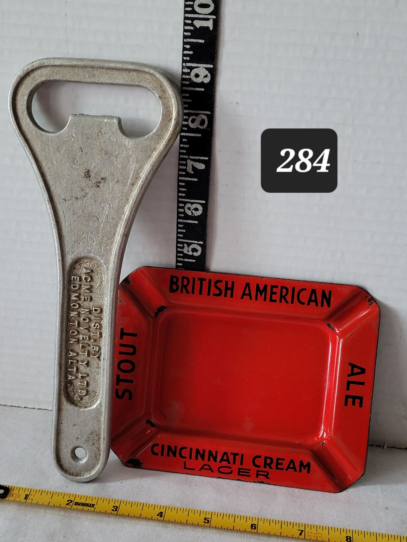 Vtg. Enamel British American ashtray & extra large Edmonton Acme bottle opener.
