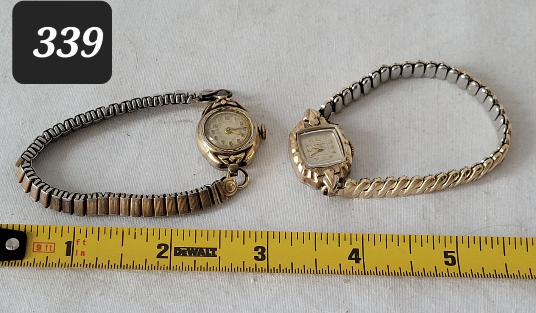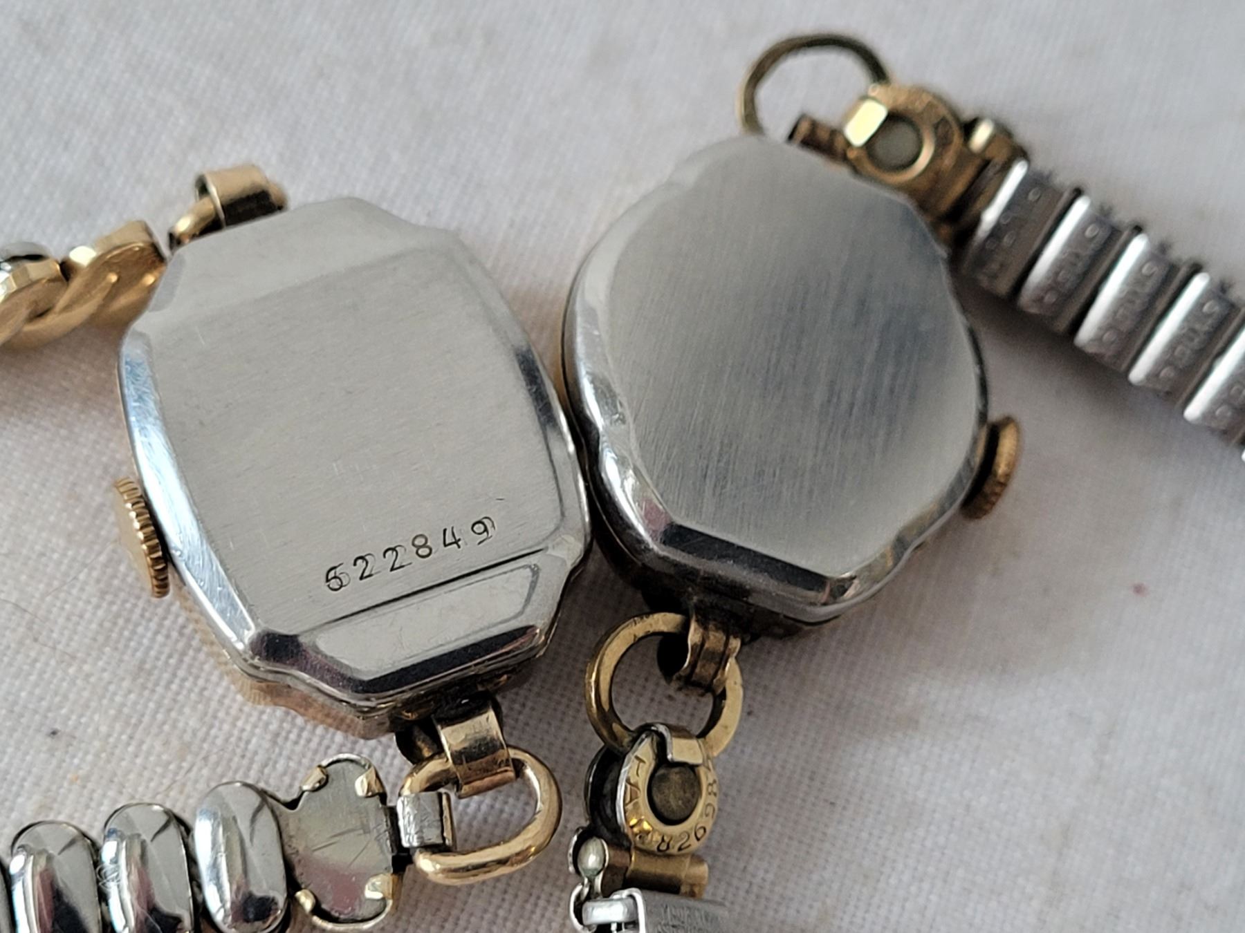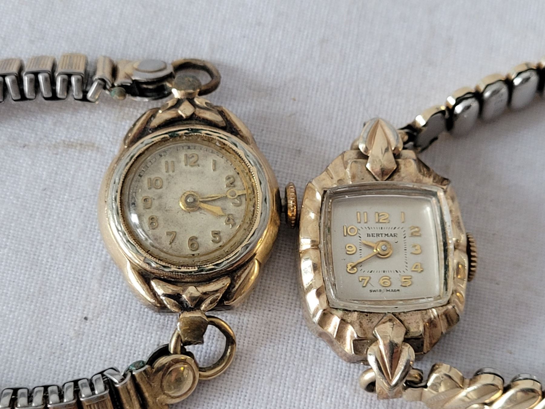 Vtg. Manual wind ladies watches. Swiss movements. 15 & 17 jewels, 1 strap made in W. Germany. Not working.