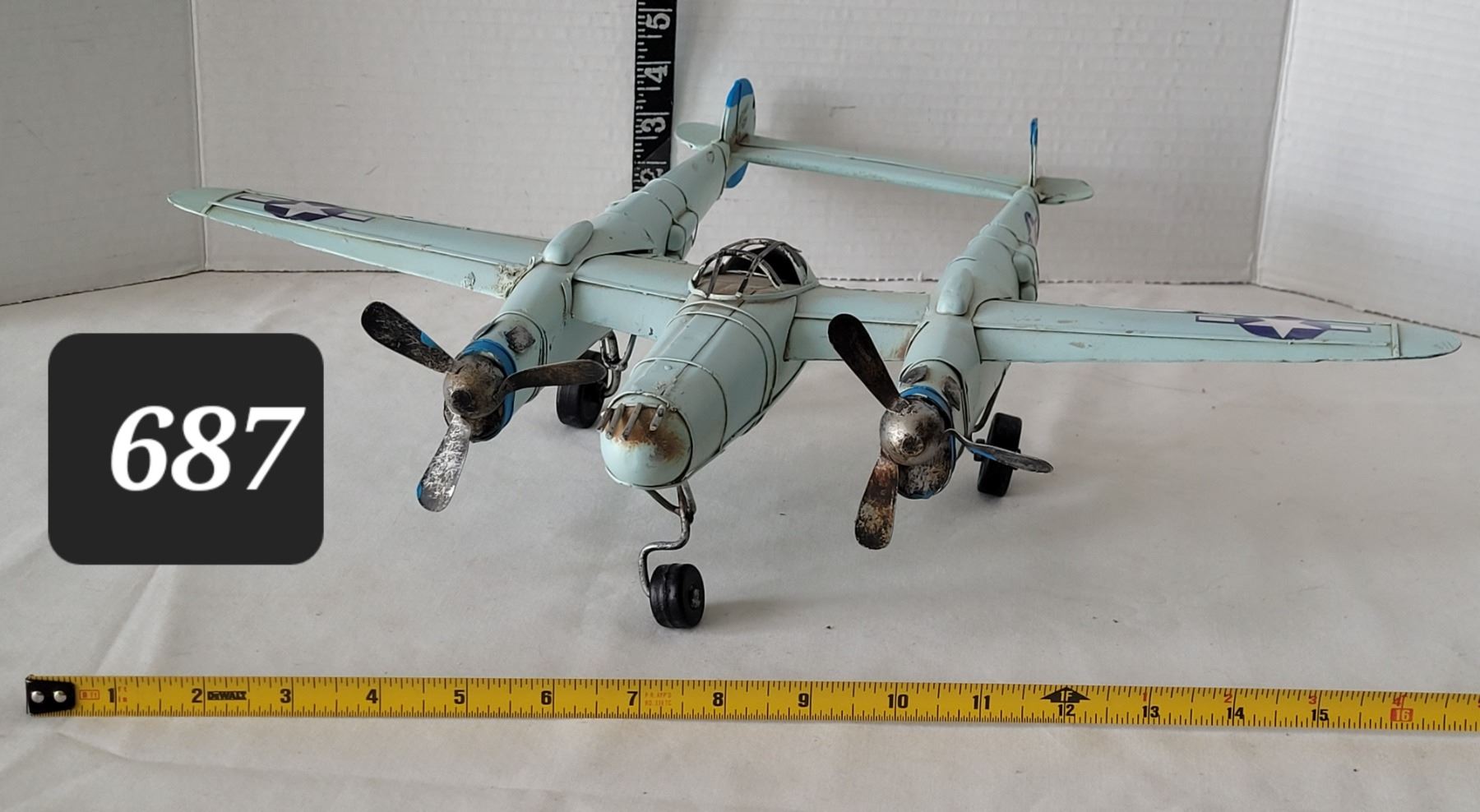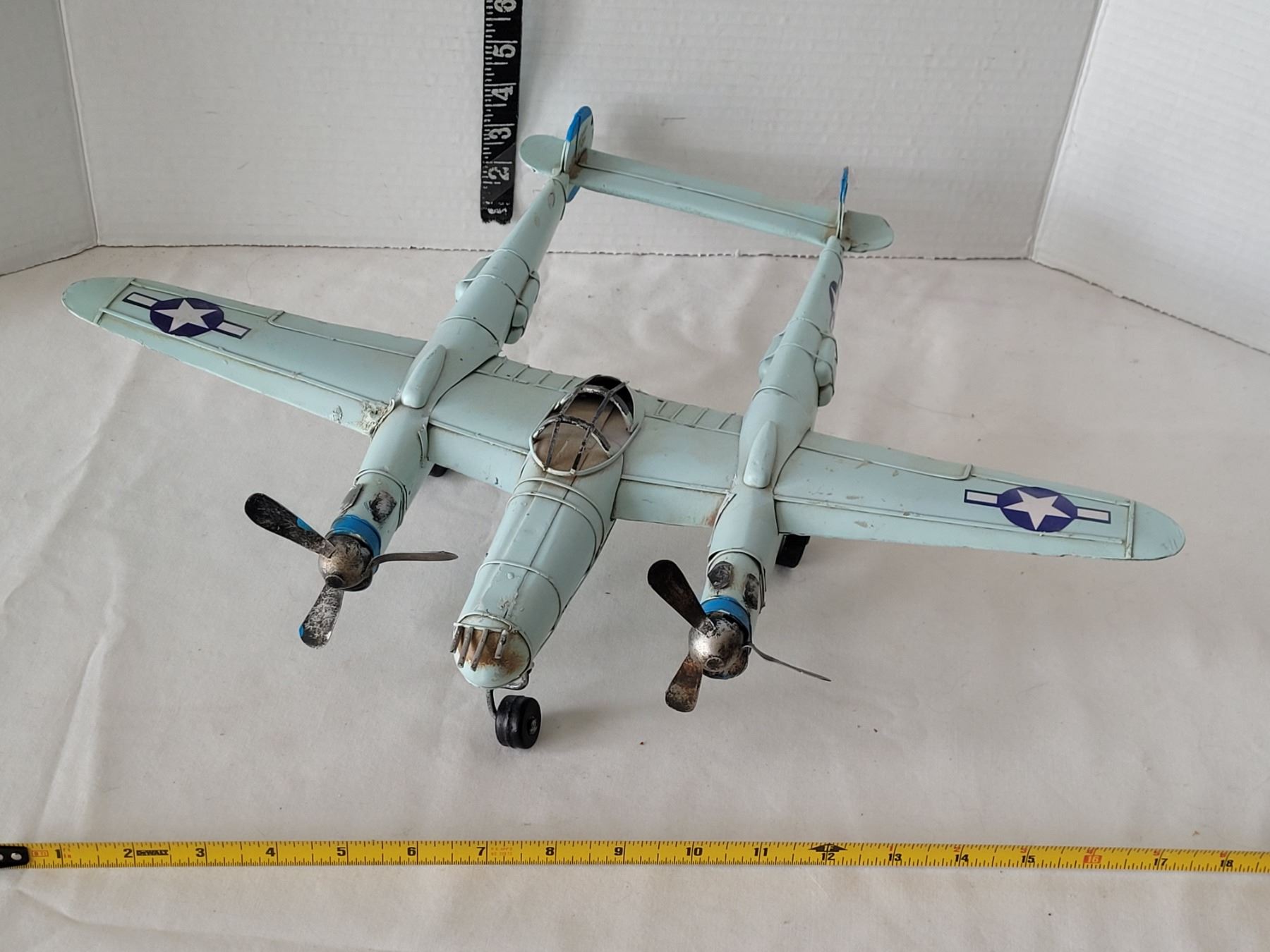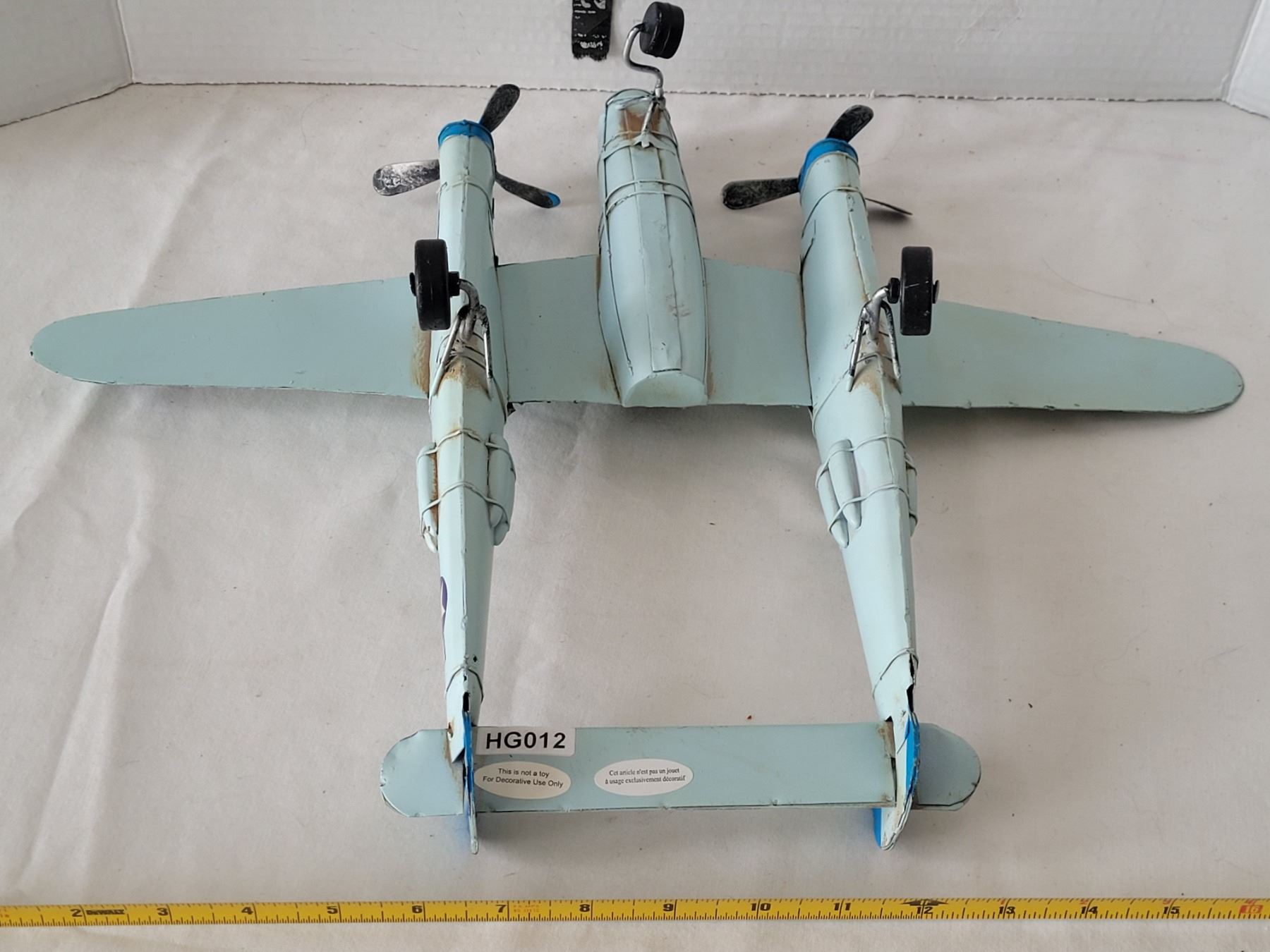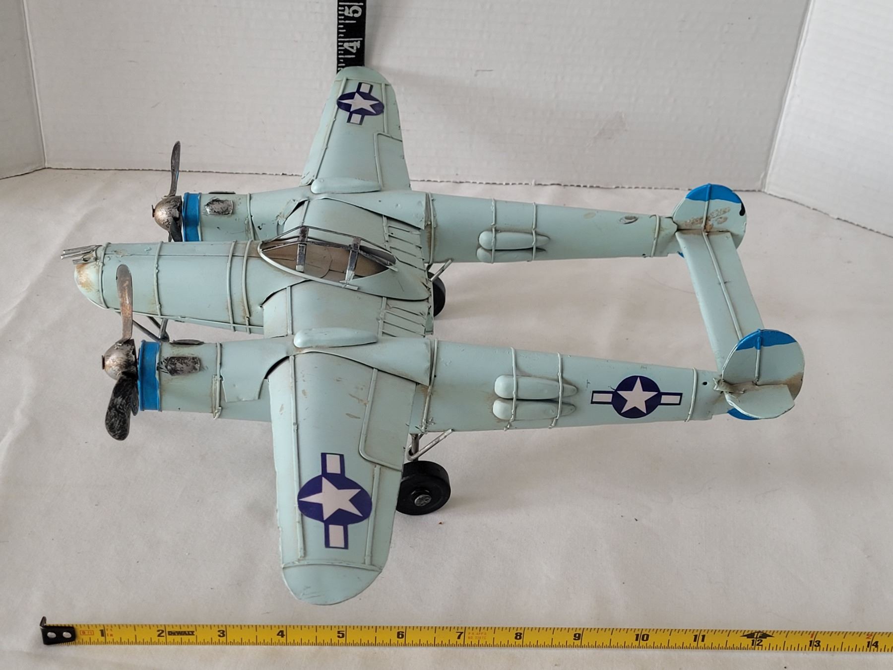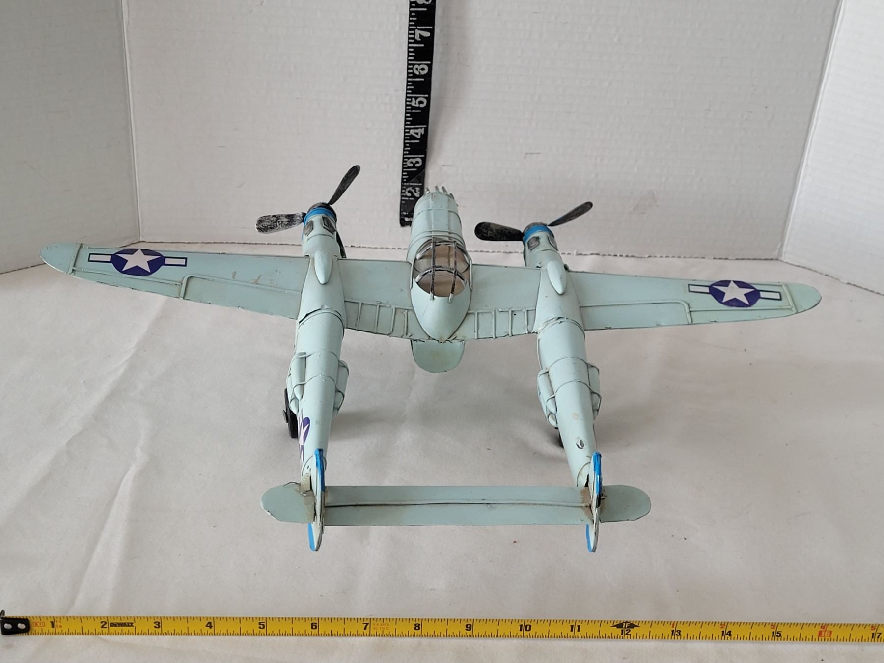 Vtg. P-38, Lightning style, light blue tin metal military airplane.