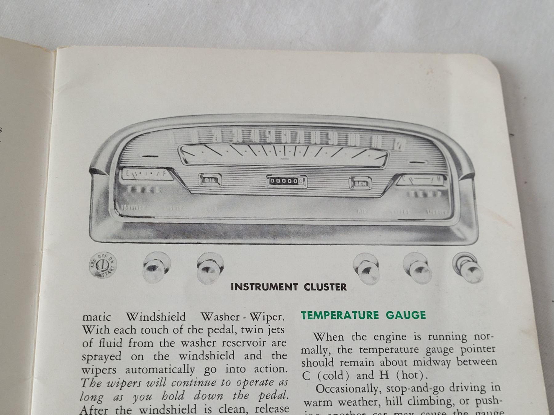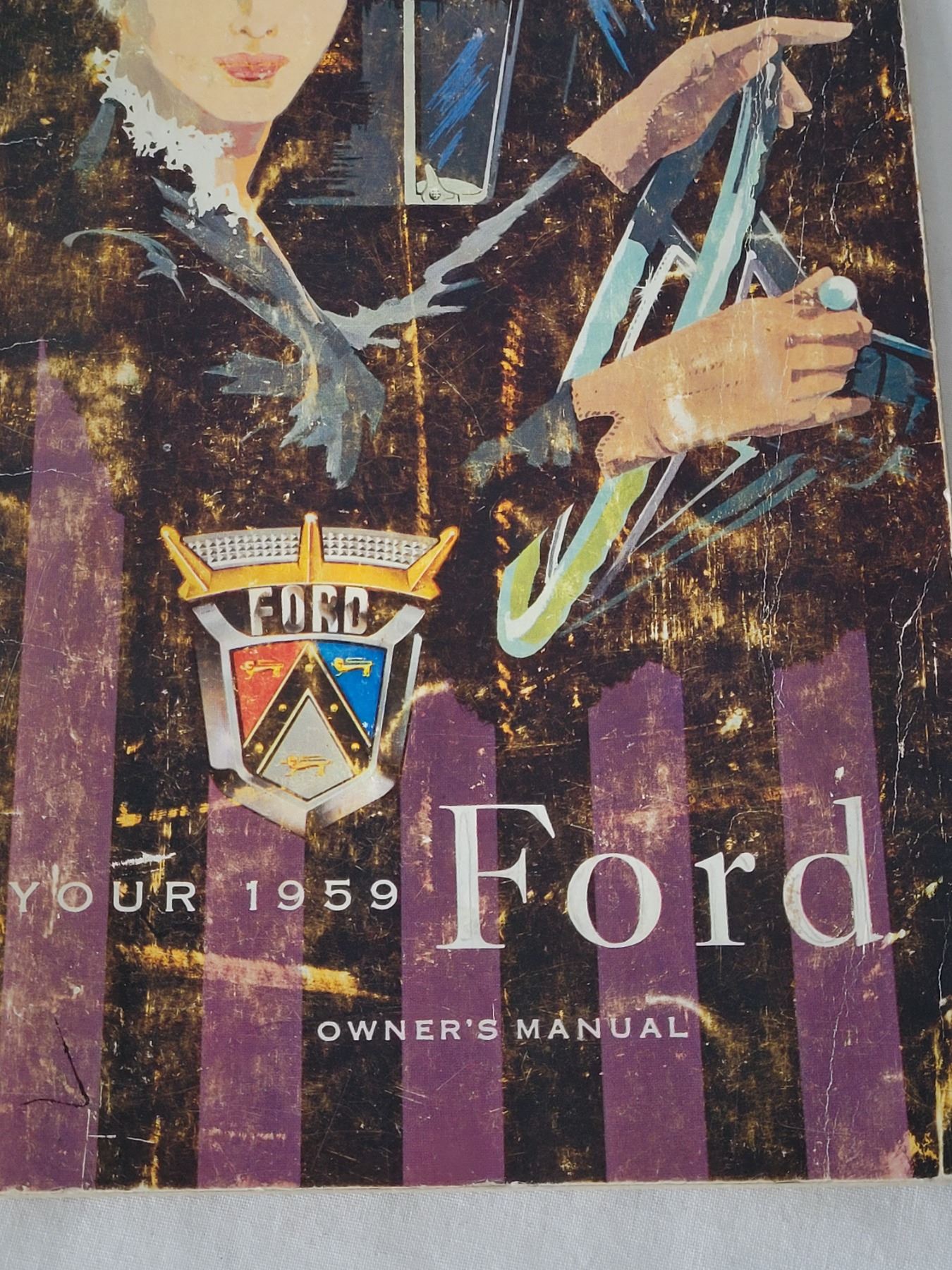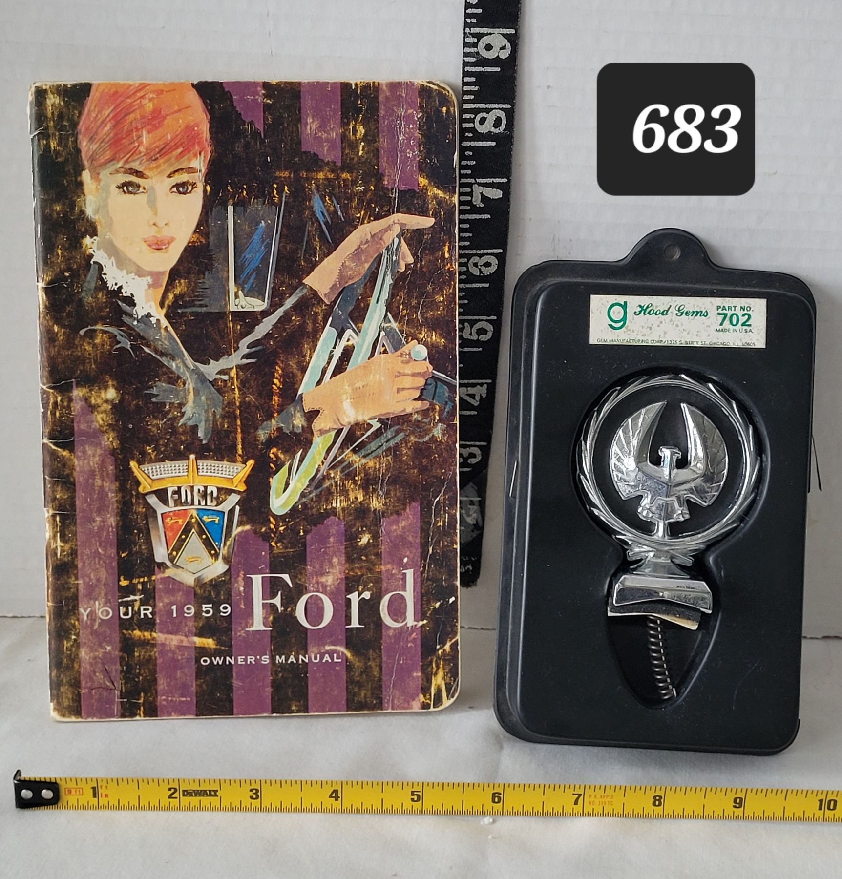 Vtg. ThunderBird hood ornament & 1959 Ford owners Manual.