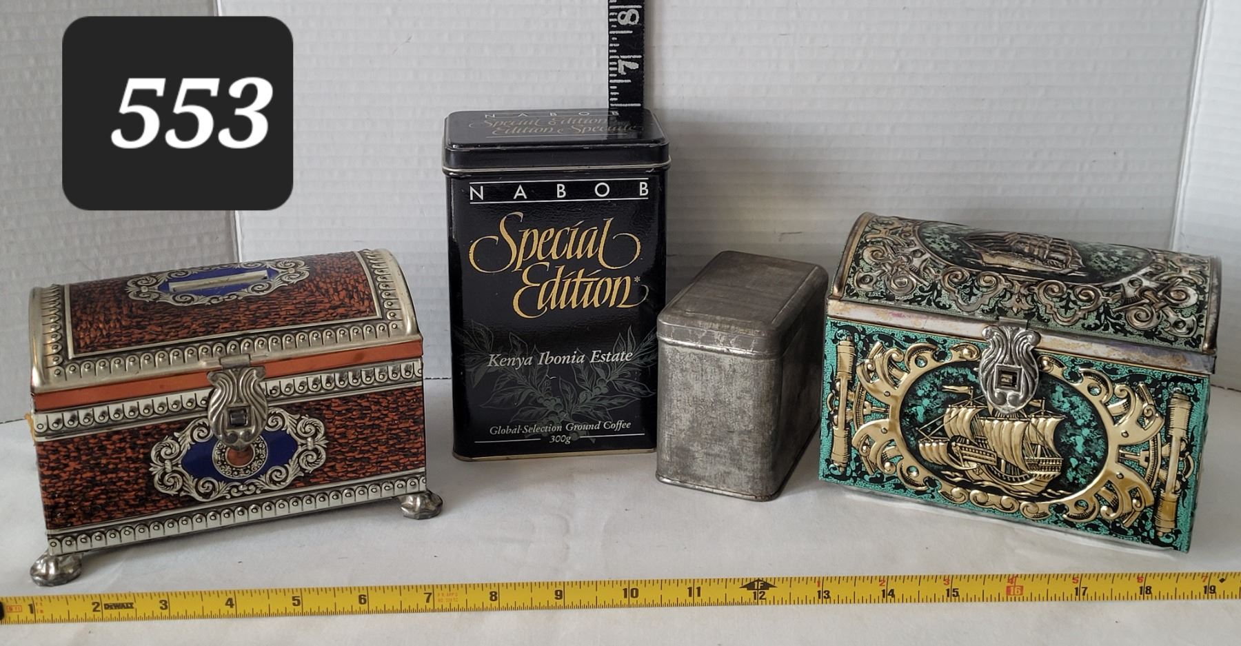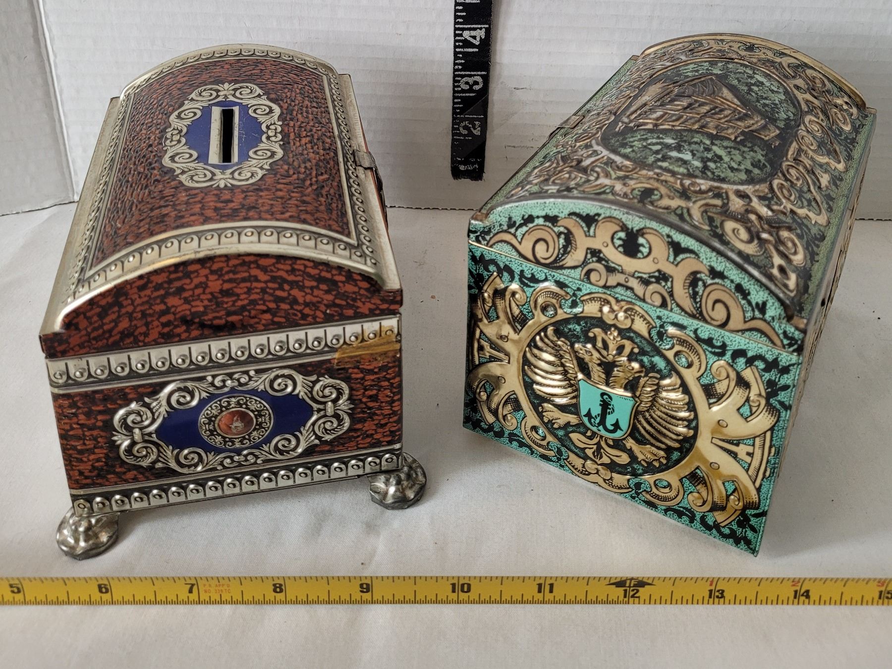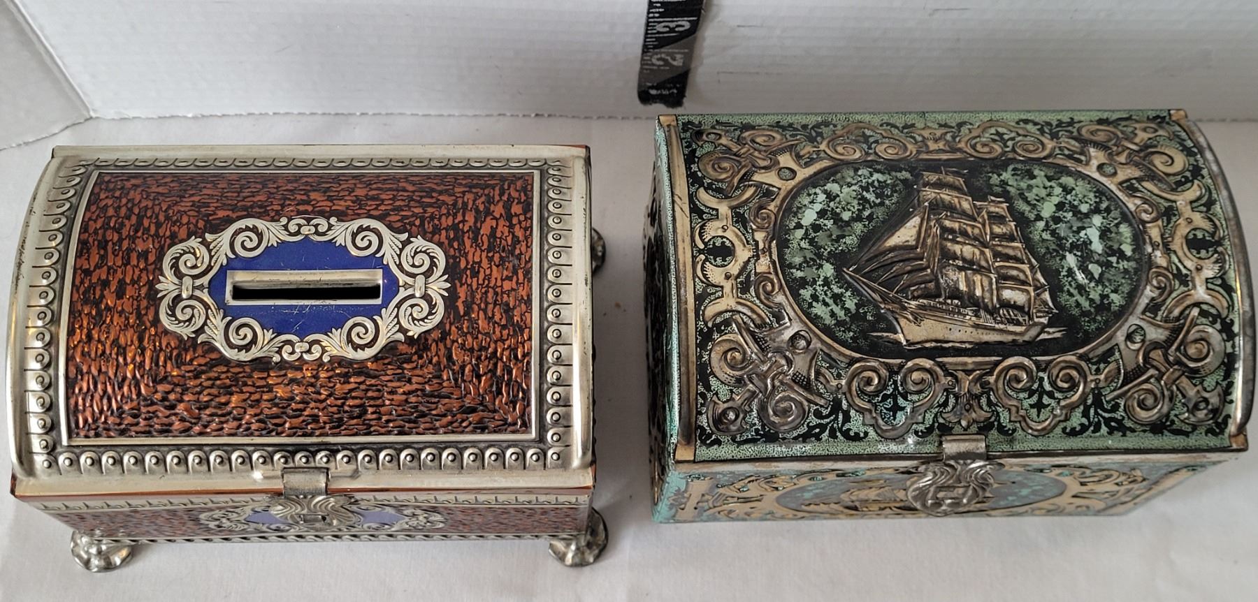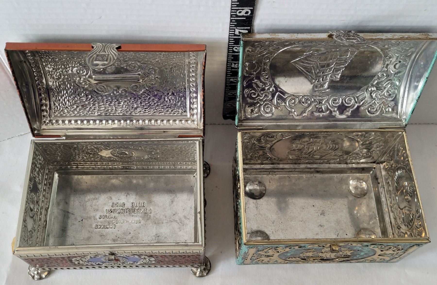 Vtg. Tins. Includes & Blue Bird Confectionary Litho Tin bank (England) & confectionary Ship Tin.