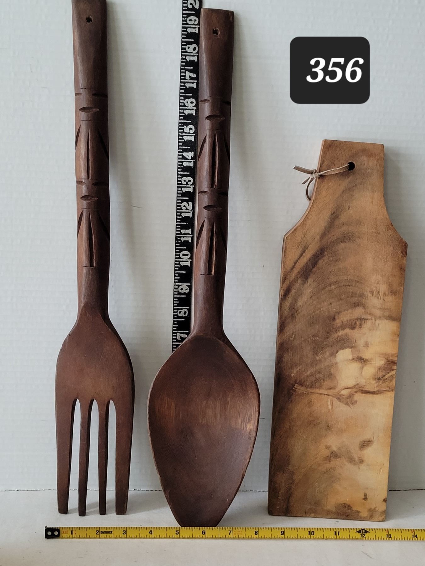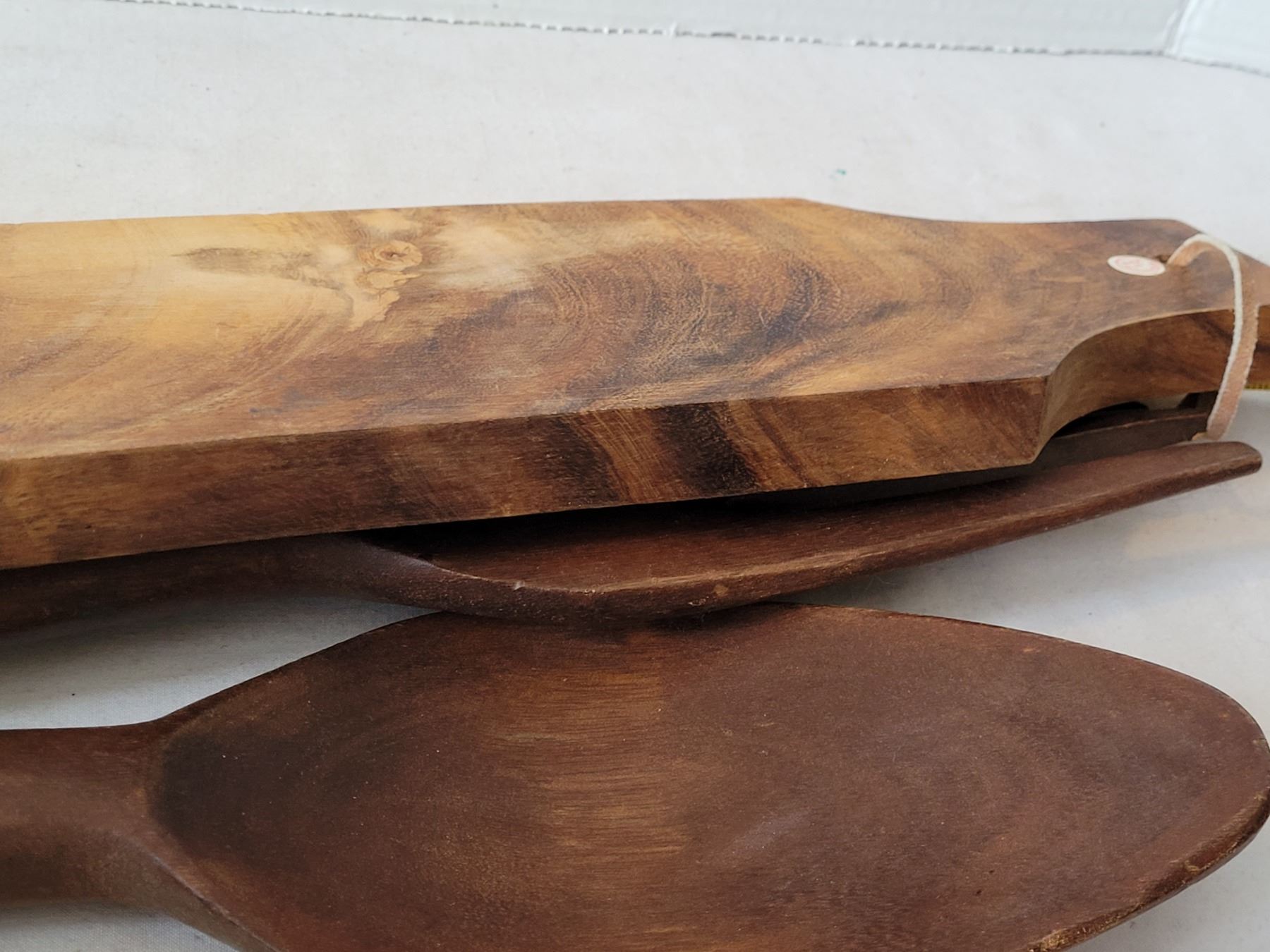 Vtg. Wood fork & spoon wood wall decor 20”& cutting board made in thePhilippines.