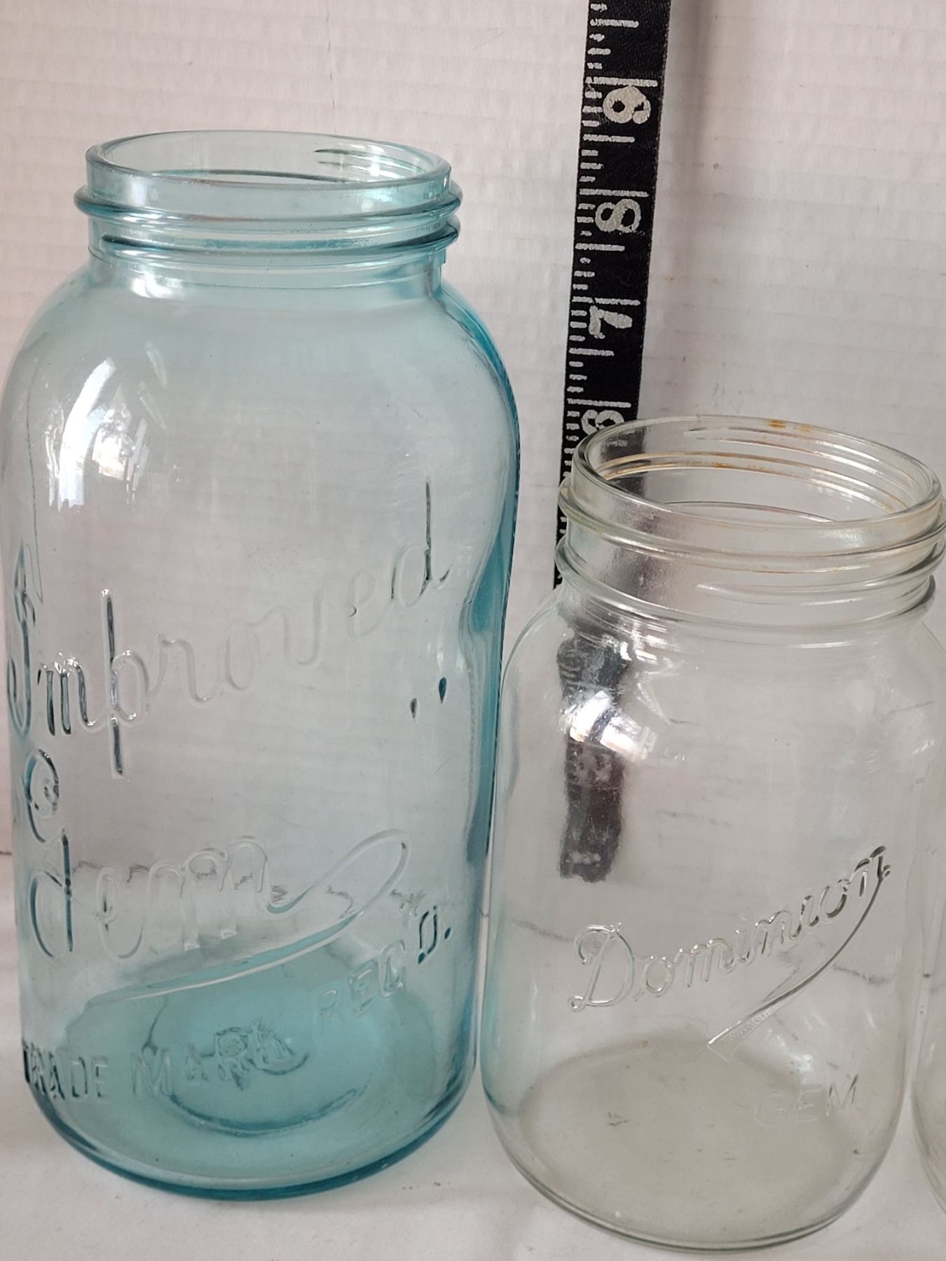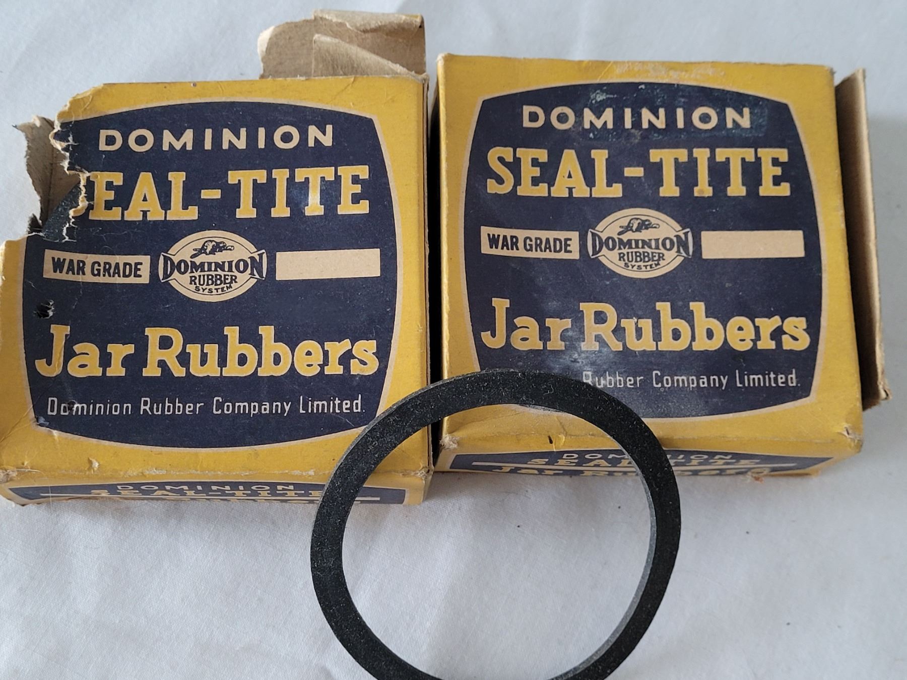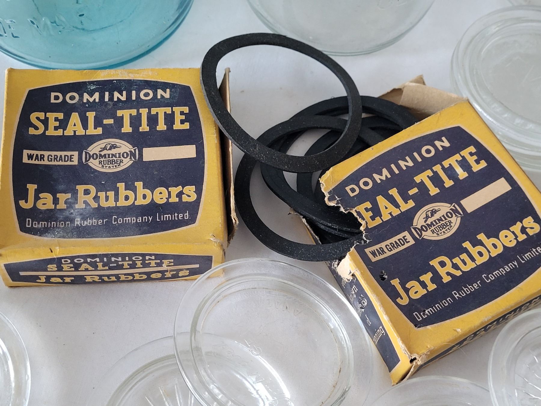 Vtg. canning jars & seals. War grade rubber seals, Crown, Dominion, Consumer, Improved gem & glass l
