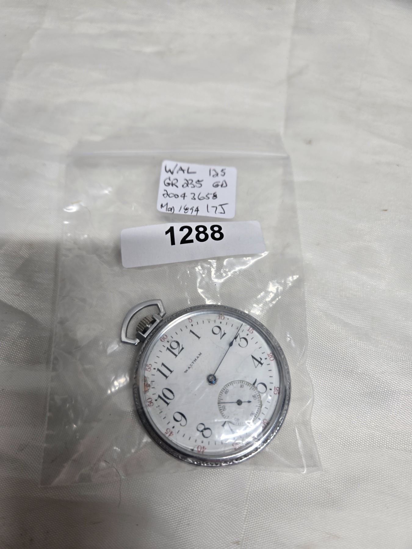 WALTHAM 12S, 17J PW, NEEDS HOUR HAND, WORKS