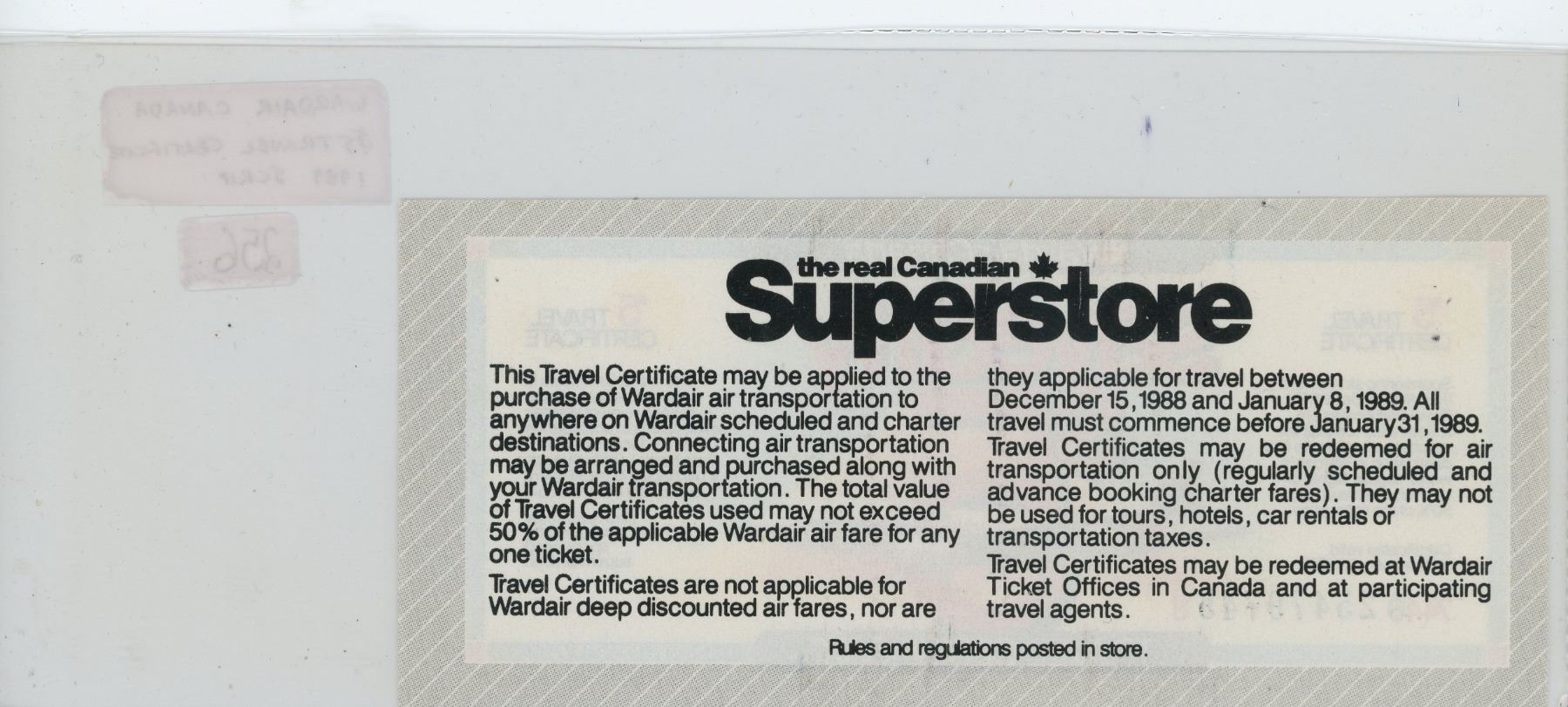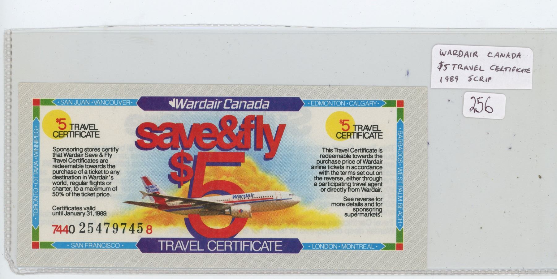 WARDAIR CANADA 1989 $5 TRAVEL CERTIFICATE SCRIP. UNC.