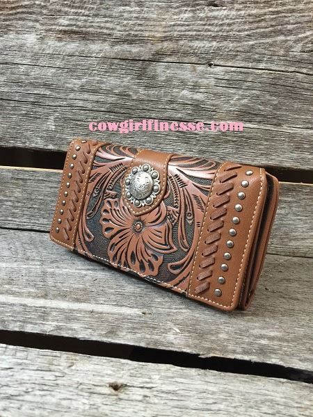 WESTERN TOOLED BROWN TRIFOLD/ZIPPER WALLET