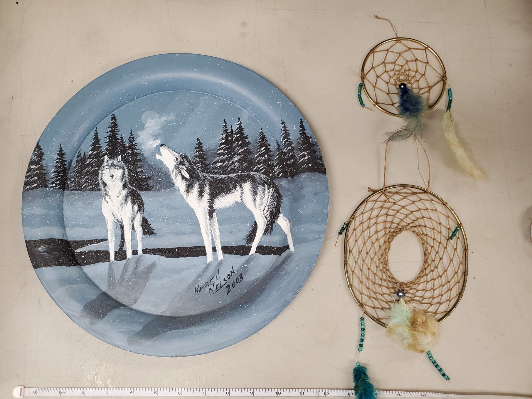 WOLD PAINTING ON PLATE (KAREN NELSON), 2 DREAM CATCHERS