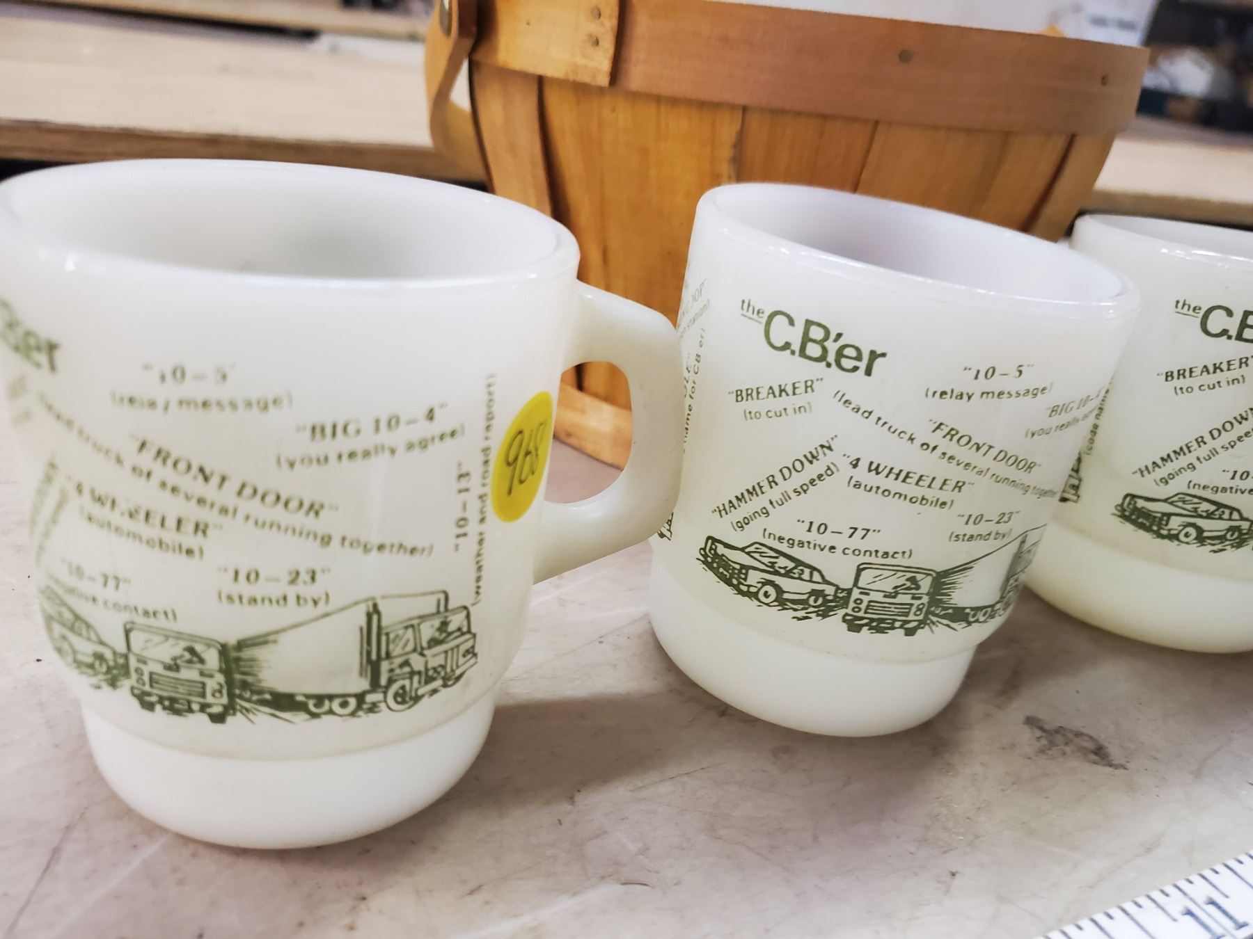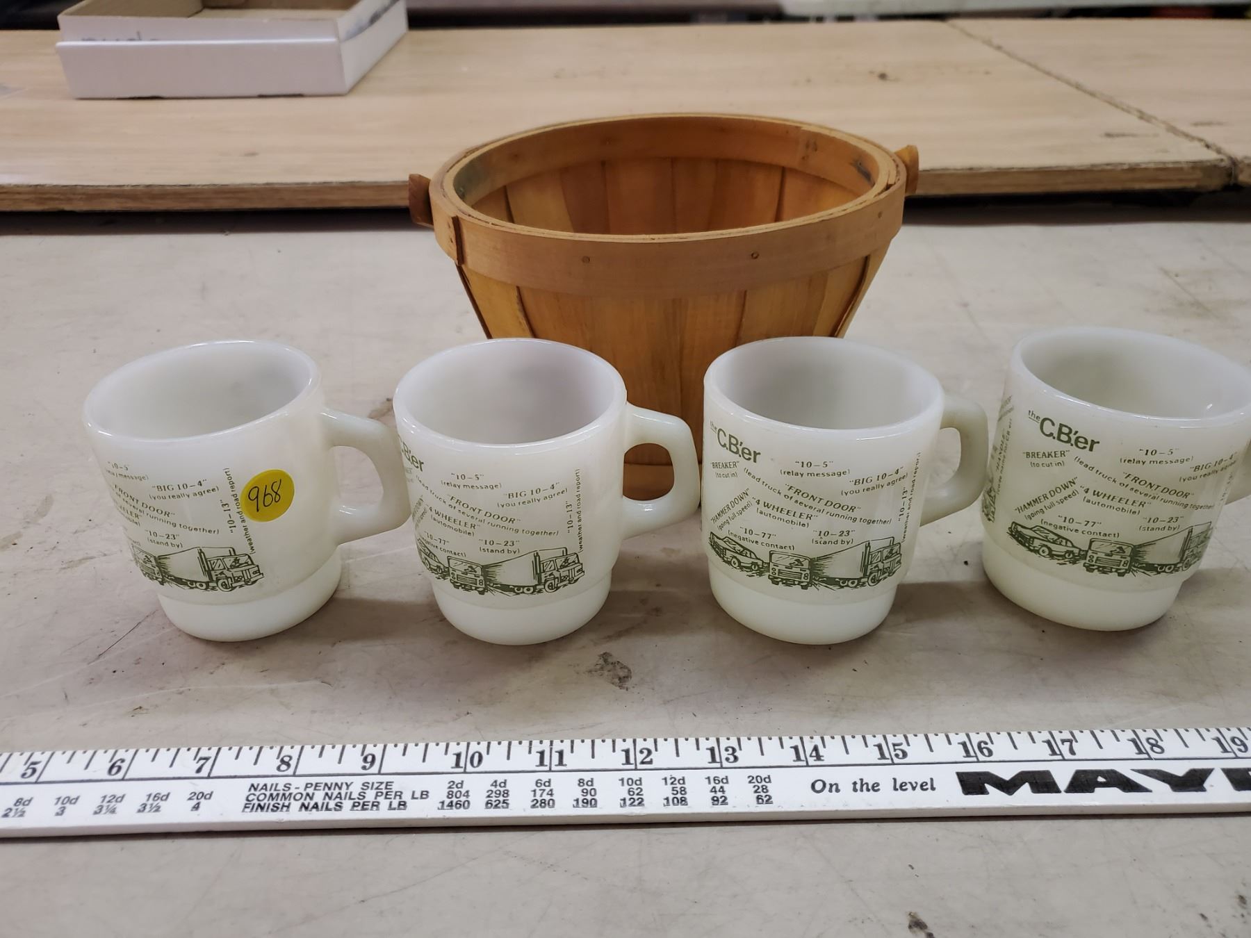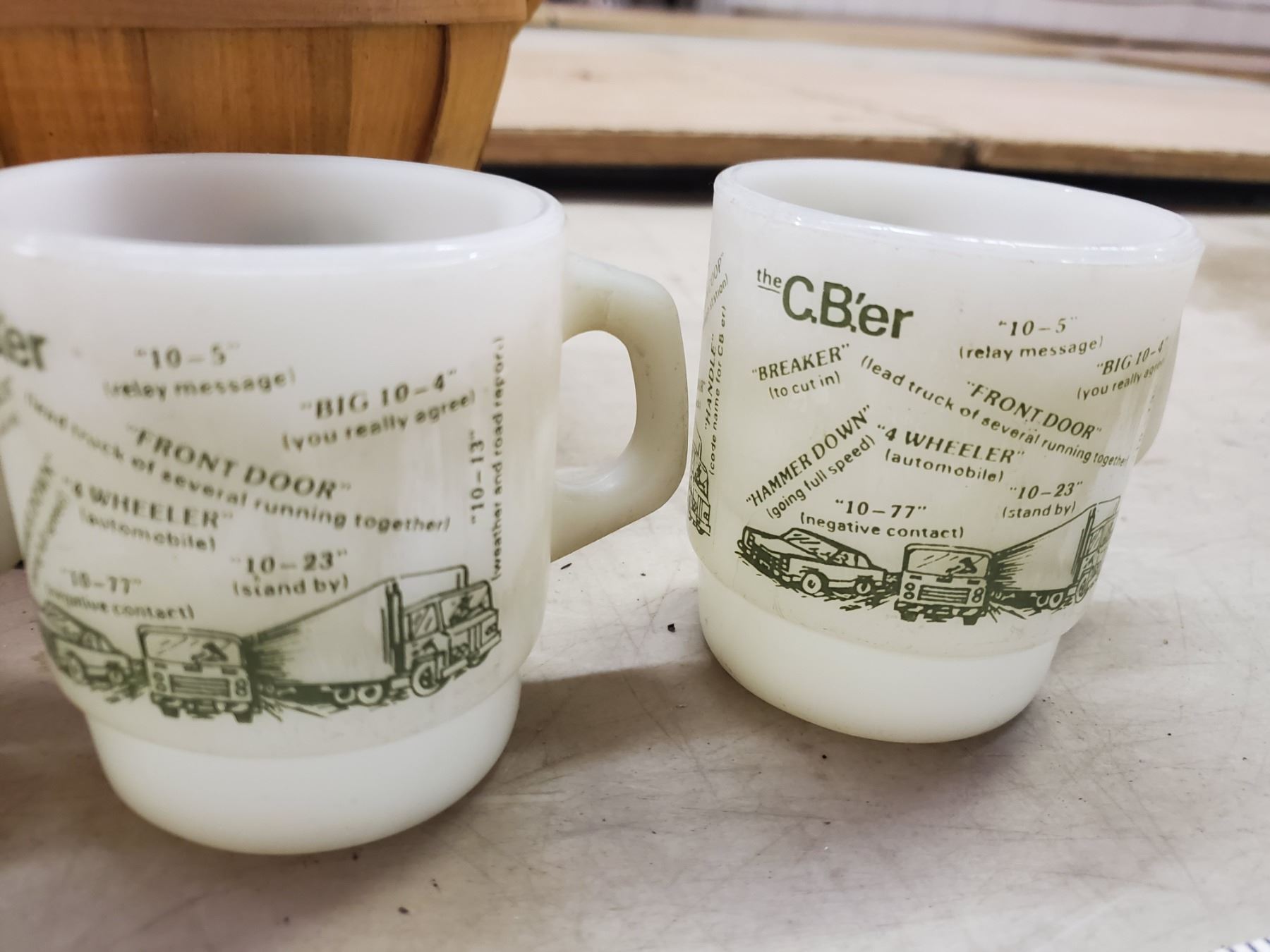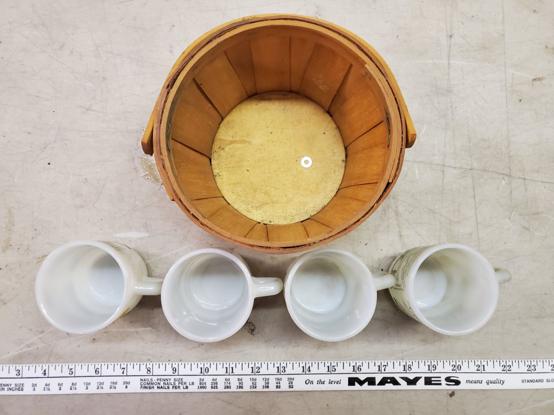 WOOD BASKET WITH 4 FIRE KING MUGS