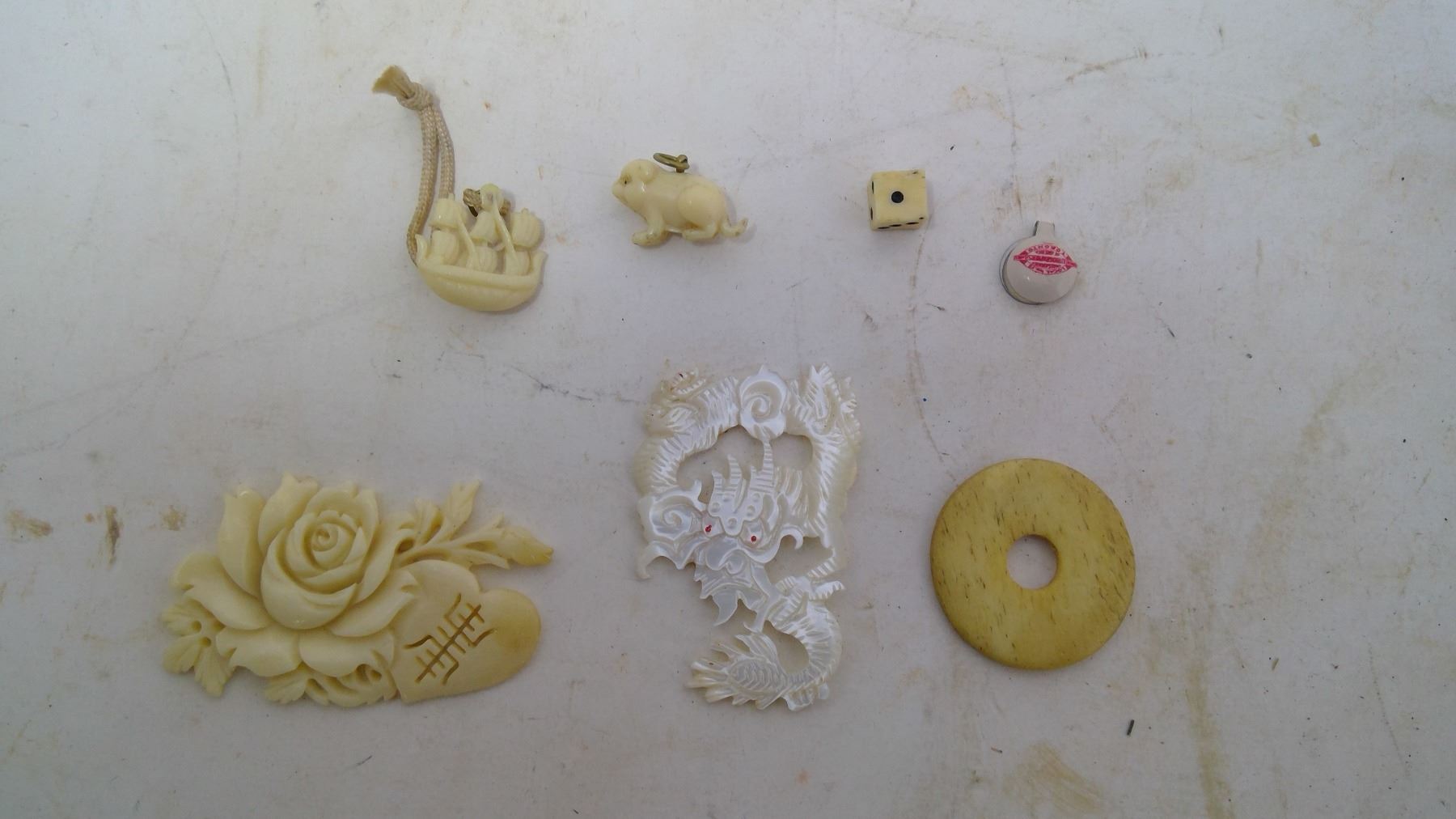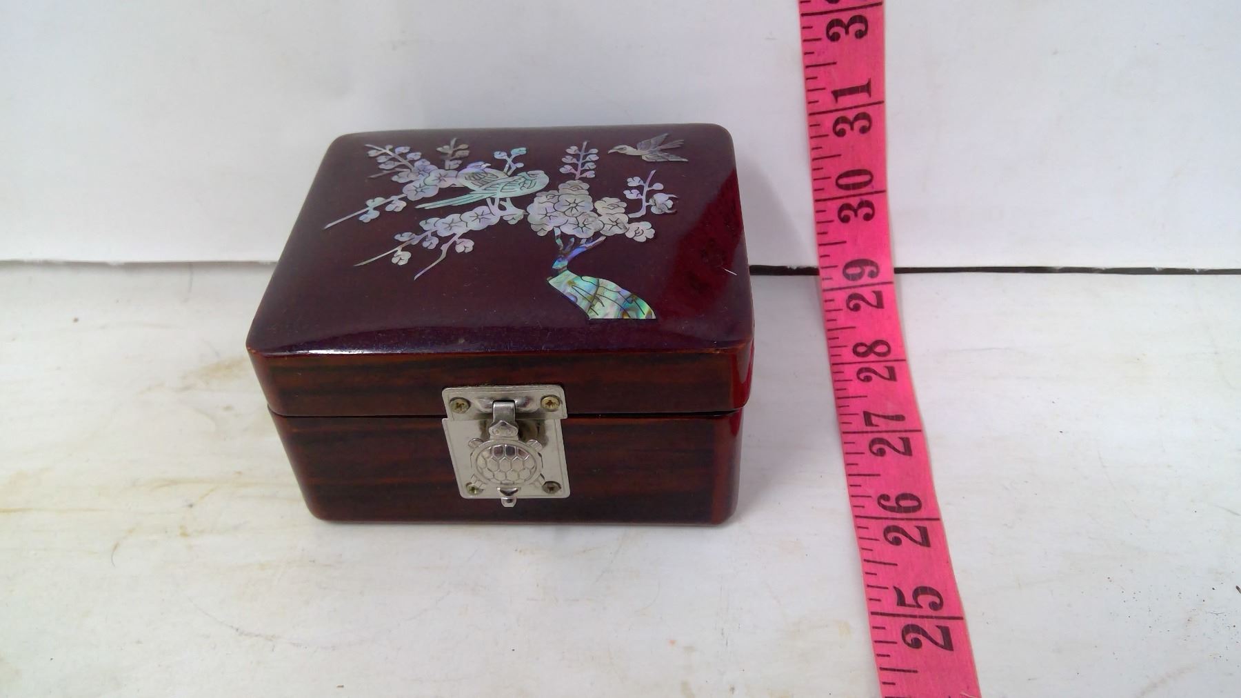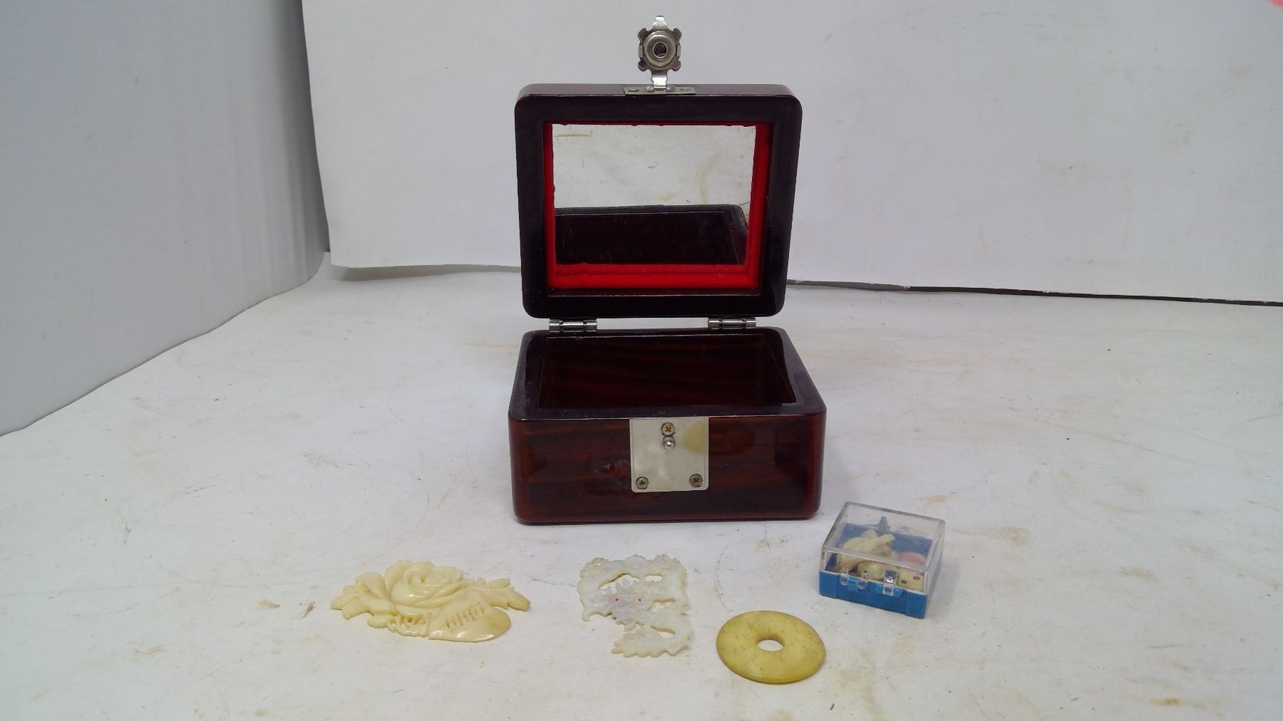 WOOD TRINKET BOX WITH MOTHER OF PEARL AND CONTENTS
