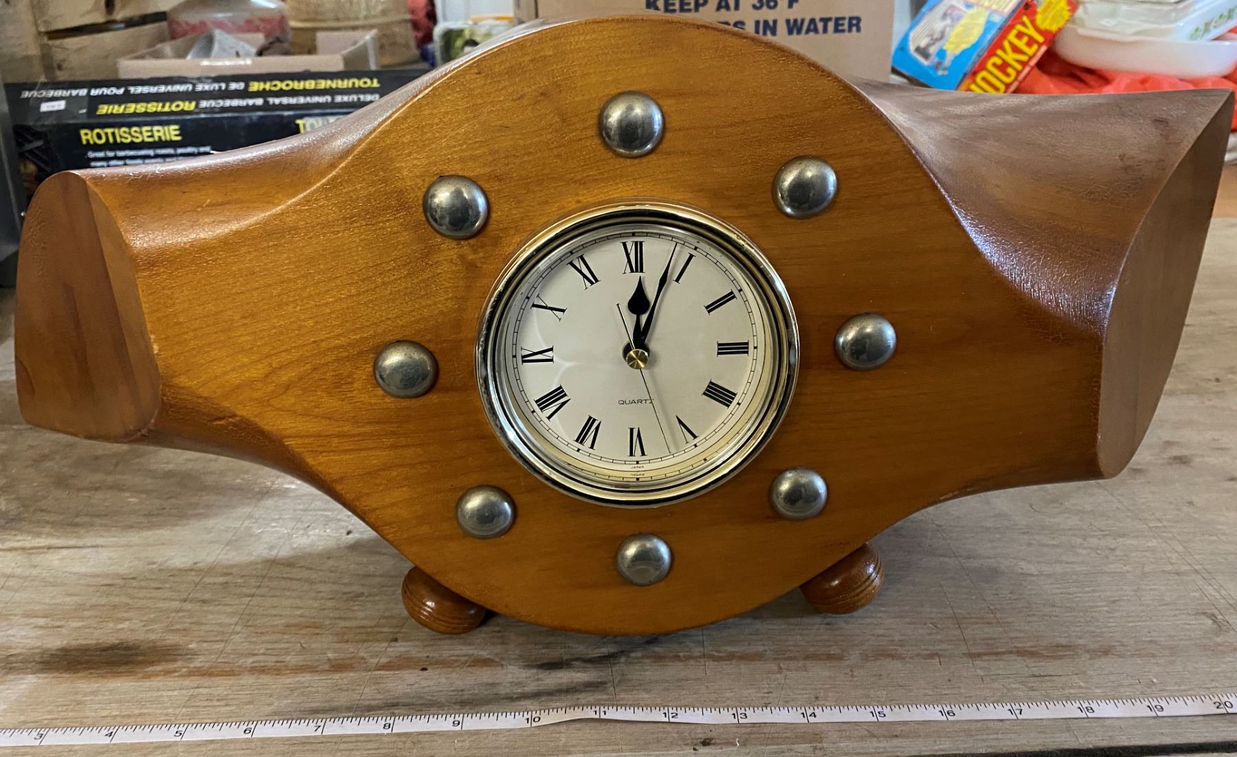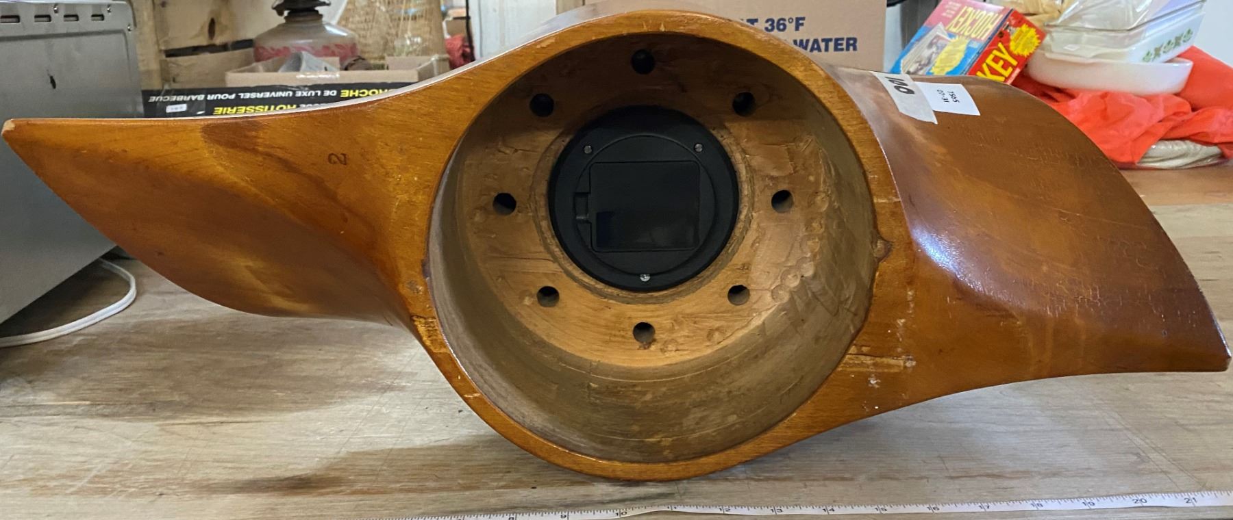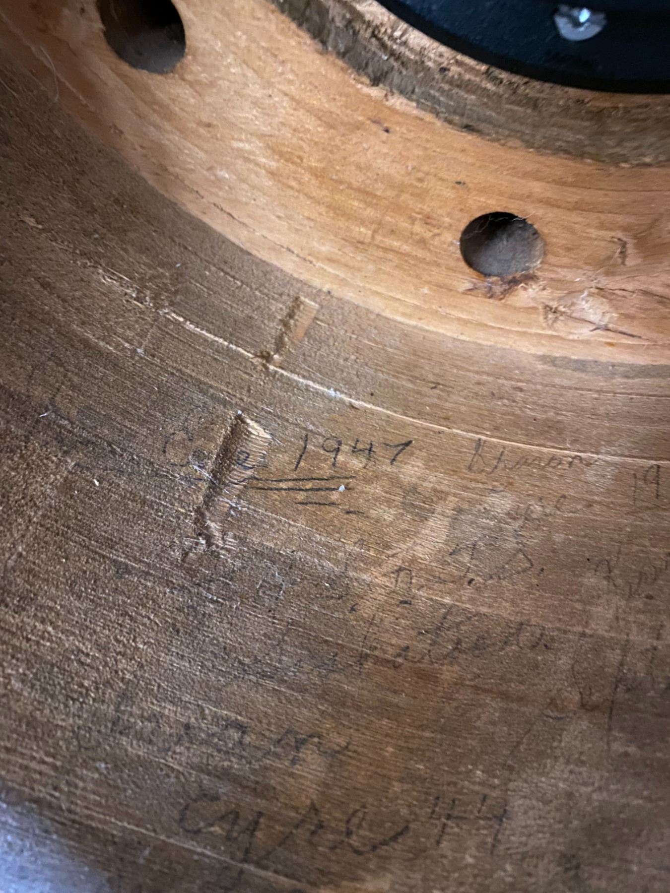WOODEN AIRPLANE PROPELLER MADE INTO CLOCK SIGNED BY PREVIOUS OWNERS SINCE 1947