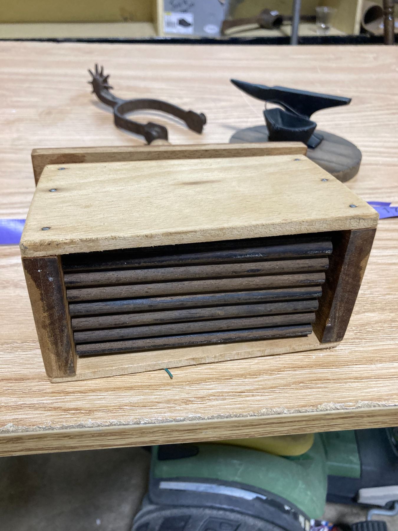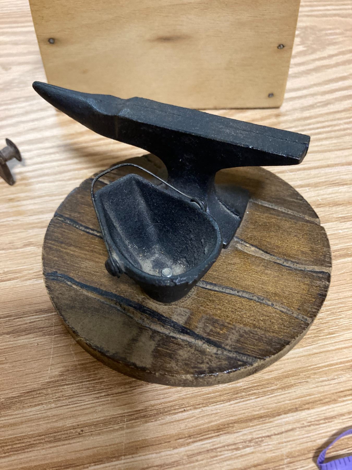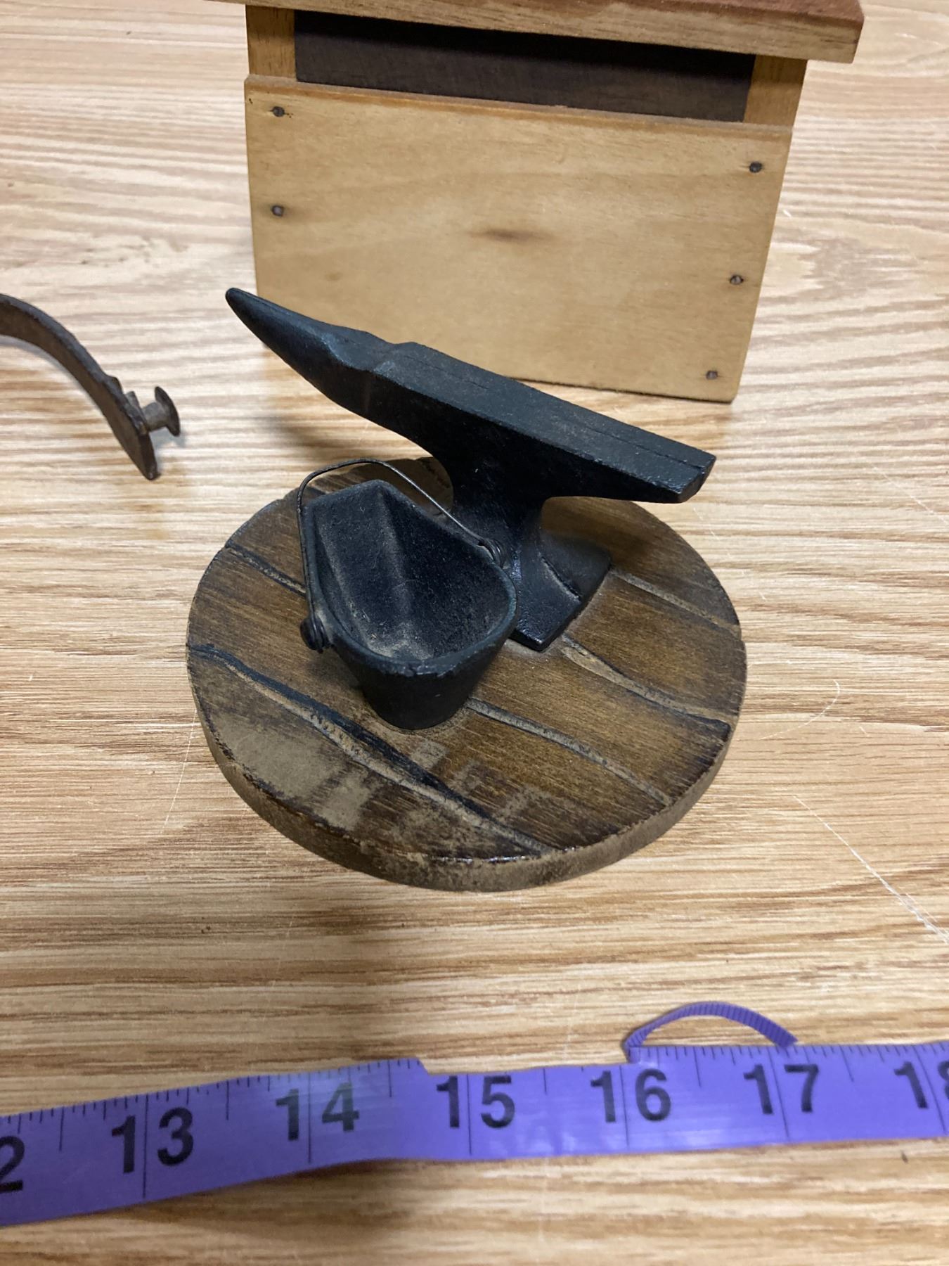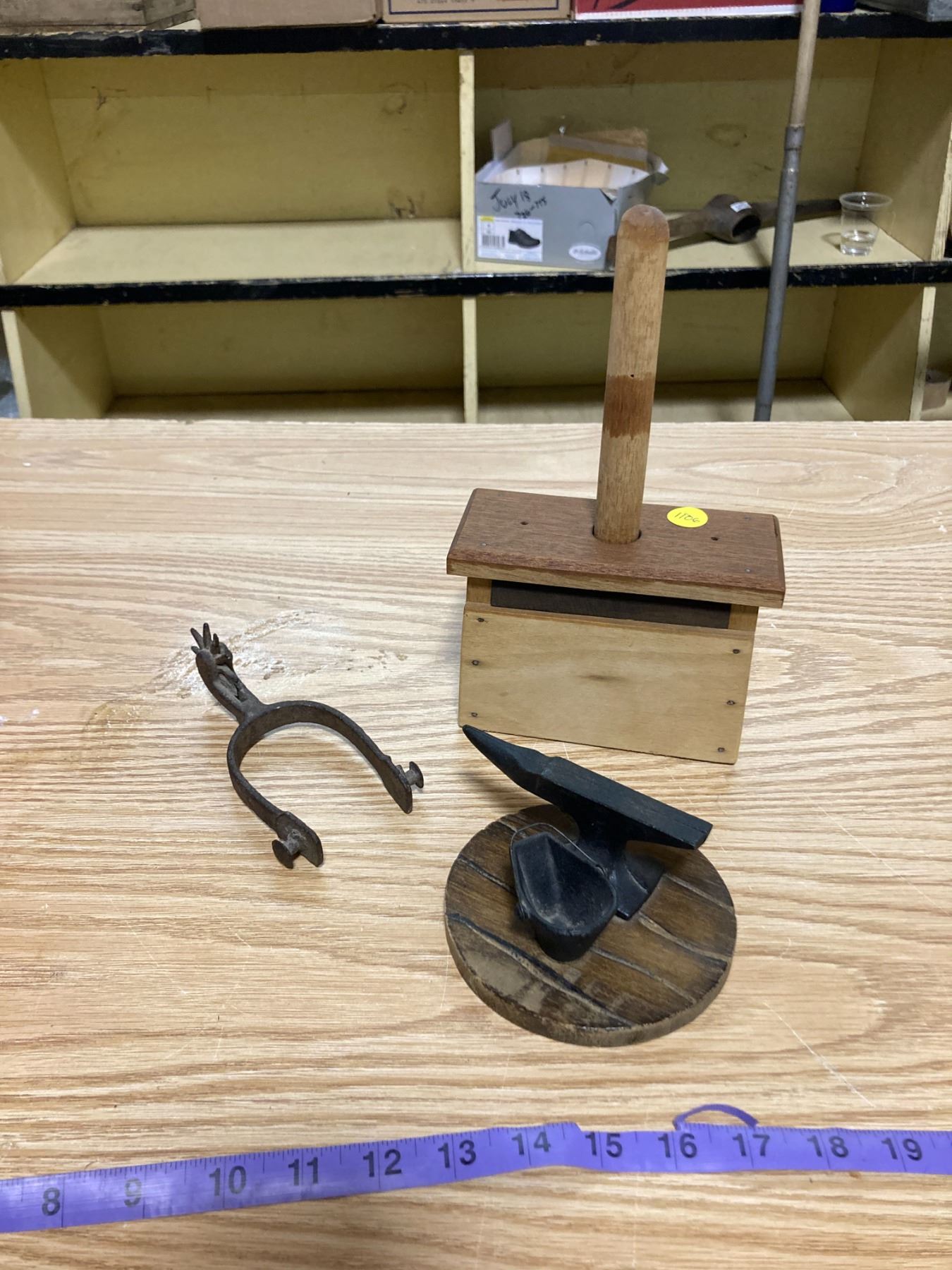 WOODEN BUTTER PRESS + PAIL AND ANVIL FIGERINE + DECRATIVE SPURS