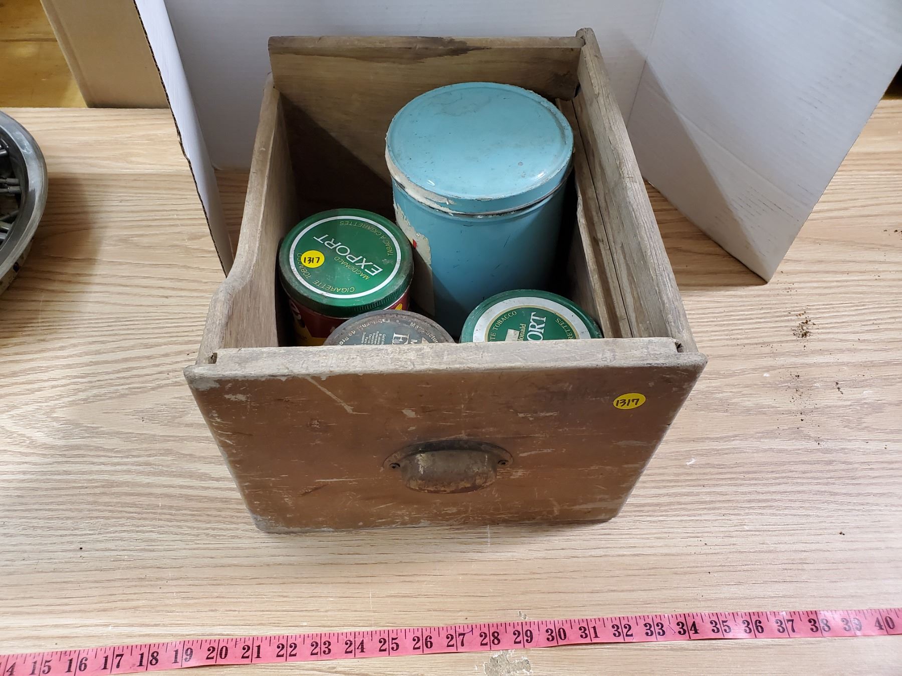 WOODEN DRAWER W/ 3 TOBACCO TINS AND OTHER TIN