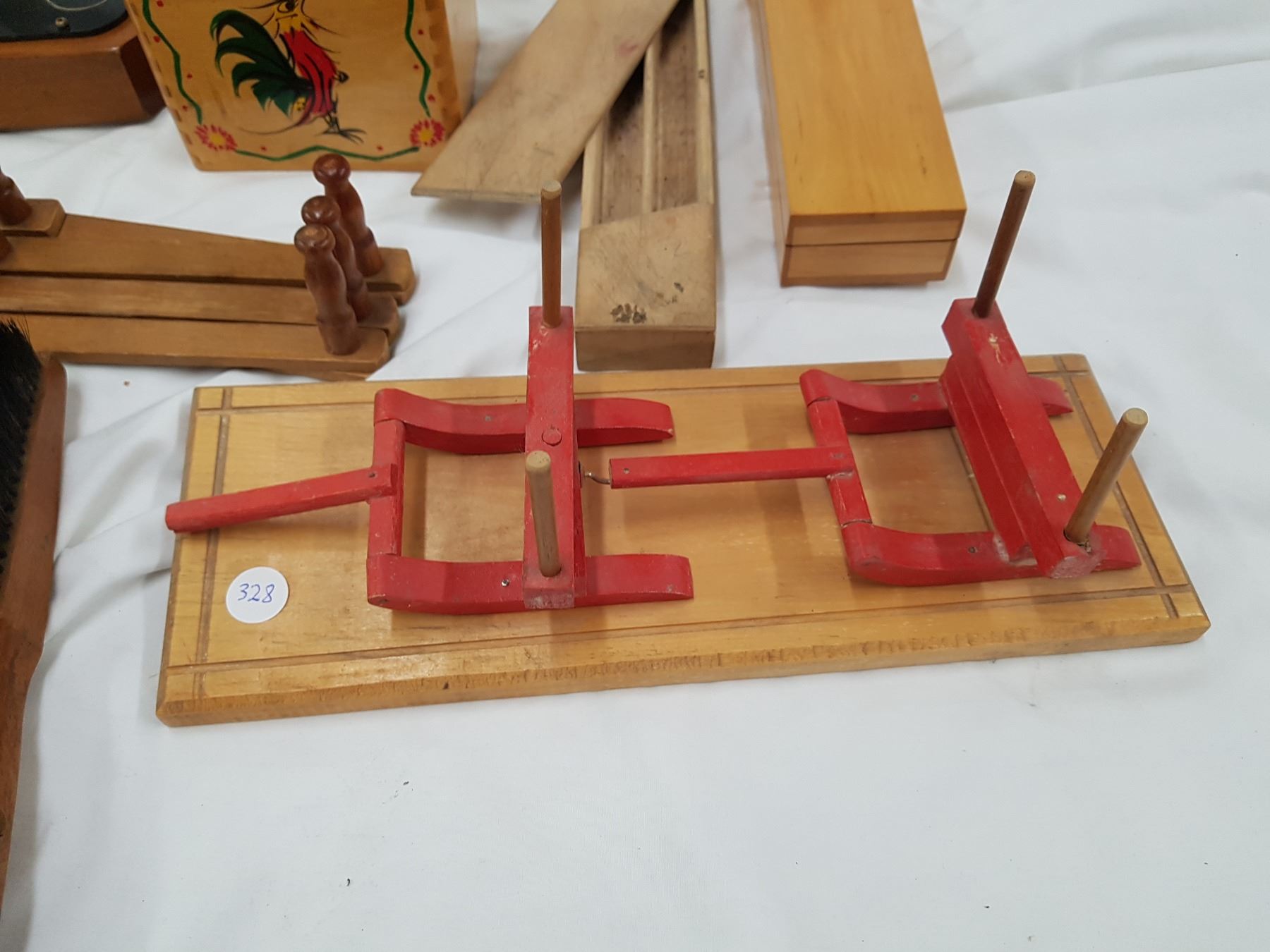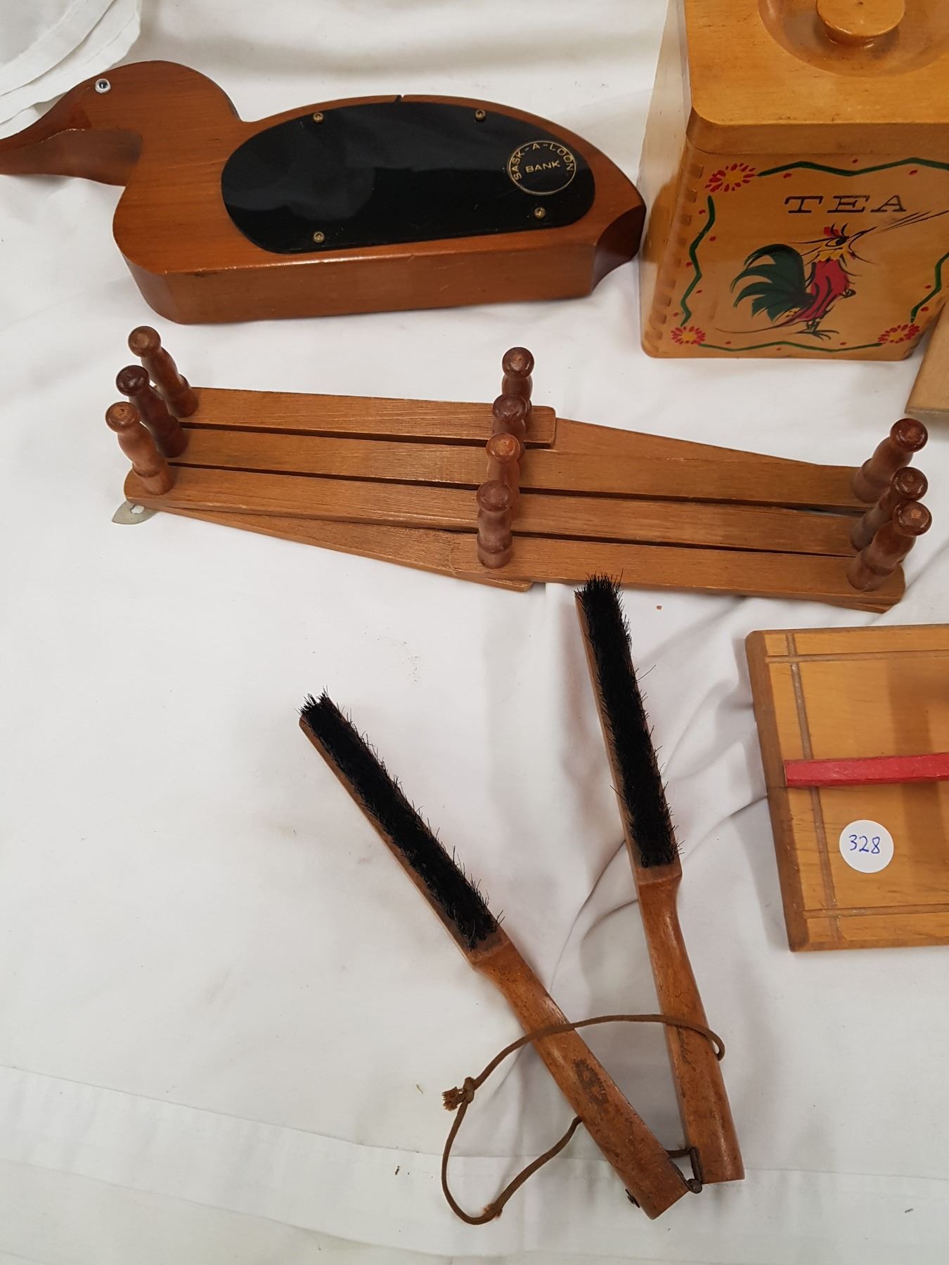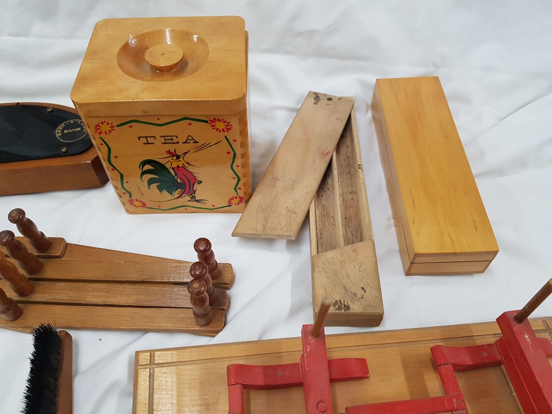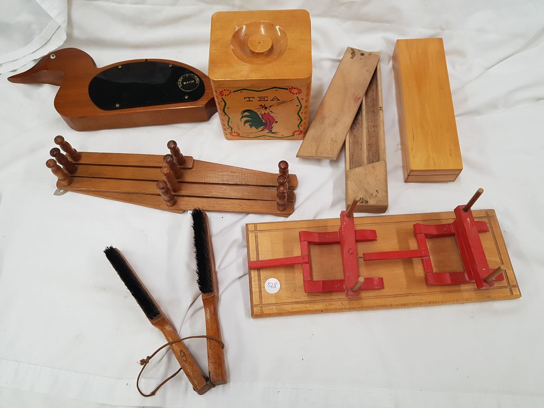 WOODEN ITEM LOT, PIGGY BANK SLED ETC