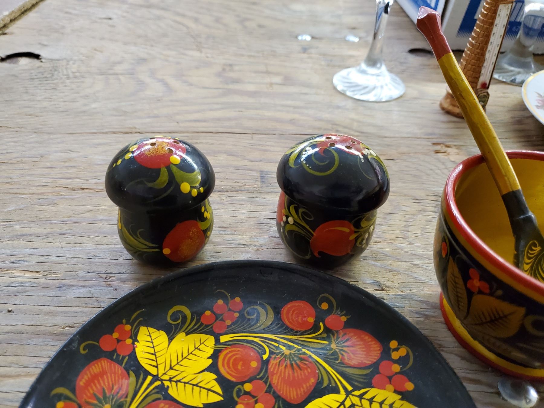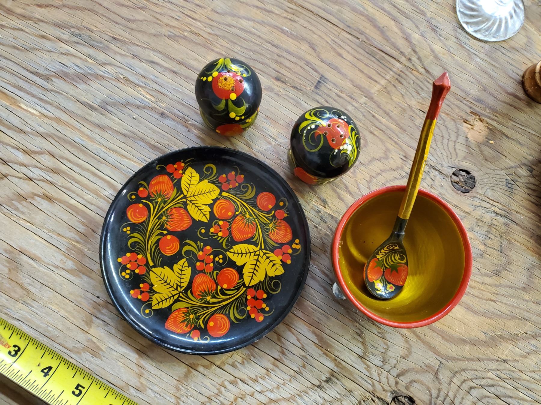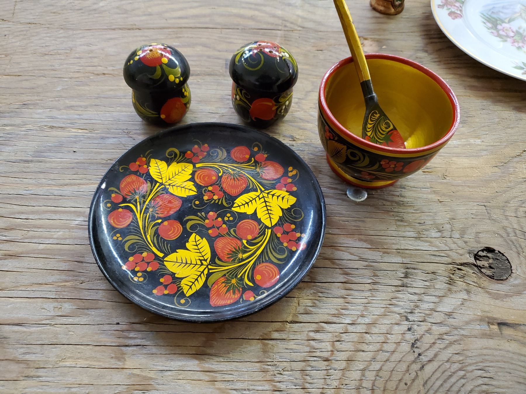 WOODEN PAINTED SALT & PEPPER, PLATE, BOWL & SPOON