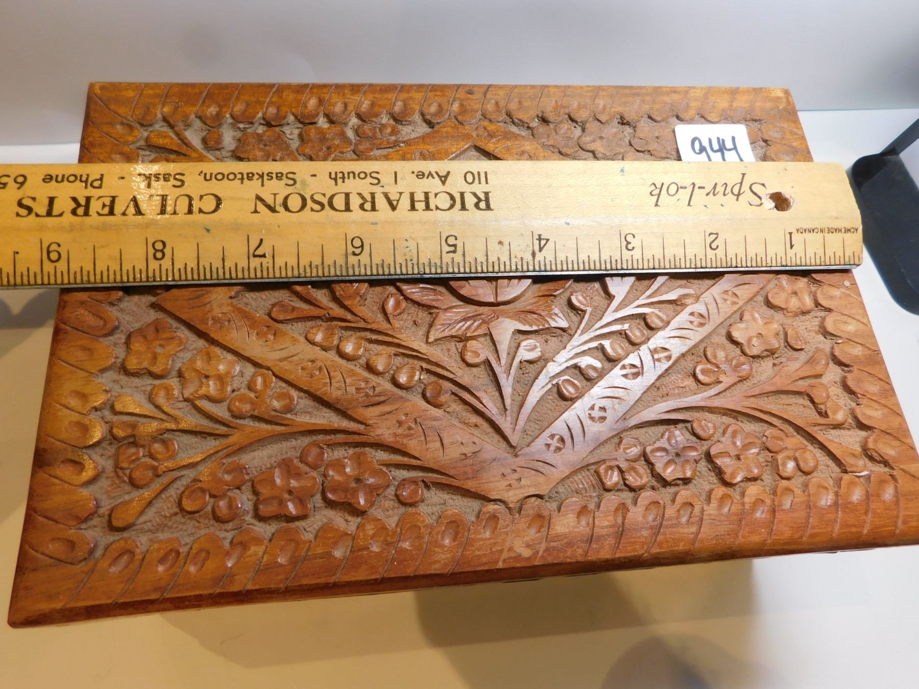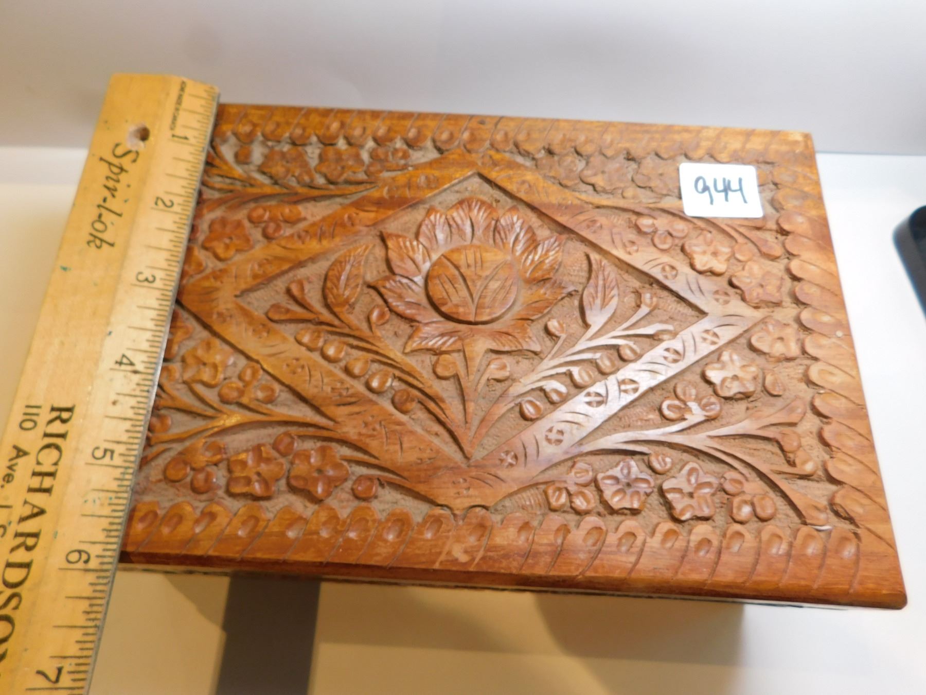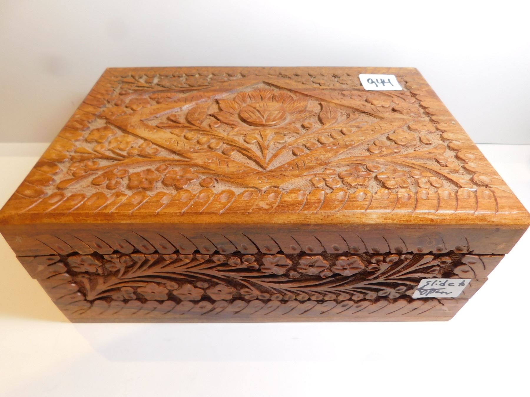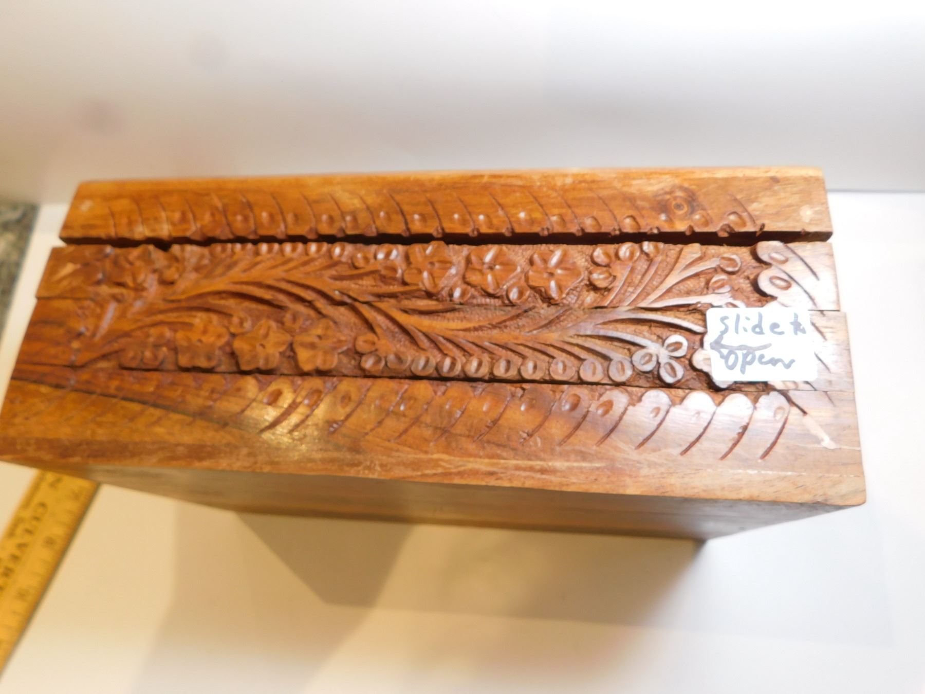 WOODEN PUZZLE BOX JEWELLRY BOX, SLIDE FRONT PANEL TO OPEN