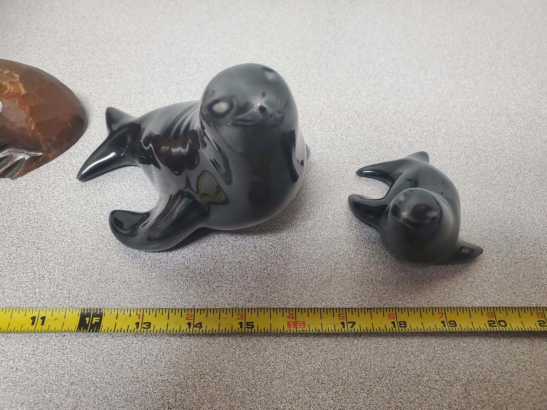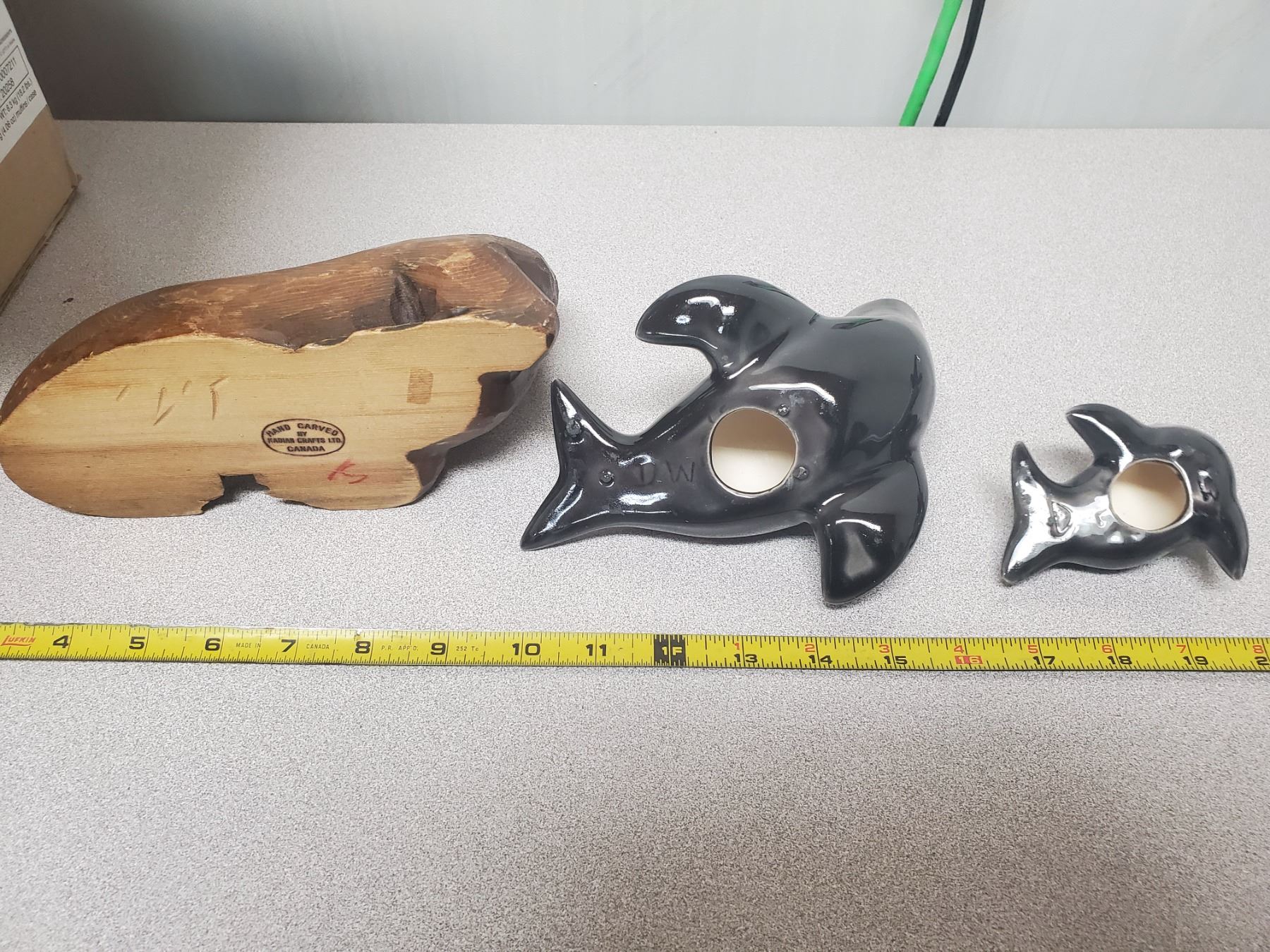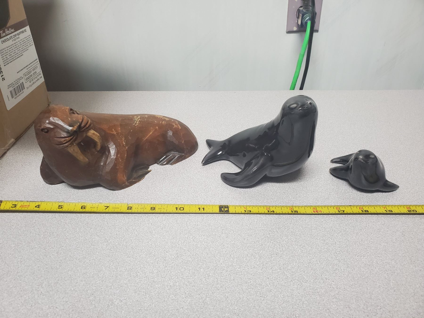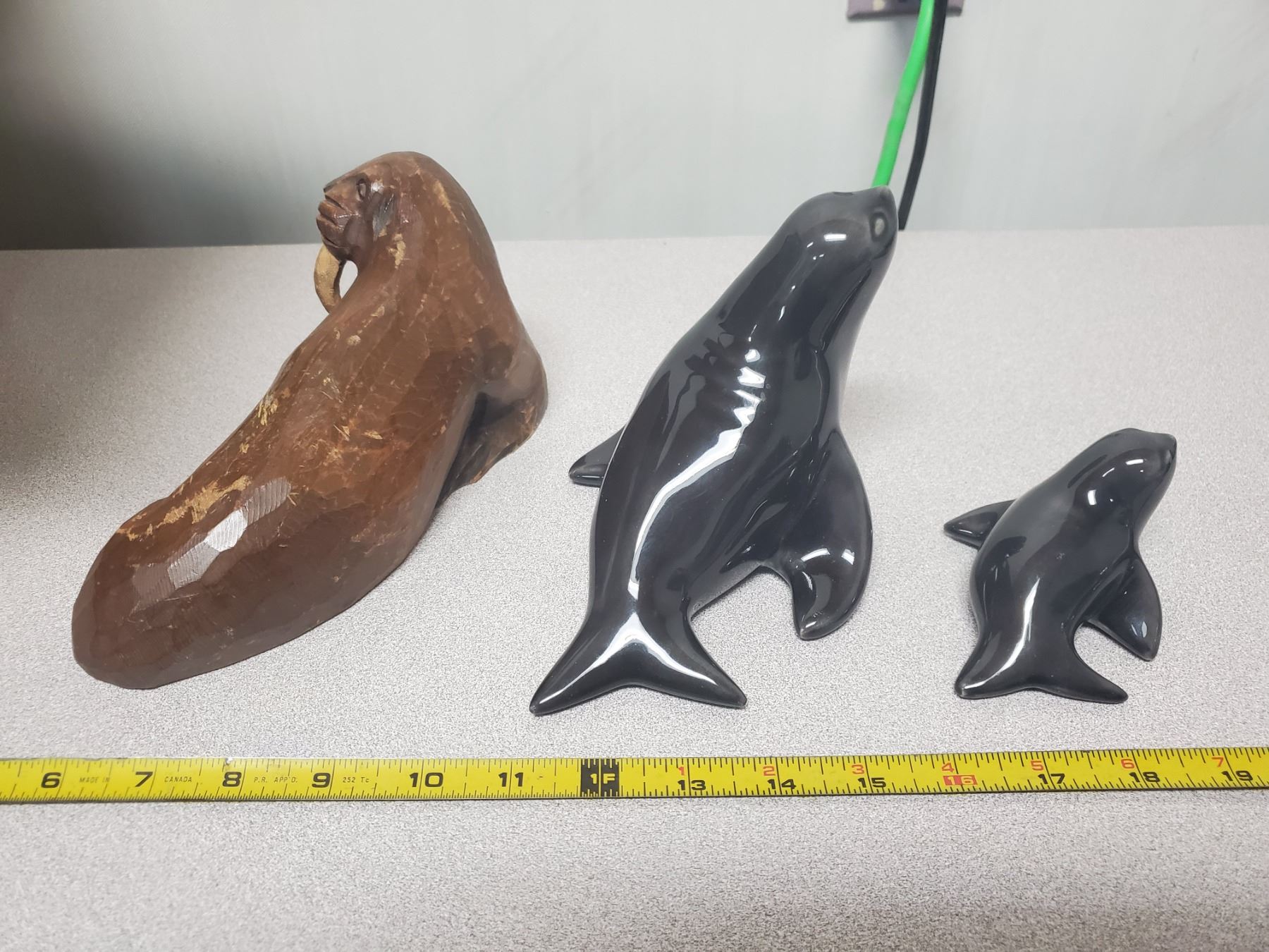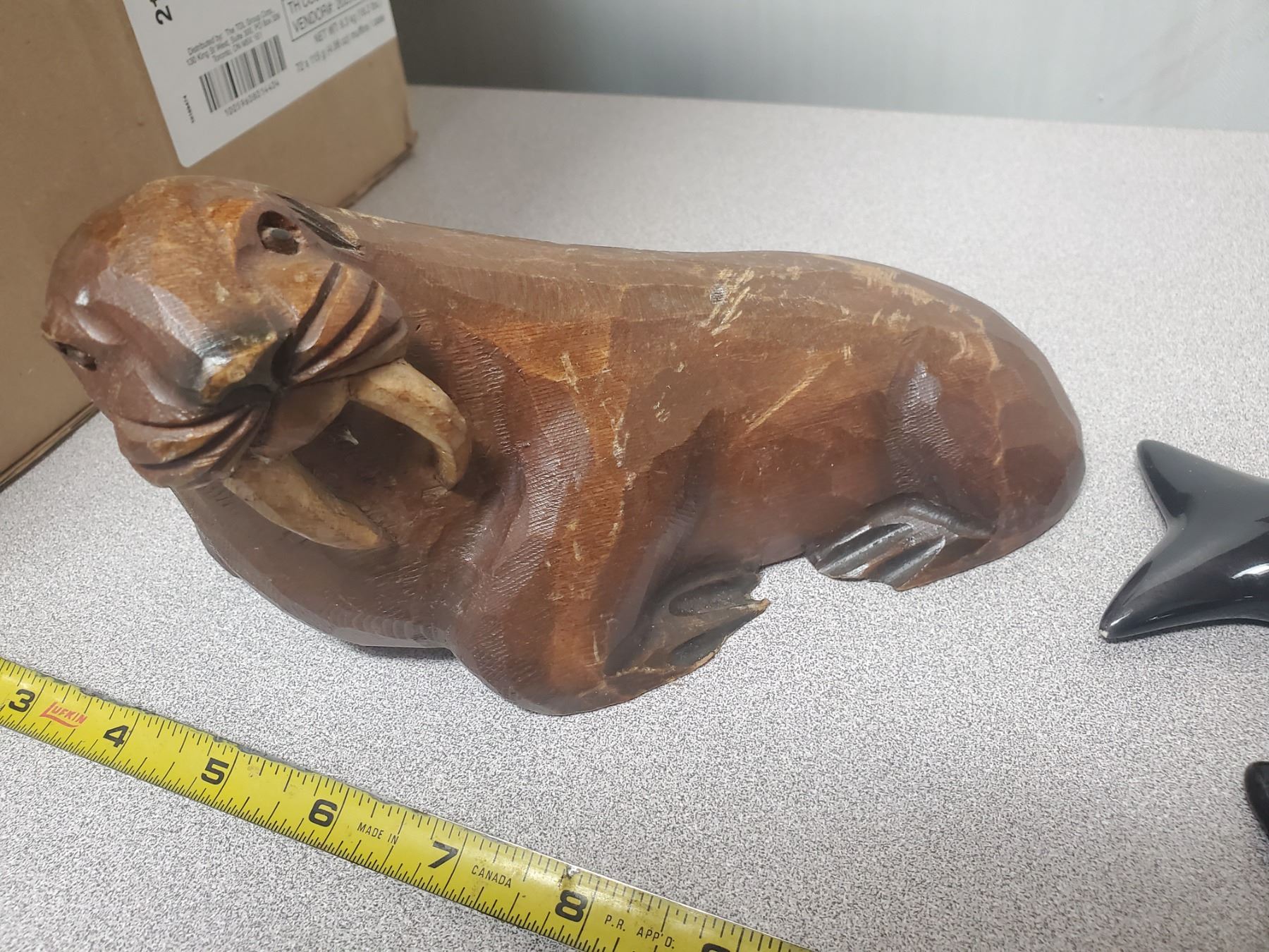 WOODEN WALRUS ORNAMENT CARVED IN CANADA WITH 2 SEALS