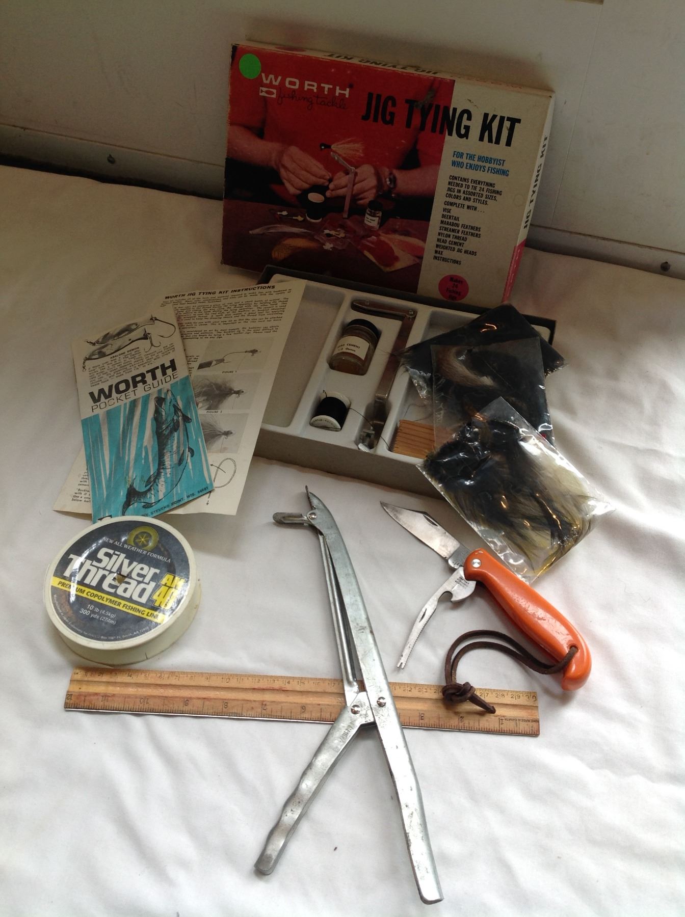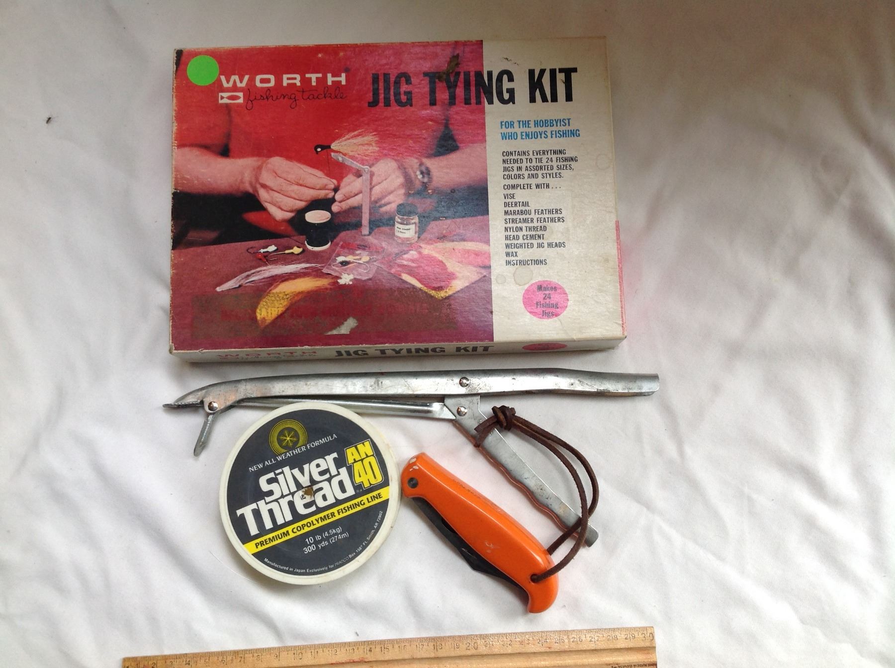 WORTH JIG TYING KIT, OLD FISH HOOK REMOVER, AND FISHING LINE.