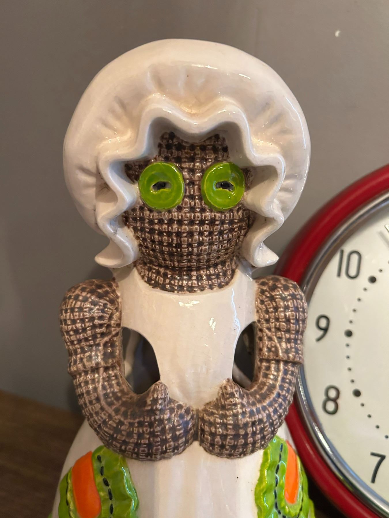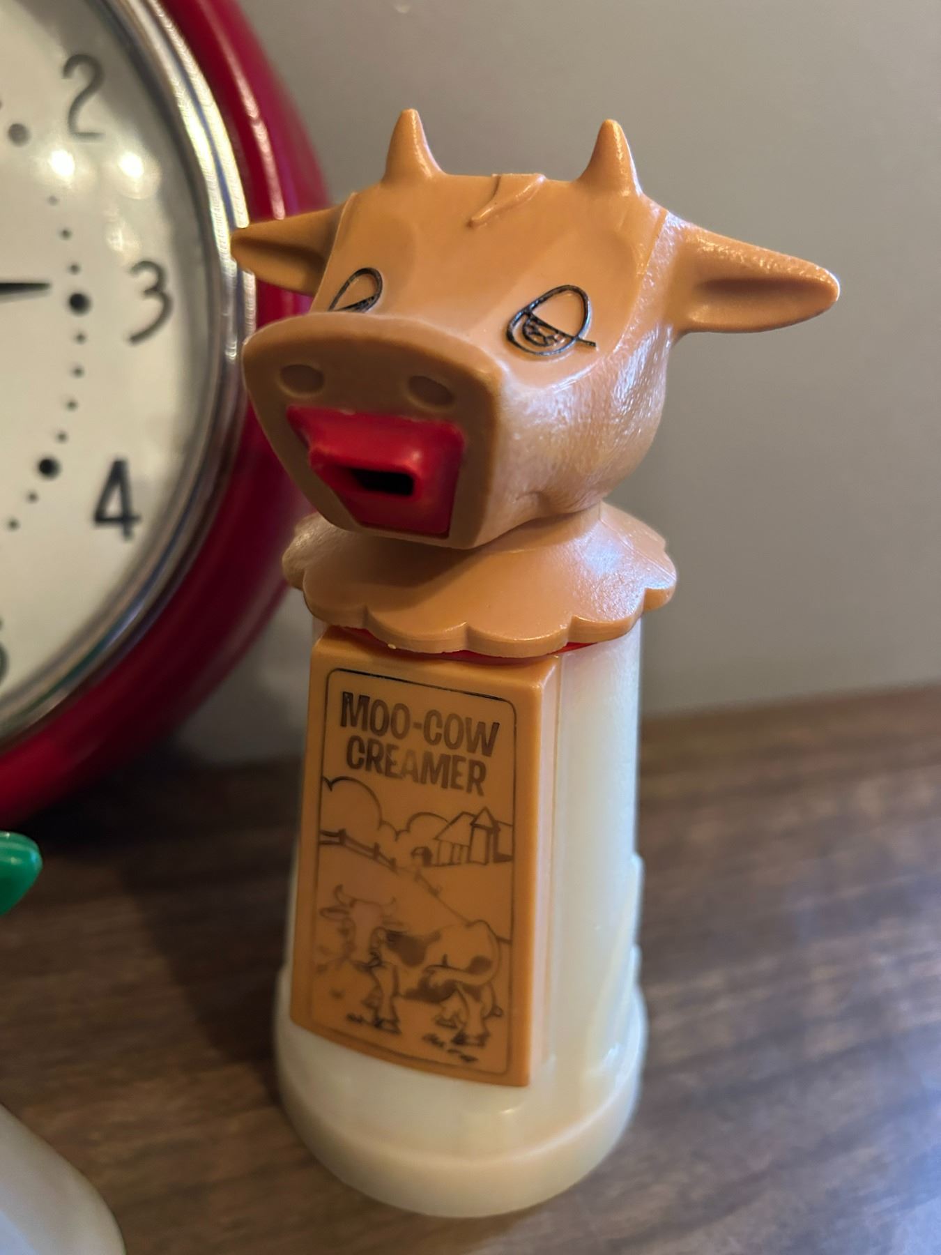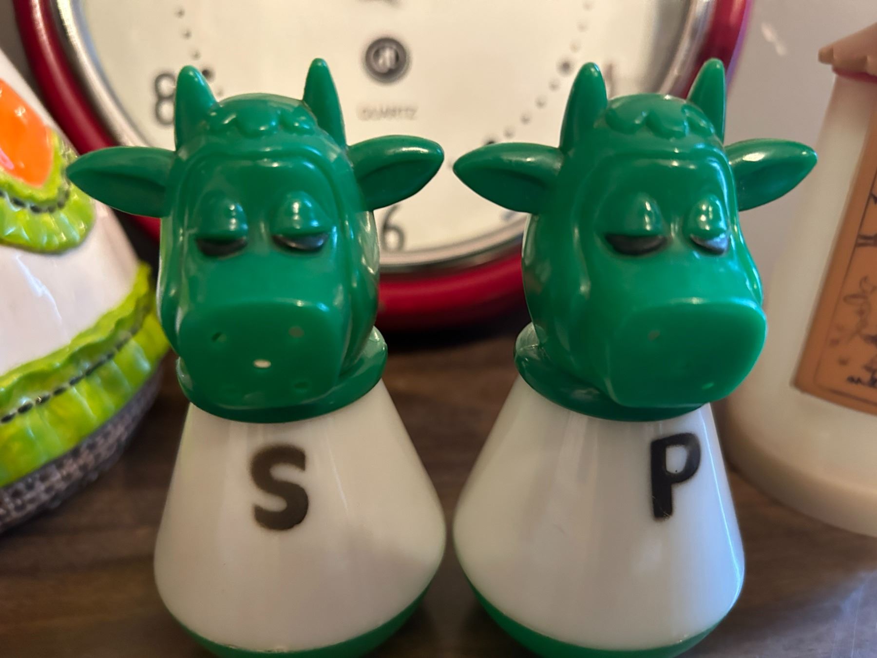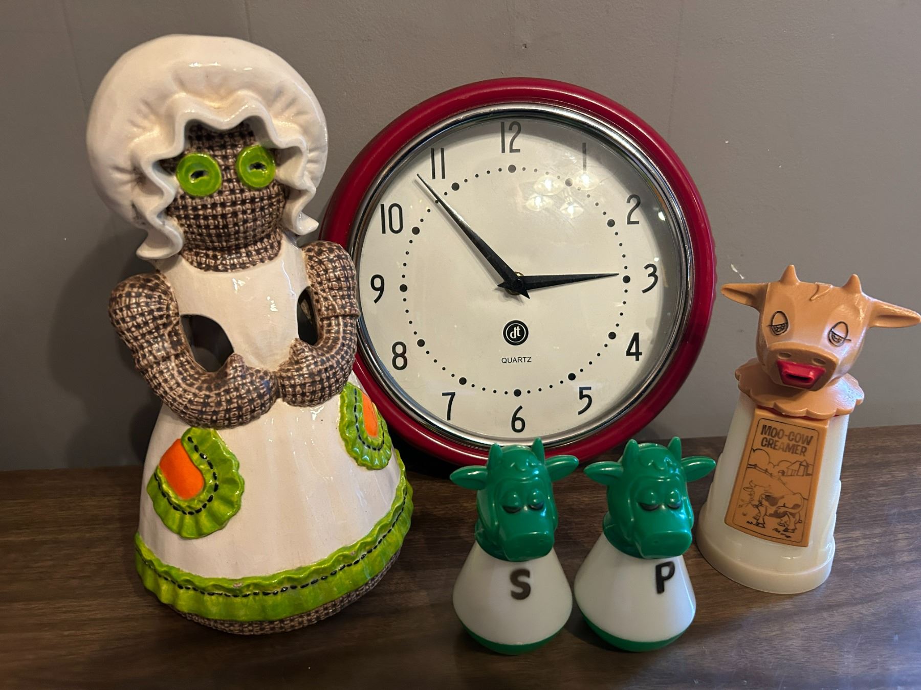 Waffle lady character -cooking utensil holder, vintage cream dispenser (cow)& Salt& Pepper cow shakers , Red Kitchen Clock