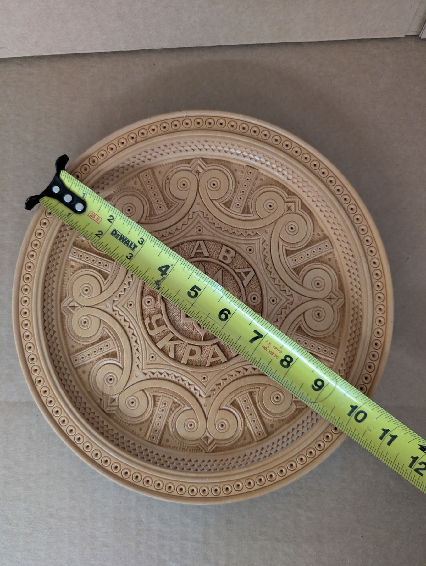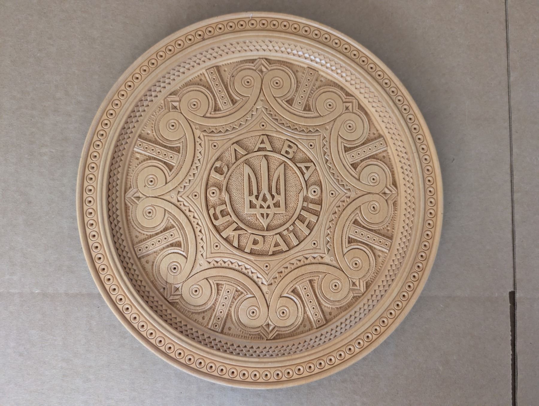 Wall hanging wood carved dish from Ukraine. 10.25” (26 cm) wide. Translation: “Glory to Ukraine.” Excellent condition.