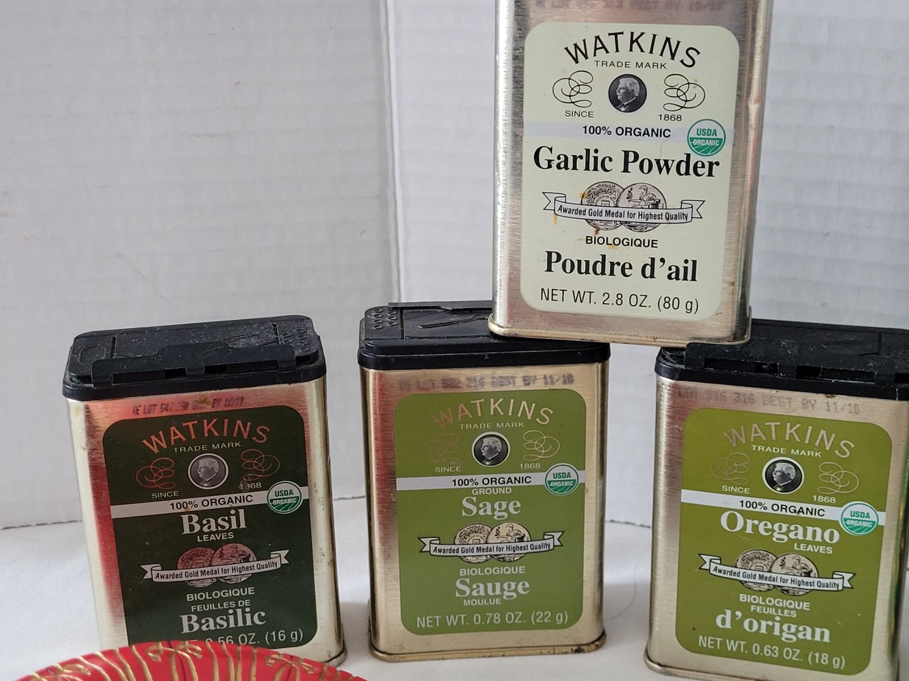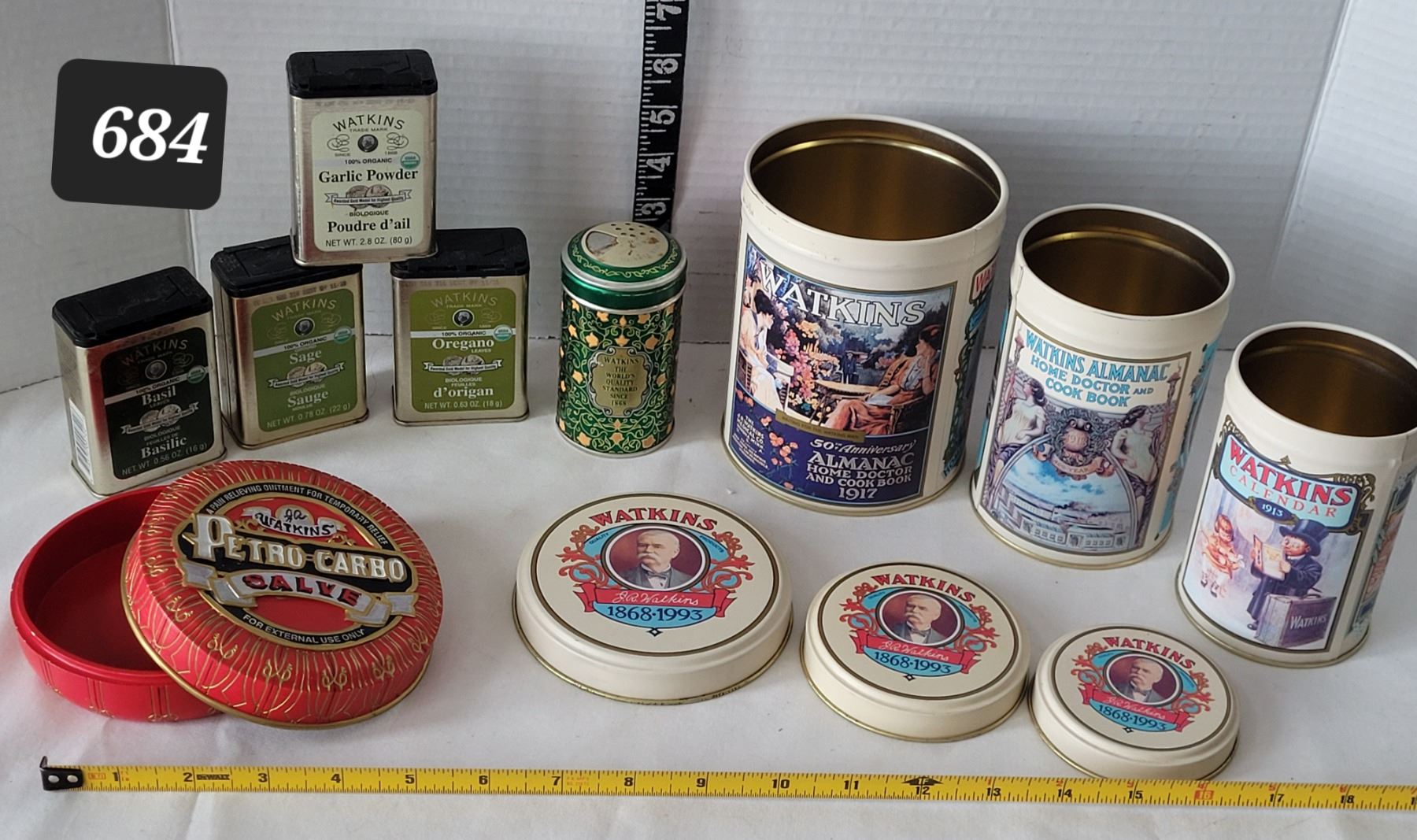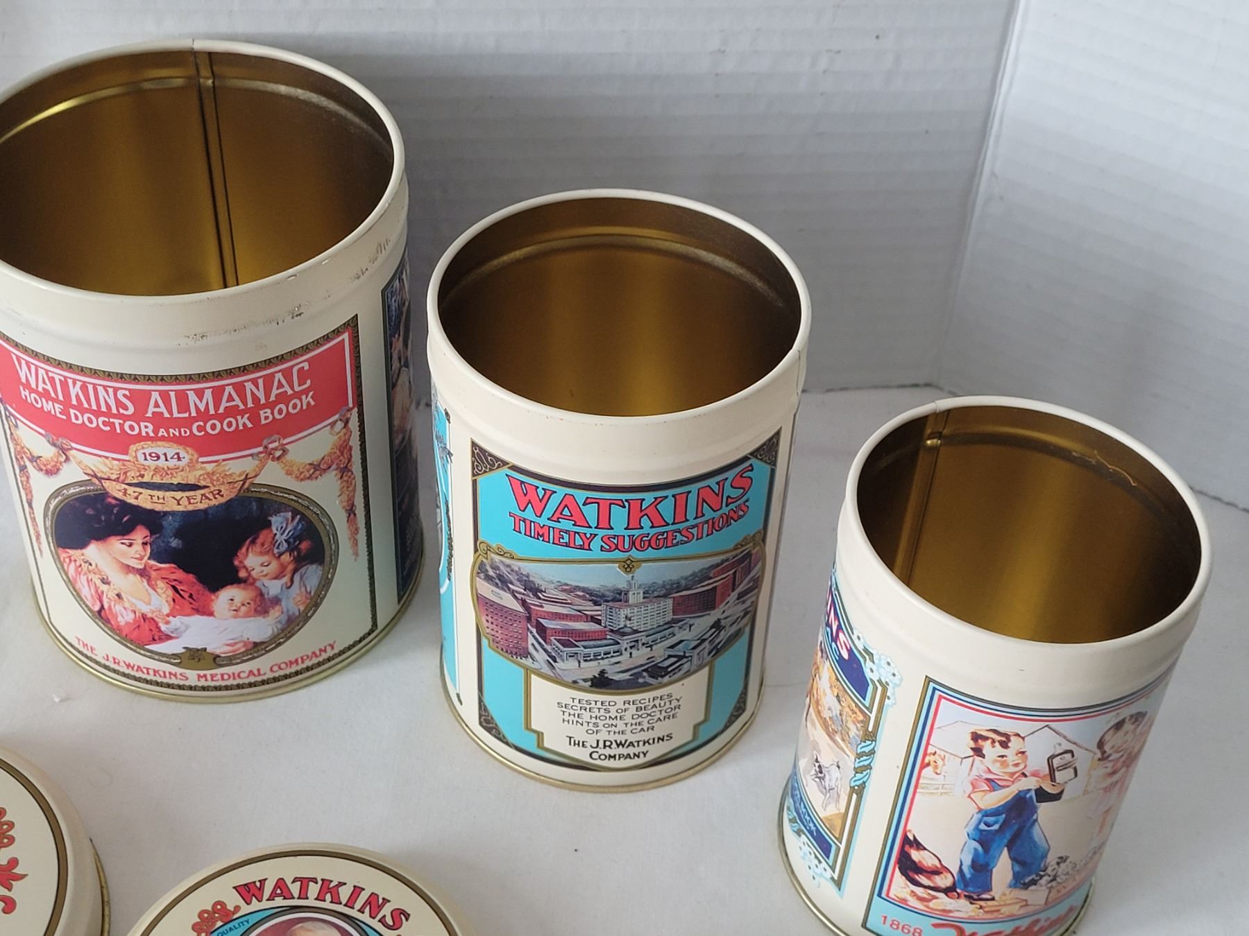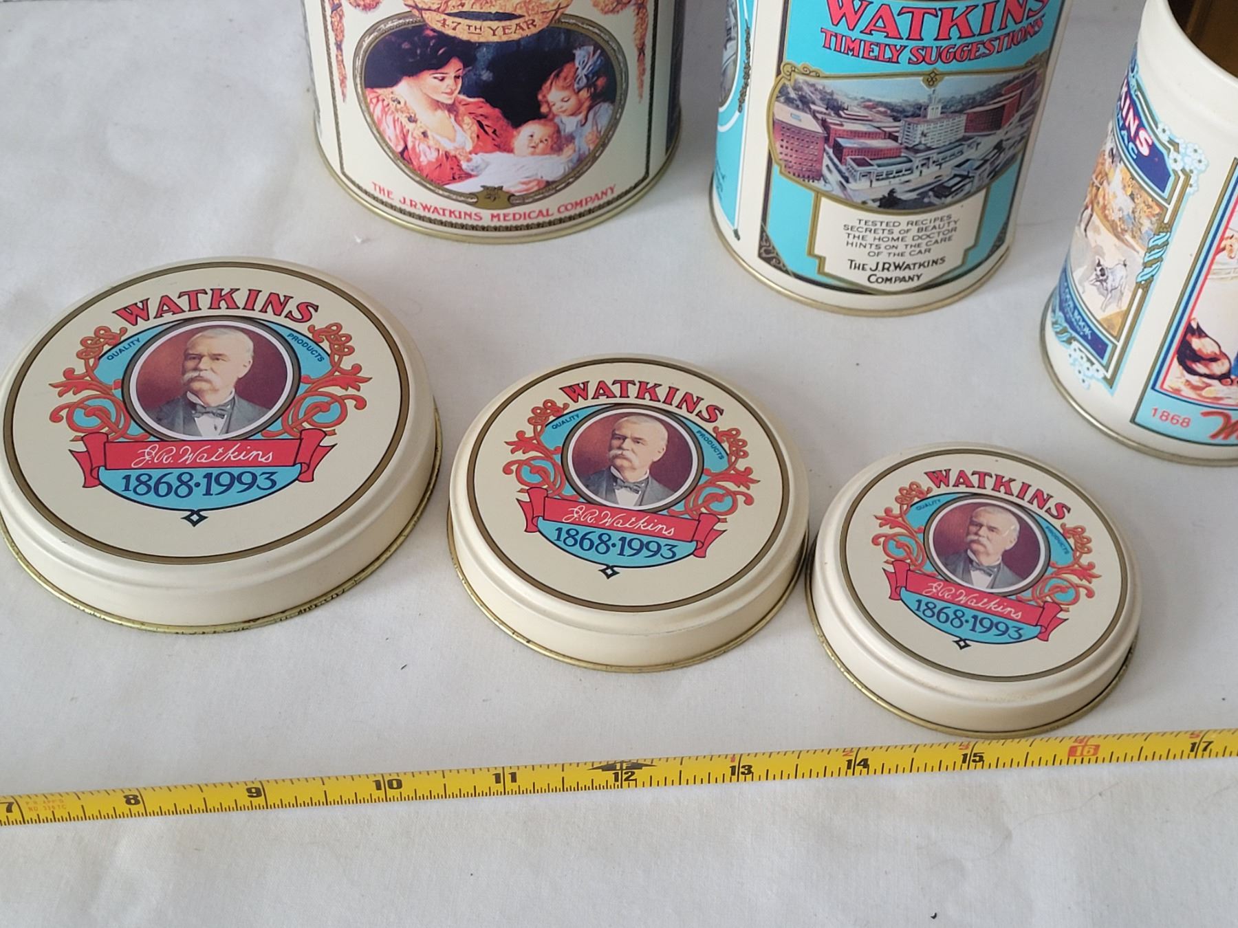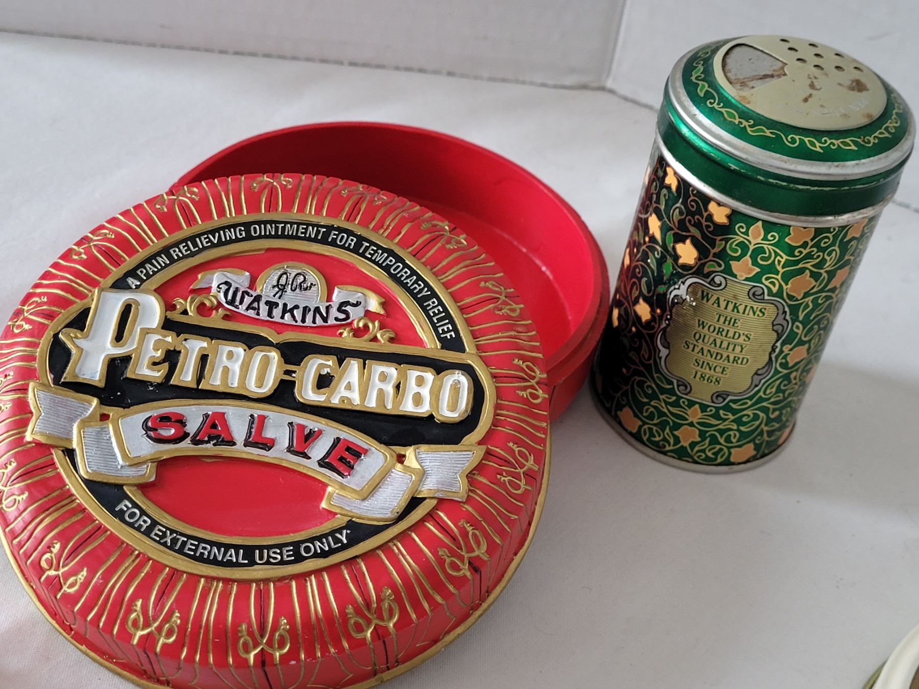 Watkins metal spice containers, 3 piece canister set & 135th anniversary salve container.