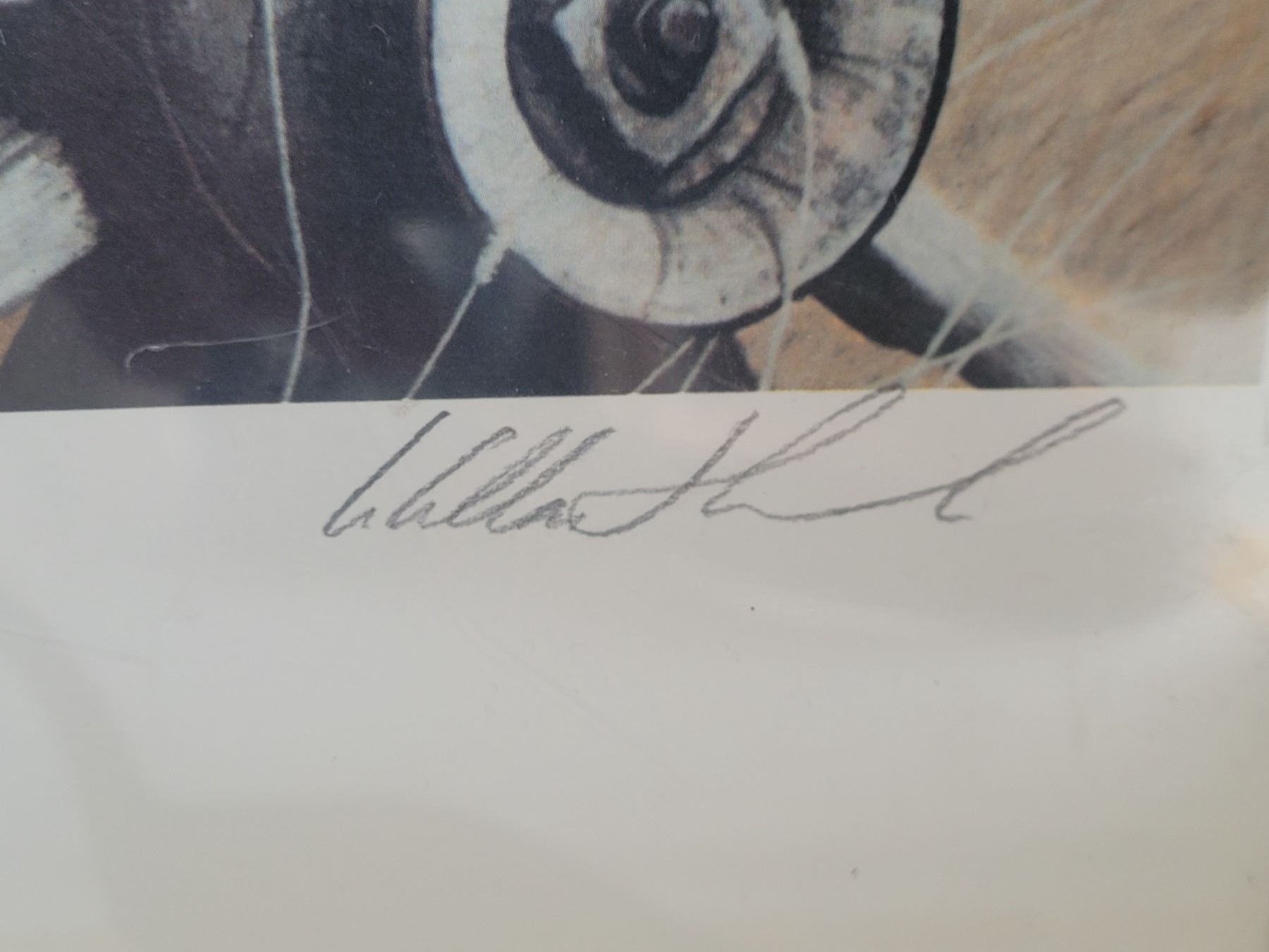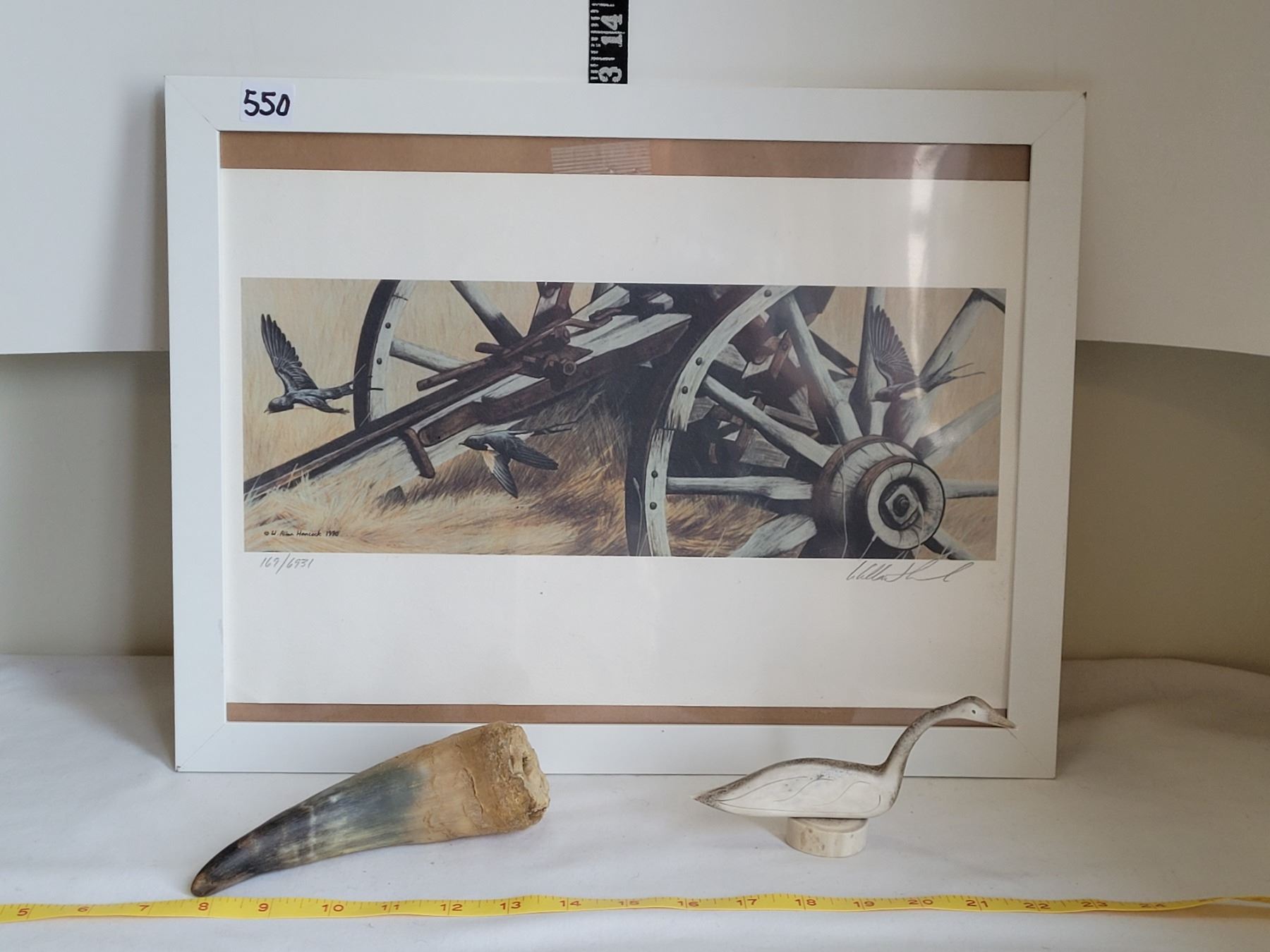 Western Limited Edition print 169 of 6931, signed Alan Hancock 1990. Bone carving of a goose & a carving horn.