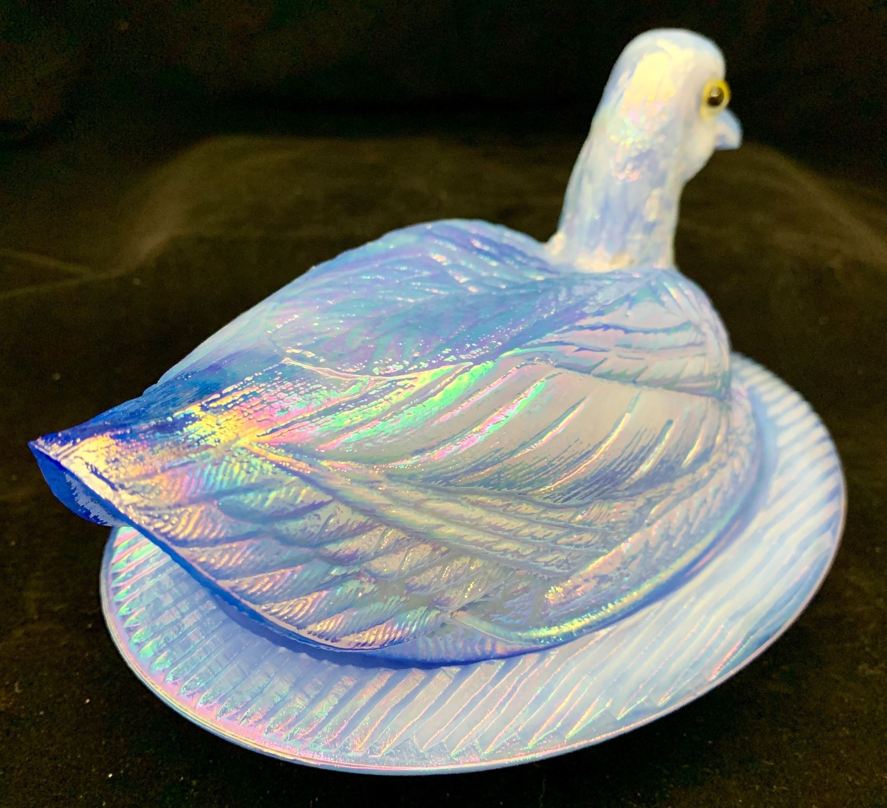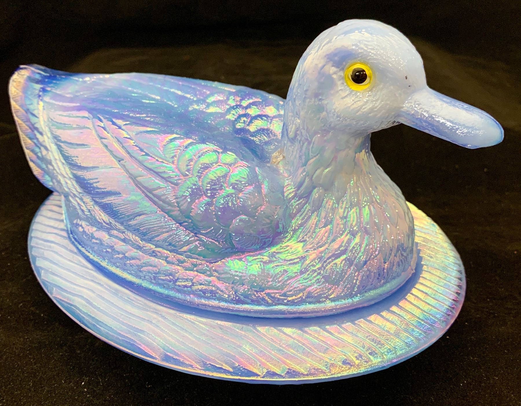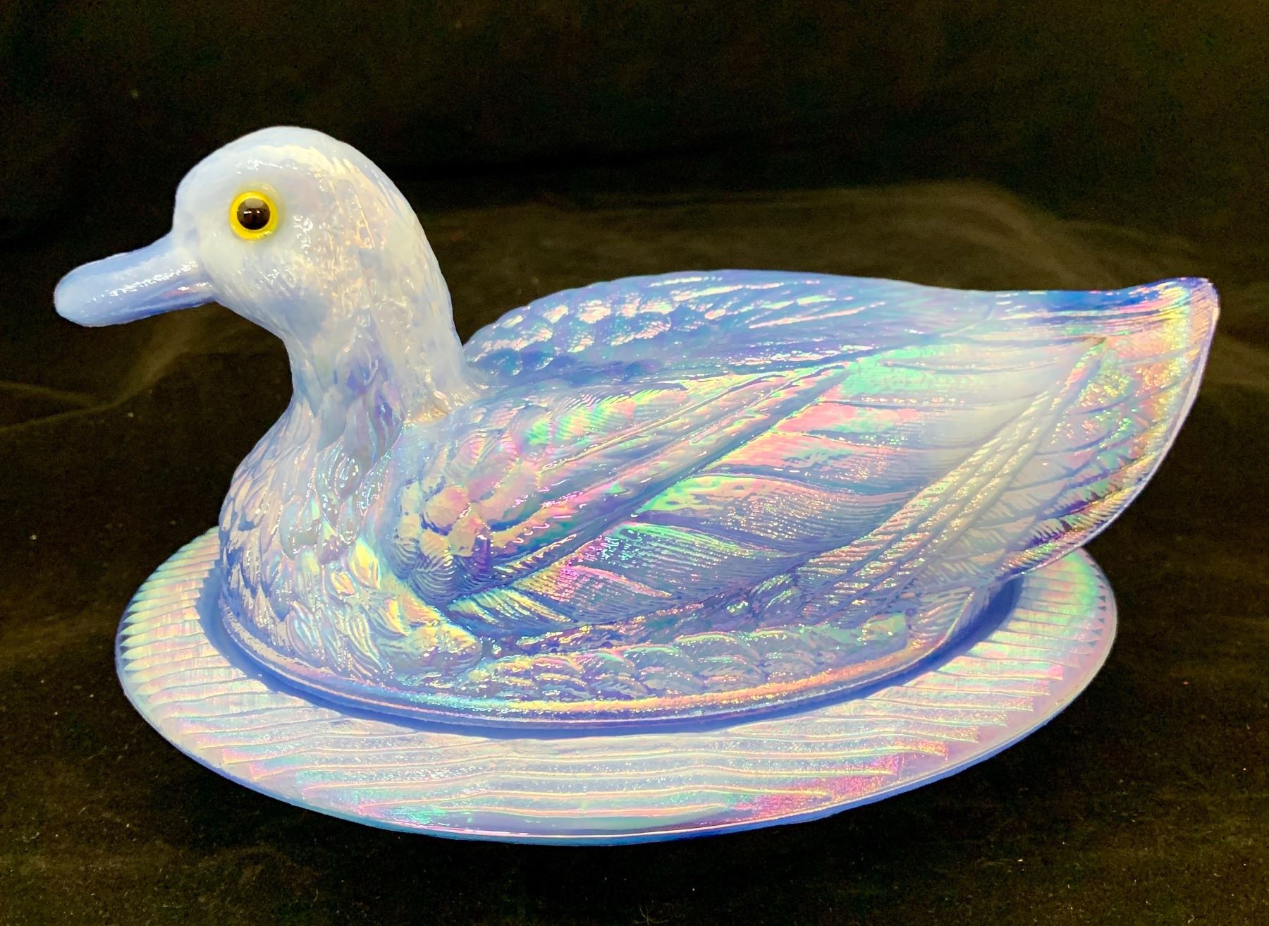 Westmoreland periwinkle slag blue duck on nest carnival glass with glass eyes