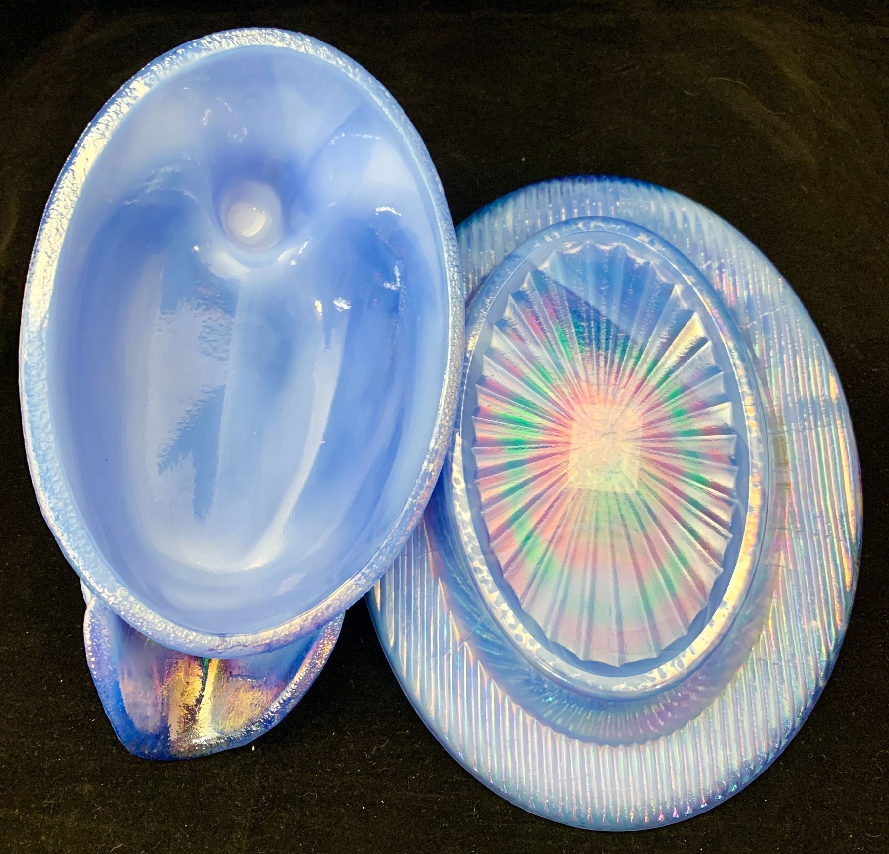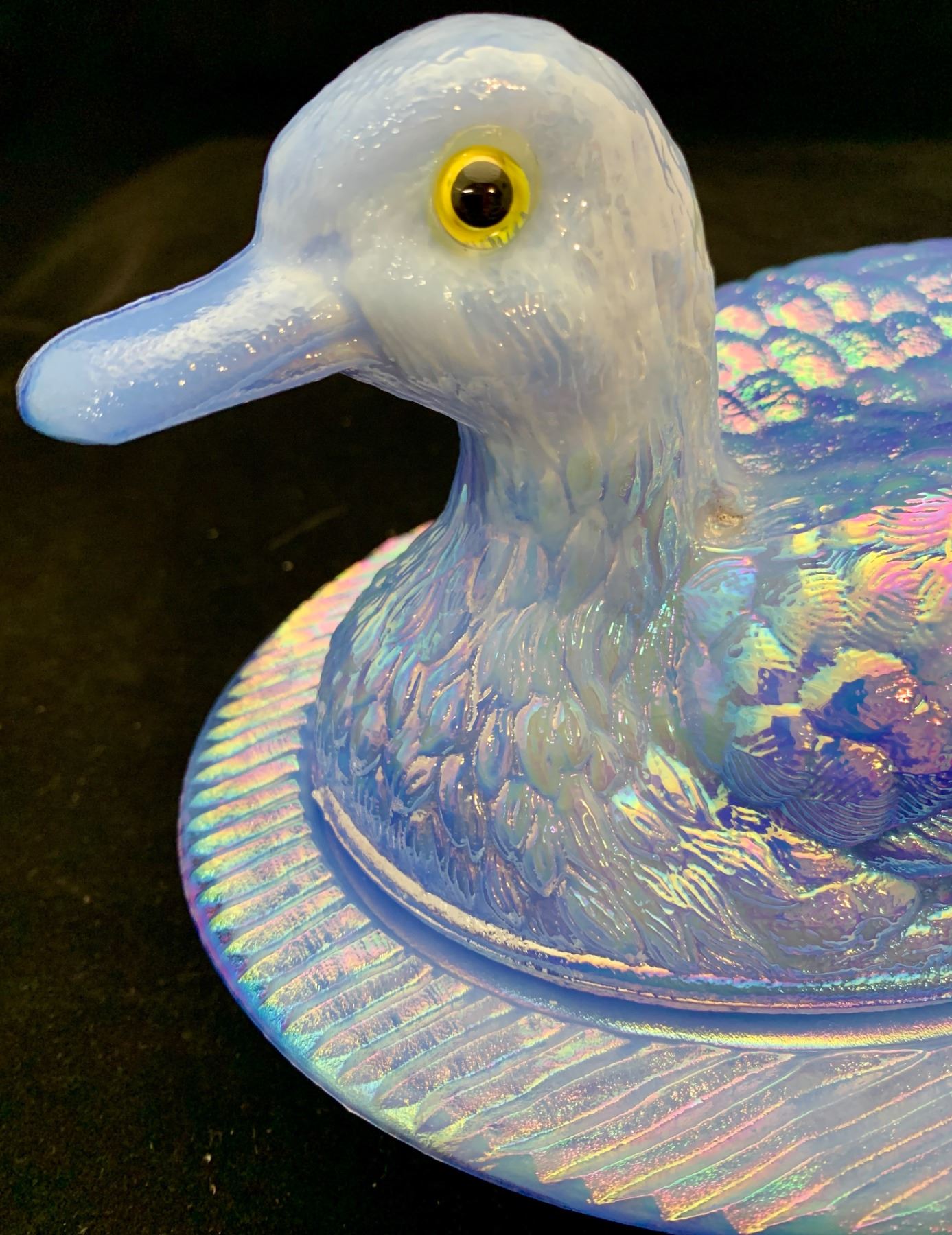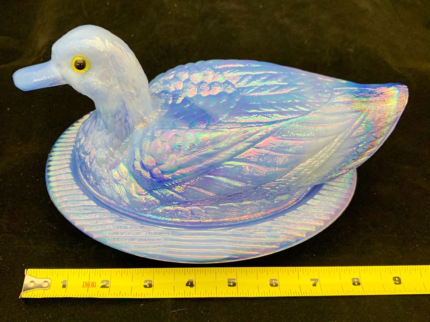 Westmoreland periwinkle slag blue duck on nest carnival glass with glass eyes