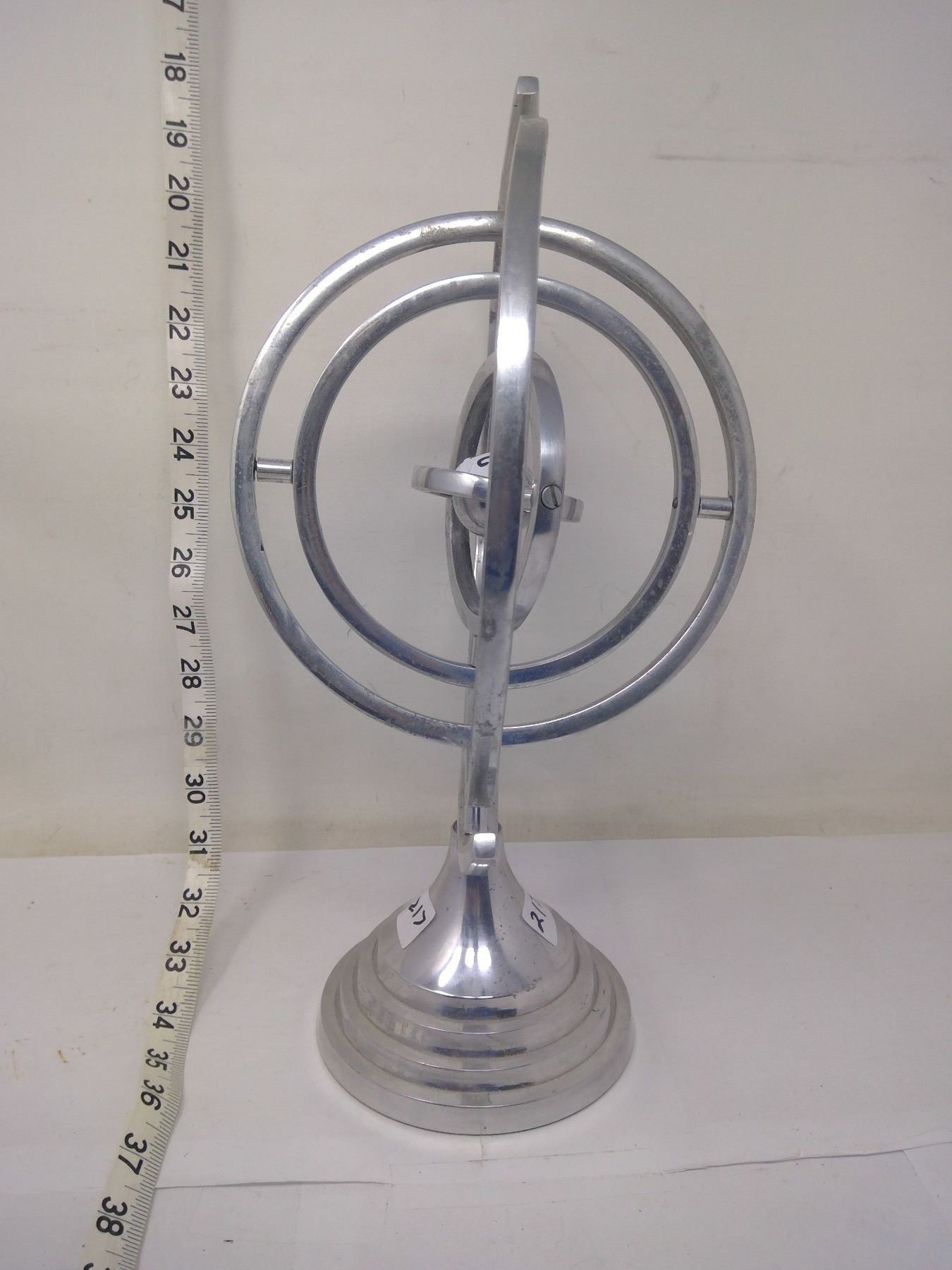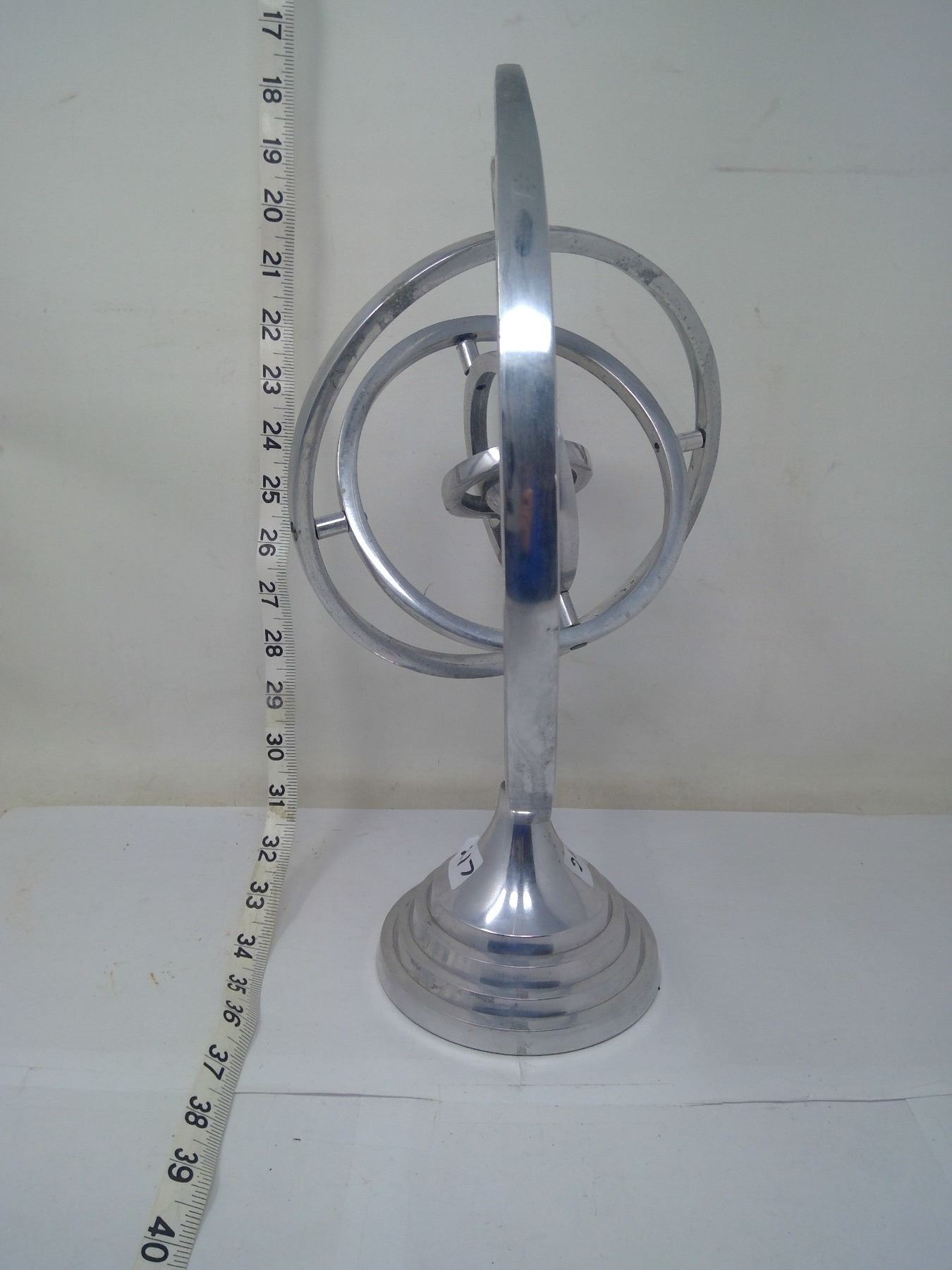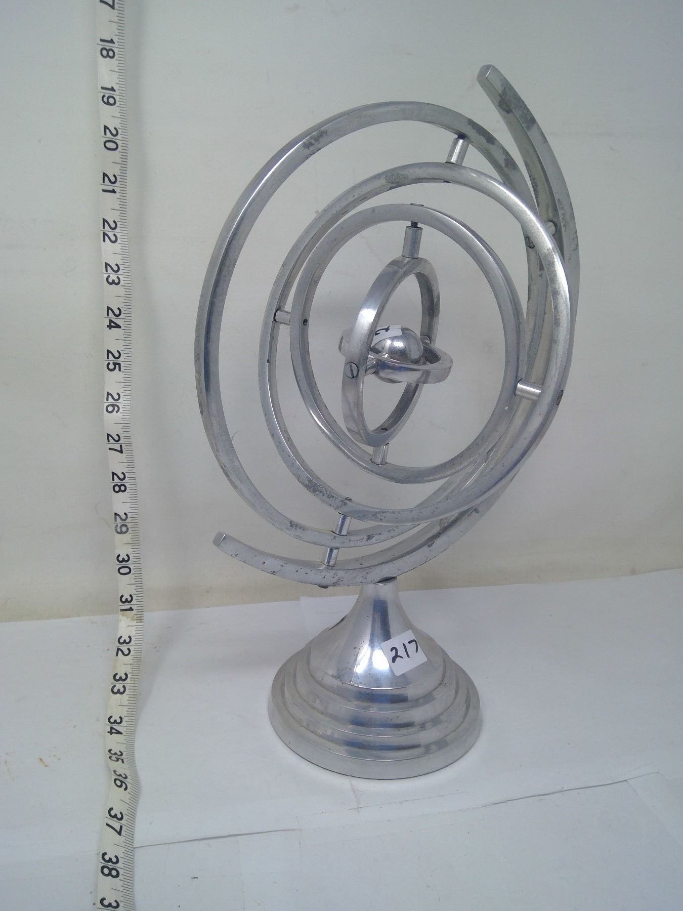 Wheel within wheel spinning axis demonstrators. Made of cast aluminum each circle spins on its axis revealing notions of infinite circular motion down to the smallest degree. Makes you think. Height 14”.