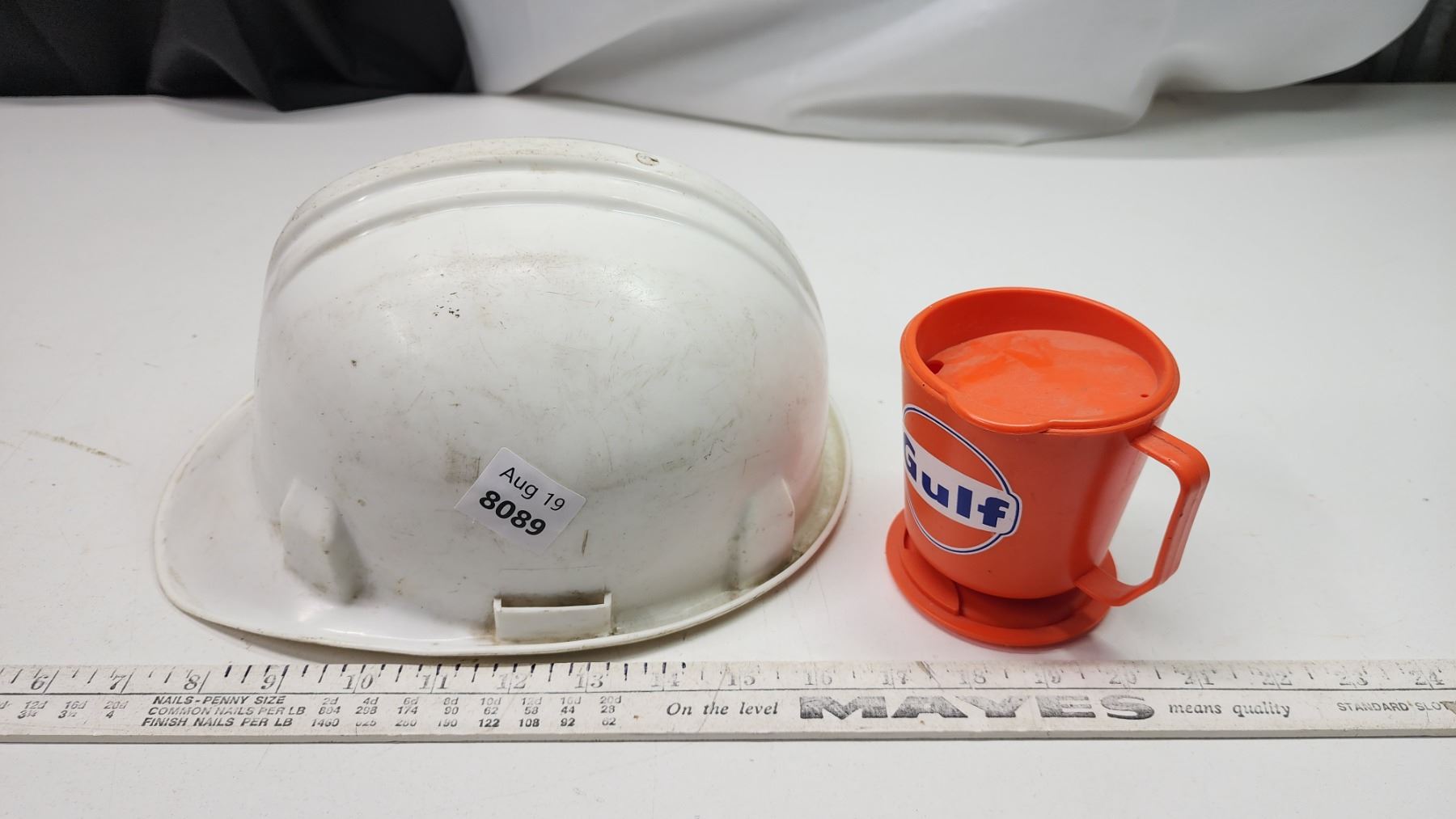 White "Gulf" hard hat & "Gulf" plastic drinking cup