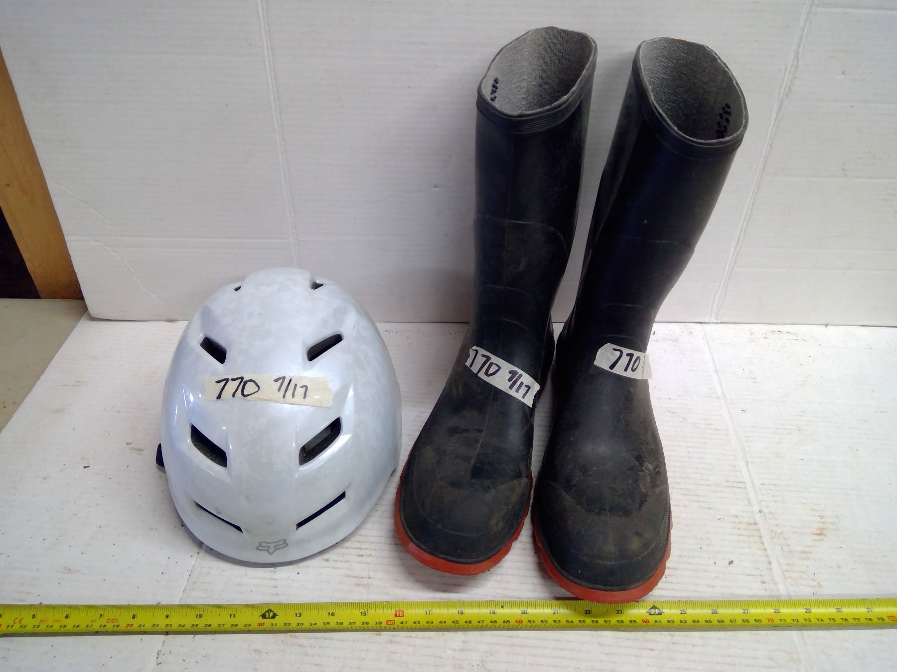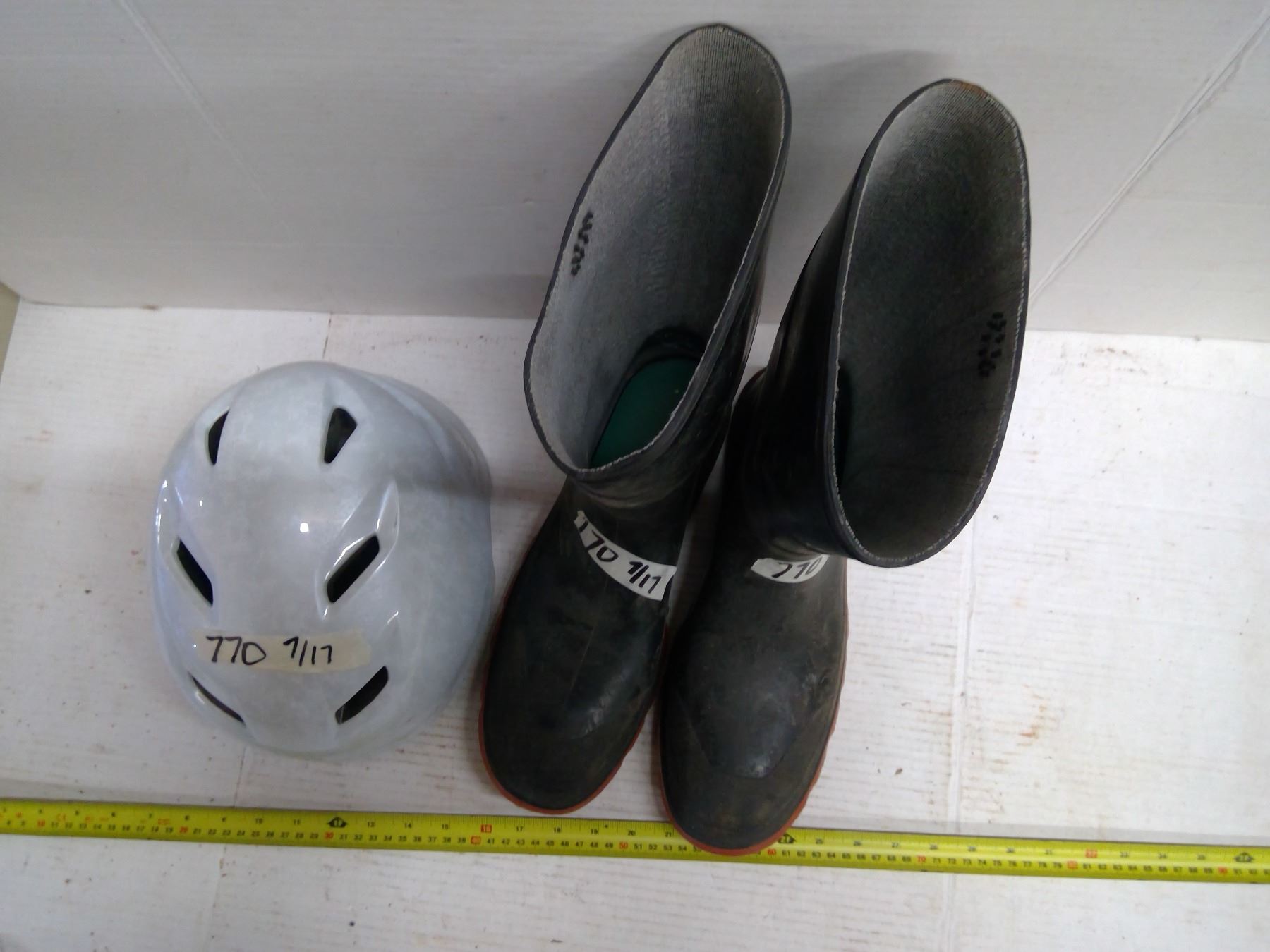 White L/XL Bike Helmet and Men's 13 Rubber Boots