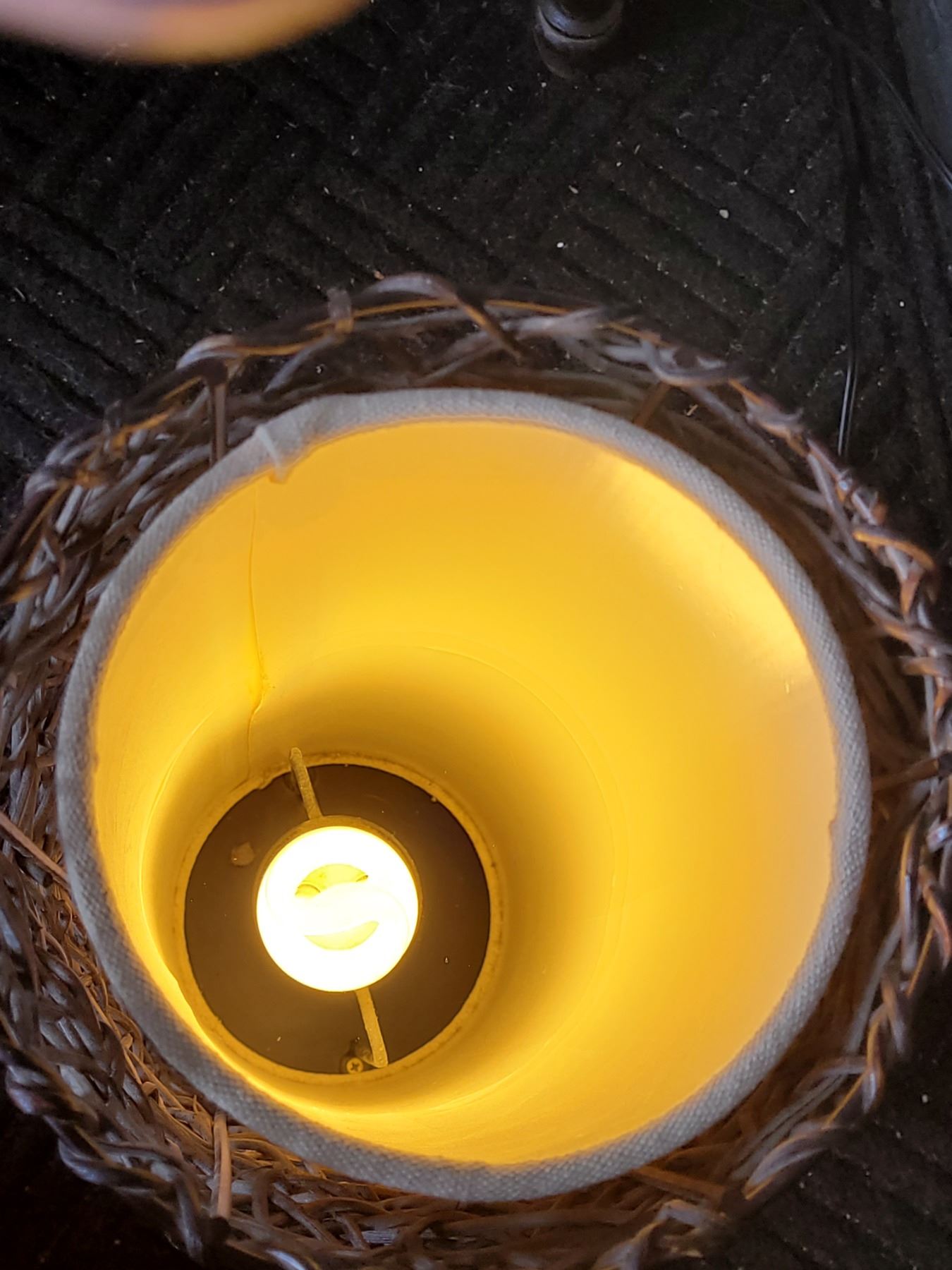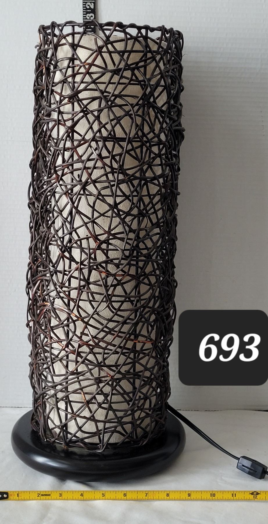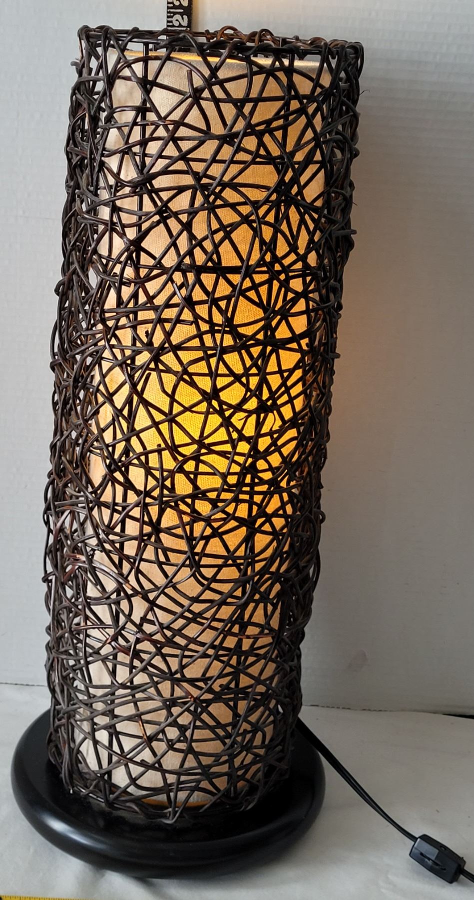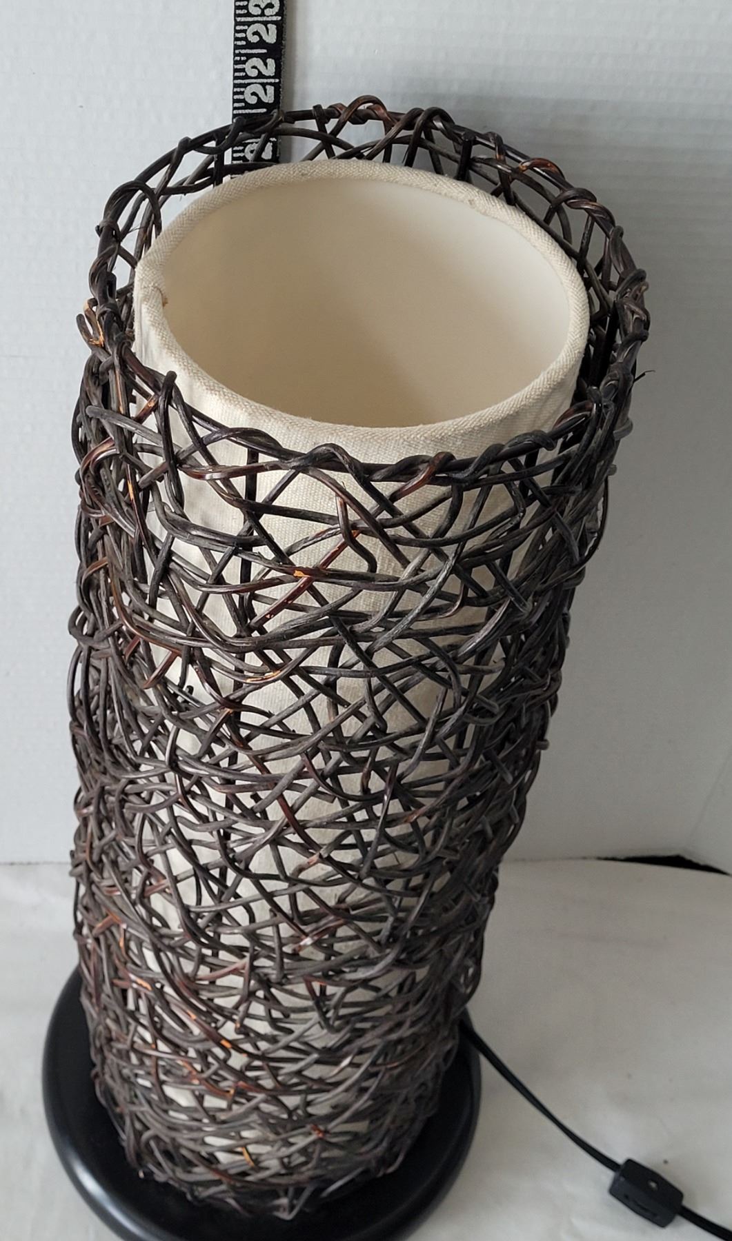 Wicker room lamp. Switch on the cord, wood base. Approx. 23” high.