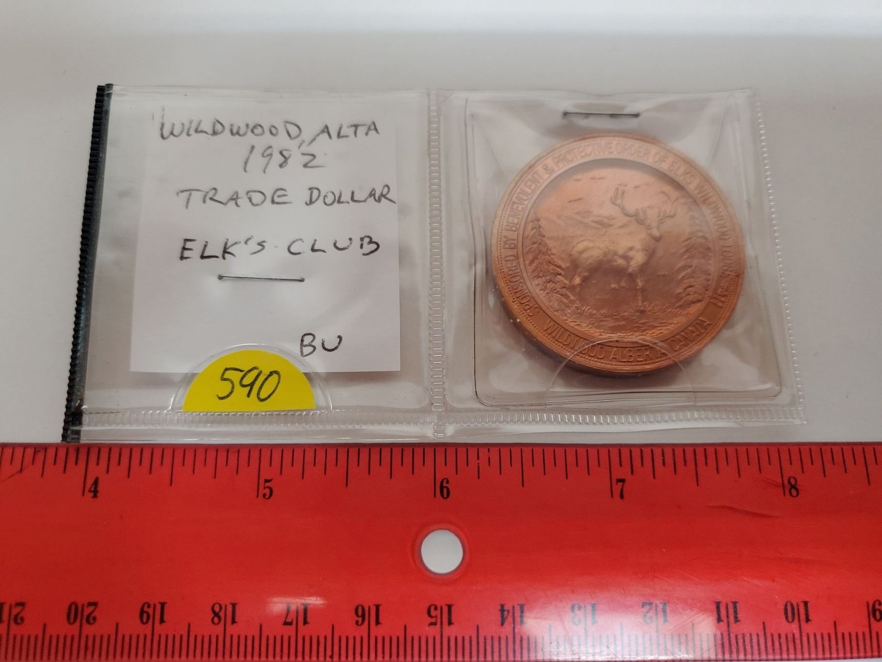 Wildwood, Alberta 1982 Trade Dollar. Depicts an Elk stag on obverse, while the reverse depicts Bingo. “Canada’s Bingo Capital Under 500 Population.” Produced by the Elks Lodge 411 of Wildwood. BU. A popular Trade Dollar.