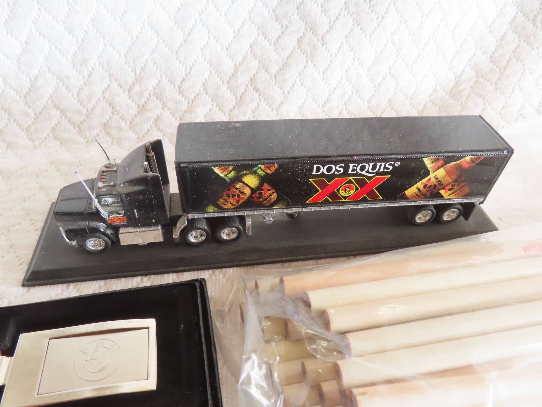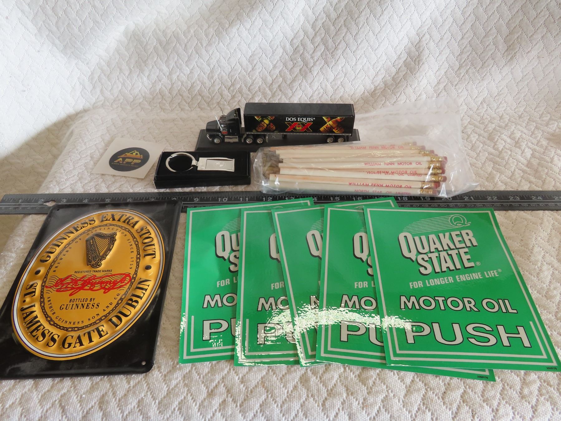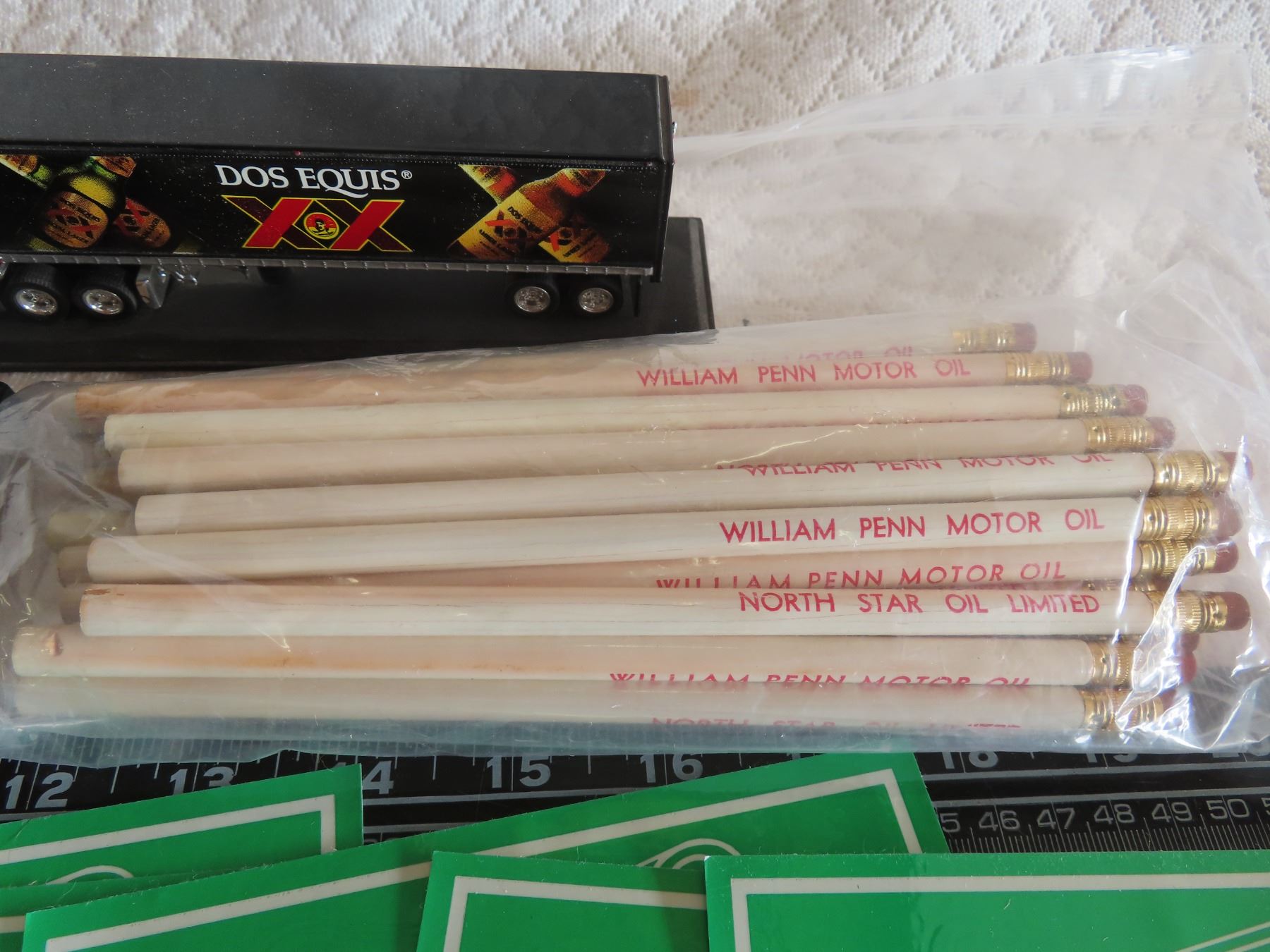 William Penn pencils, dos equis die cast semi, Guinness beer badge