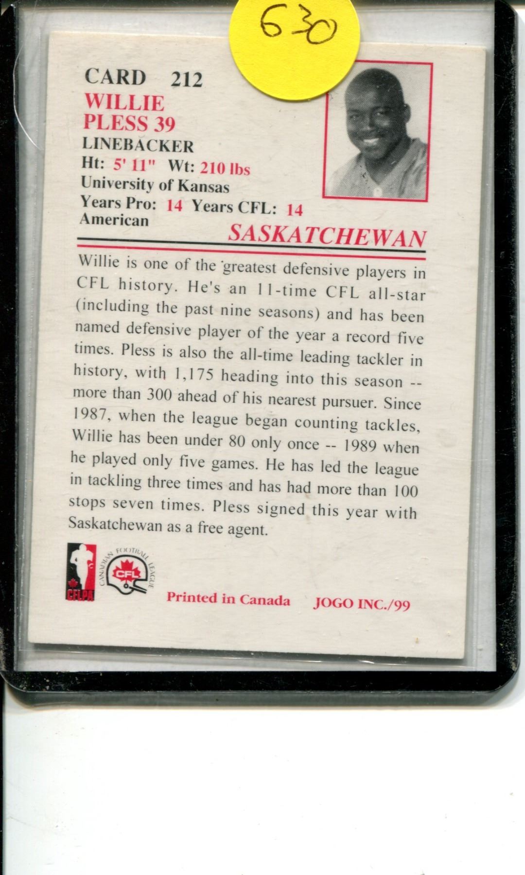 Willie Pless Saskatchewan Roughrider Card W/ Autograph
