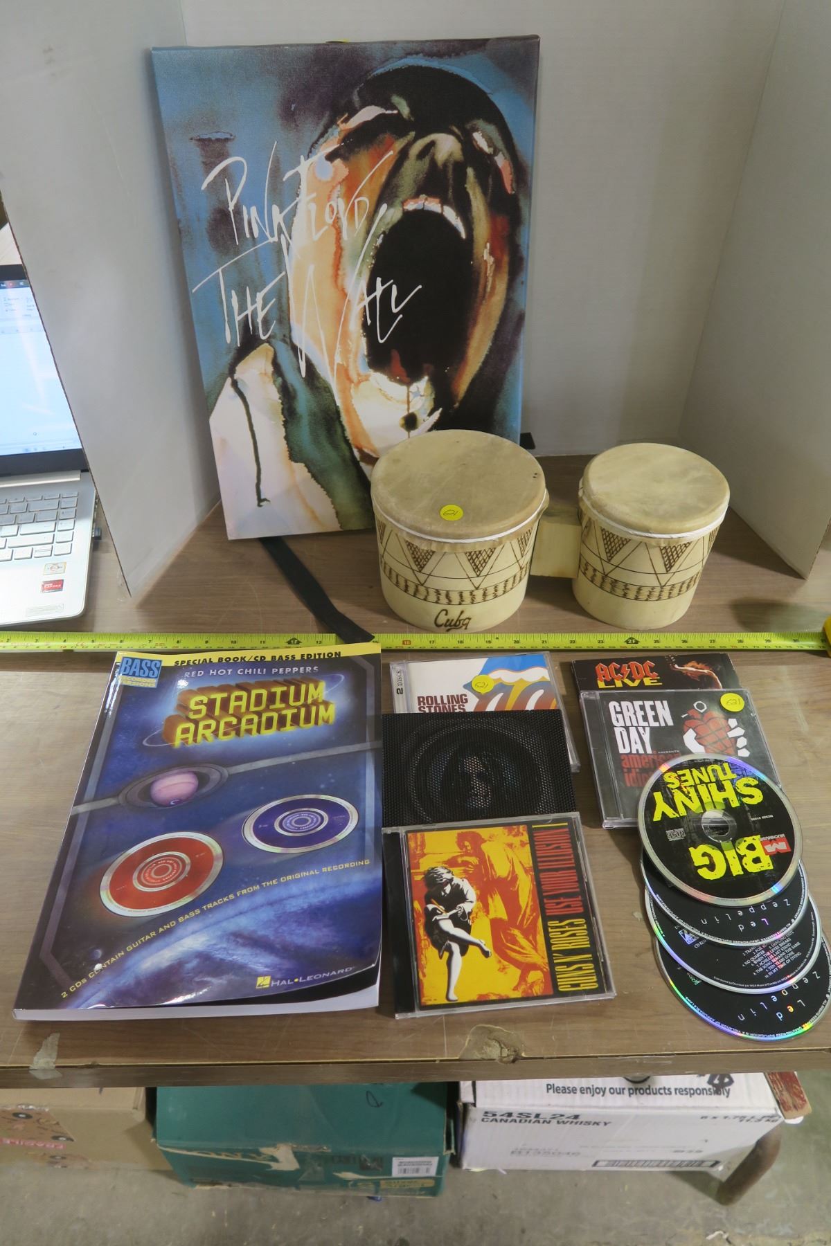 Wood Bongos, Pink Floyd Wall Art, Bass Tab Book and CDs