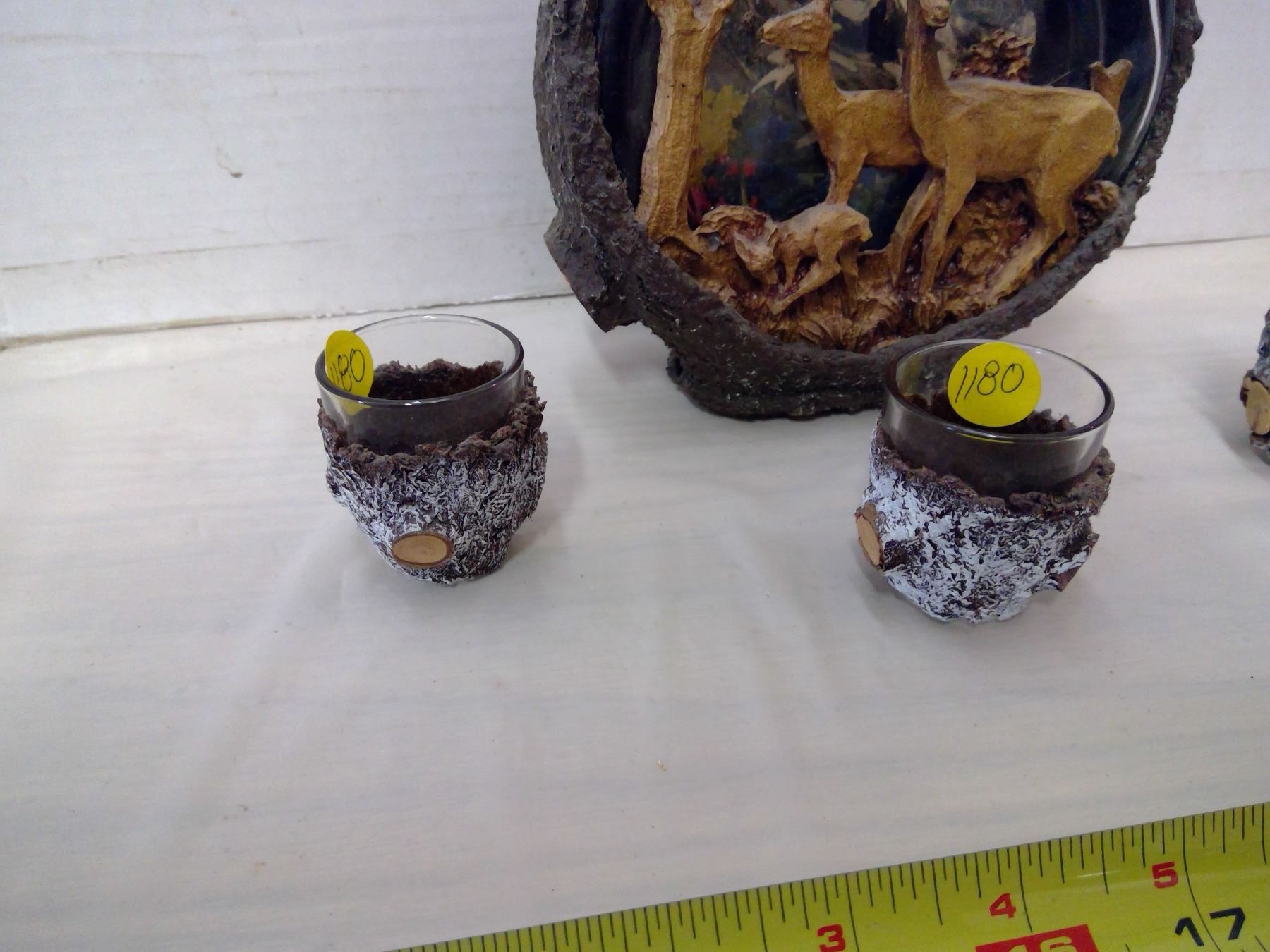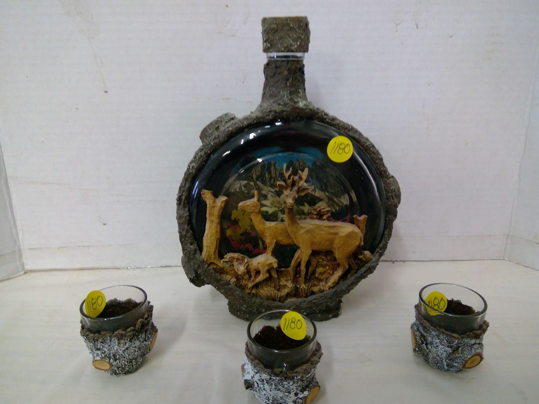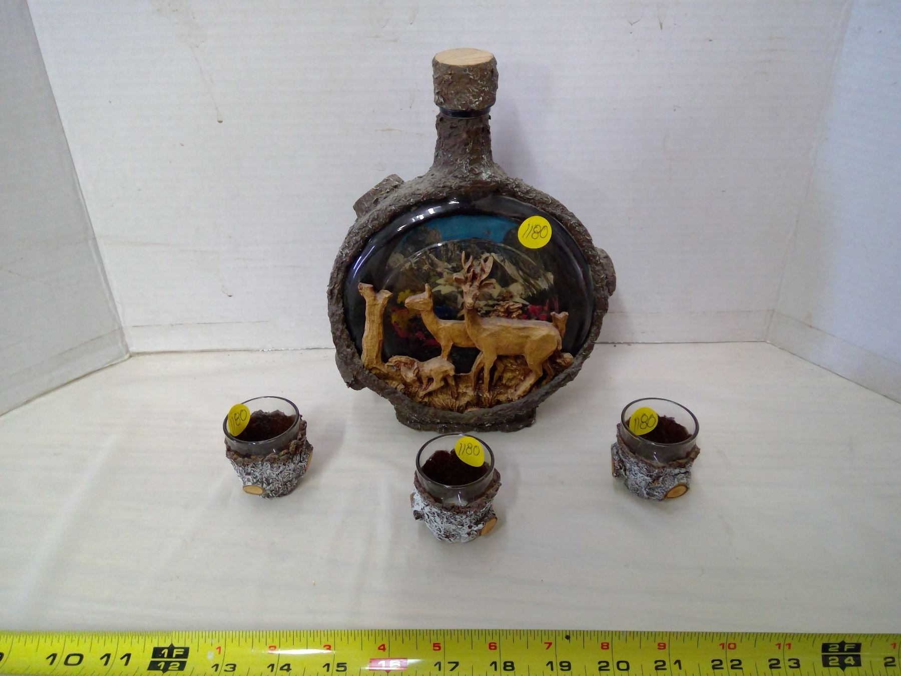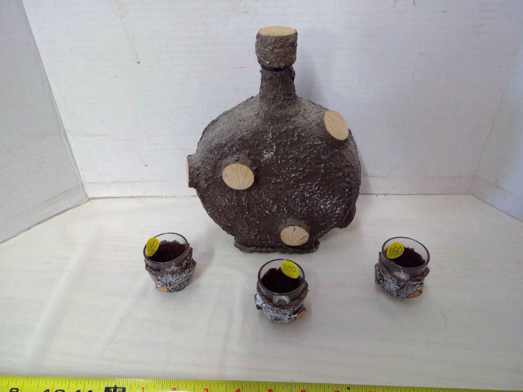 Wood Govered Glass Bottle w/ 3 Matching Shot Glasses