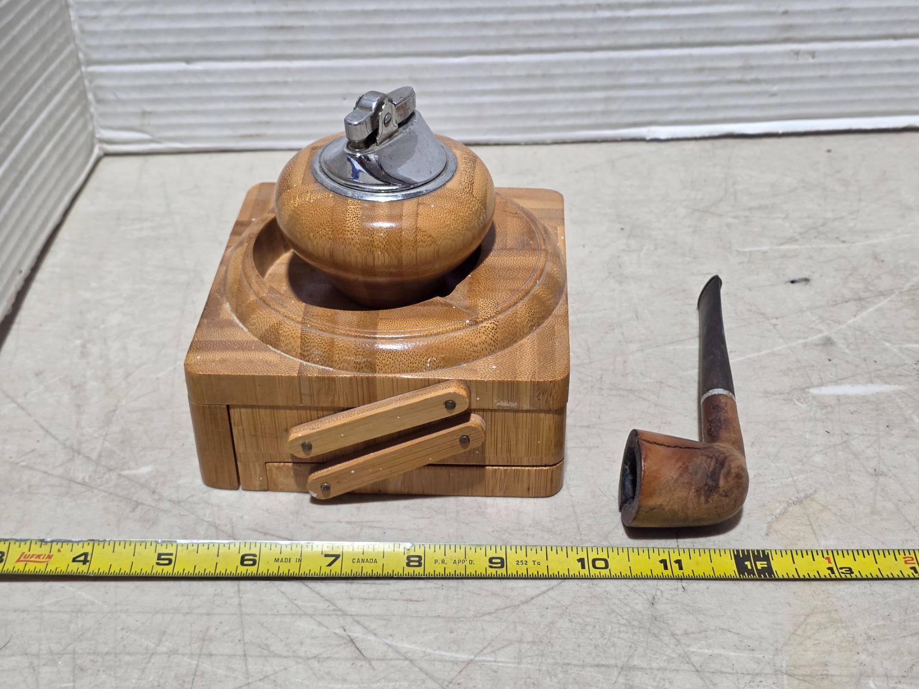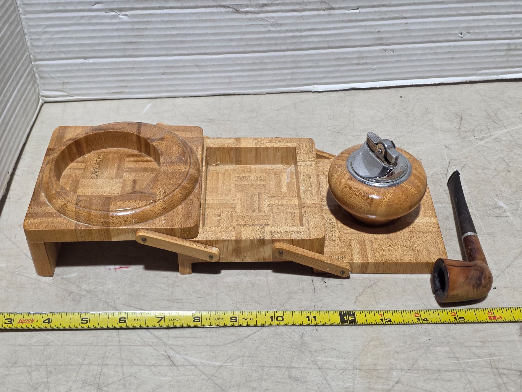 Wood ashtray, lighter and pipe