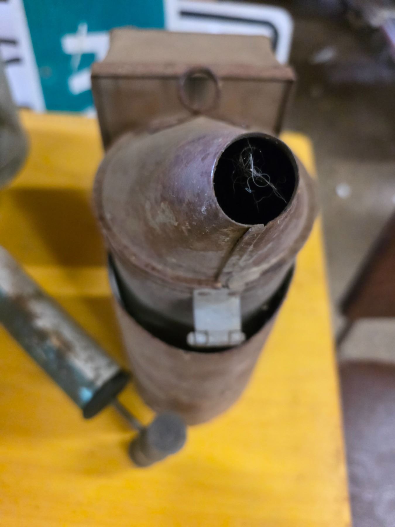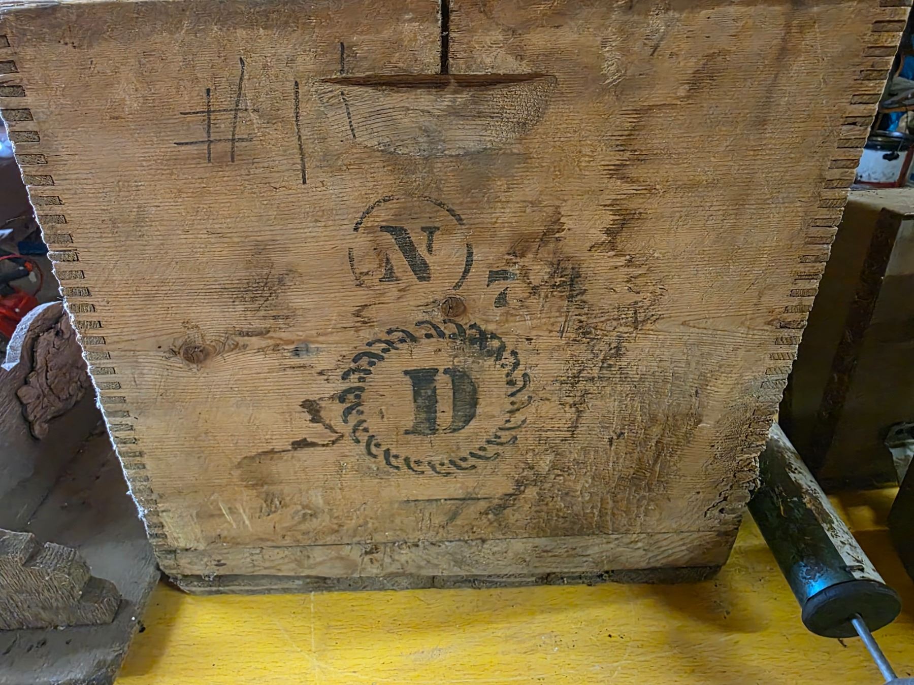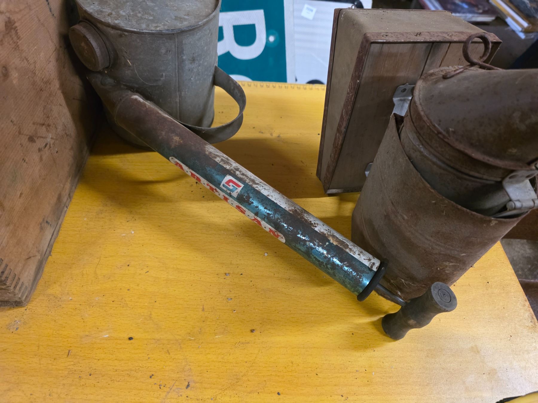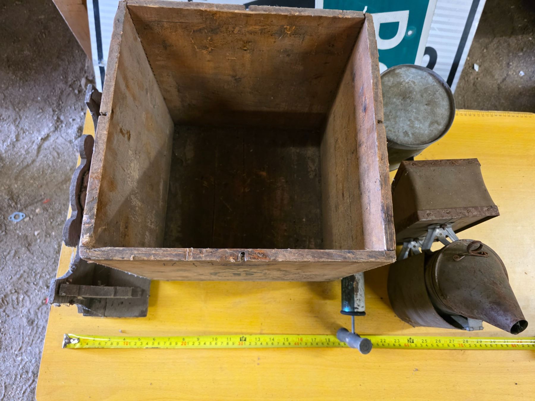 Wood crate, bee smoker, sprayer, shelf